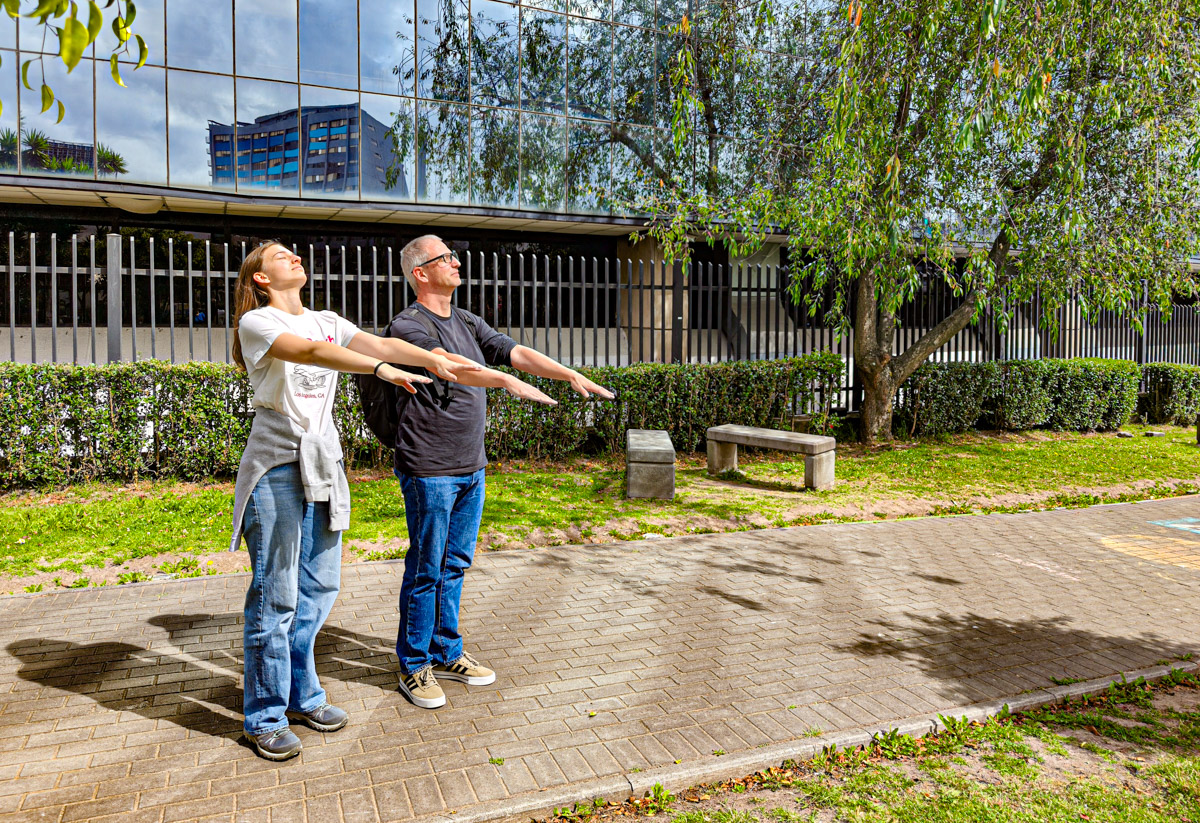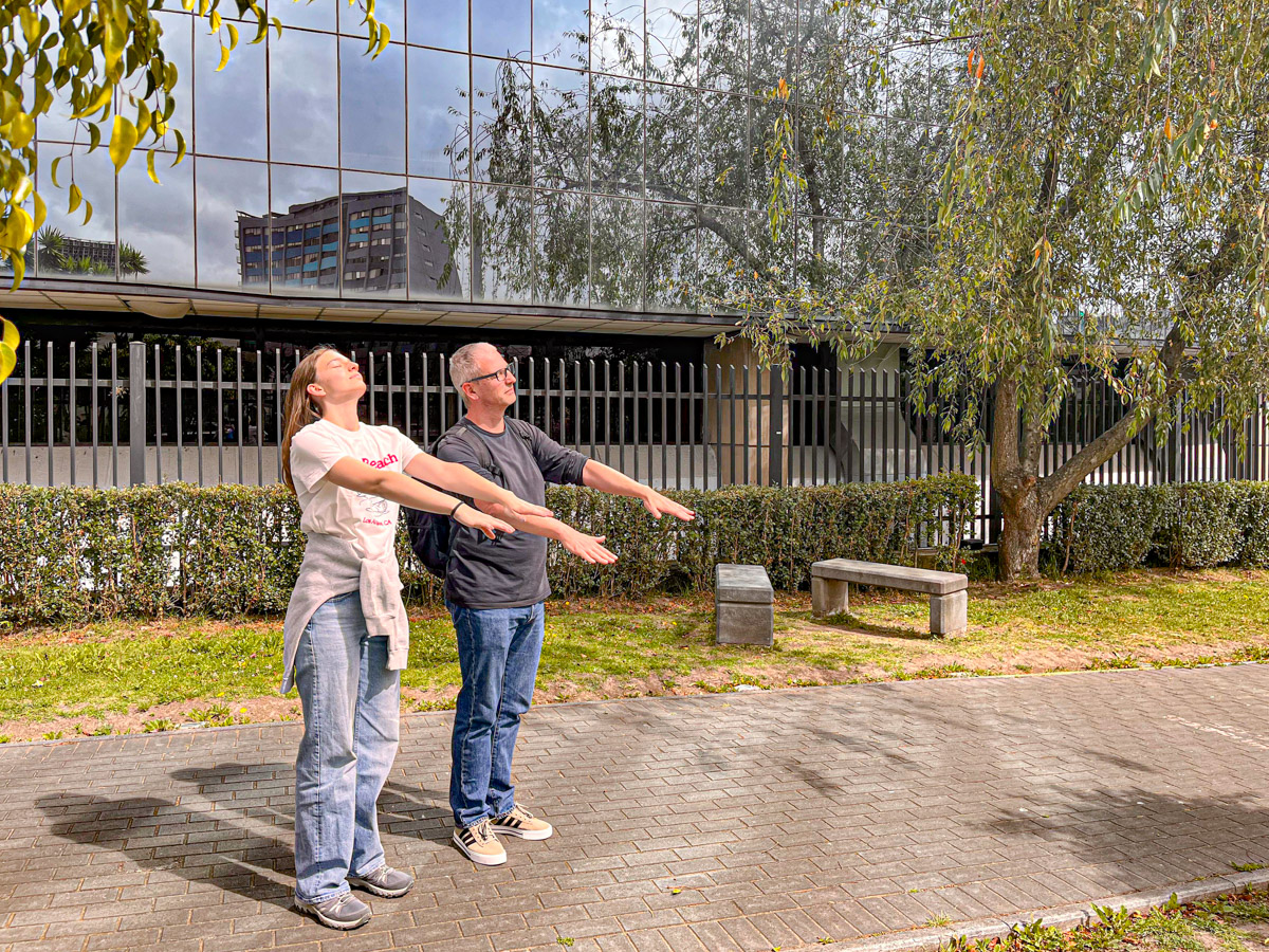 We zijn iets te vroeg maar kunnen wel al naar binnen. Het is een beetje vreemd om in een museum gewapend en gemaskerd veiligheidspersoneel te zien in plaats van onthaalmedewerkers maar we worden er al snel aan gewend. Ze dienen niet alleen om de topstukken te bewaken maar ook om de toeristen een veiliger gevoel te geven. We worden apart genomen en er wordt ons vriendelijk uitgelegd dat we 7 minuten te vroeg zijn. We moeten onverbiddelijk weer naar buiten. In de tuin voor het museum zijn klasjes op schoolreis liedjes aan het zingen. De kinderen bekijken ons vol aandacht. Ben en Julia vinden dat ze uit de toon vallen en lassen een korte bronzeersessie in.