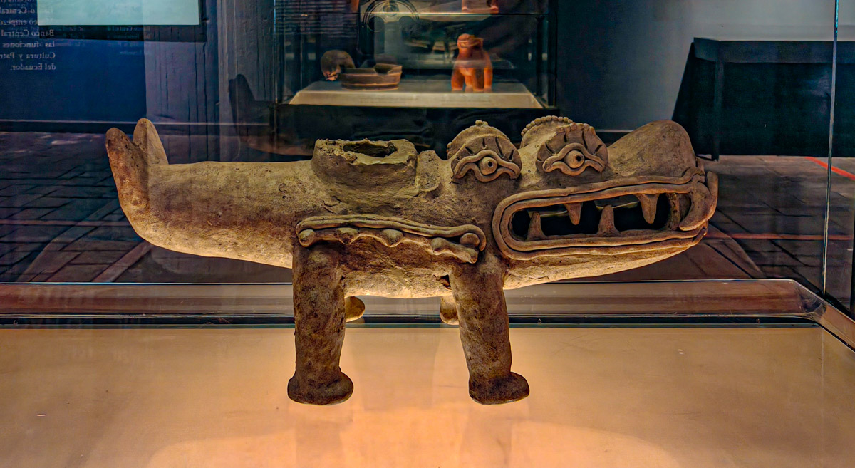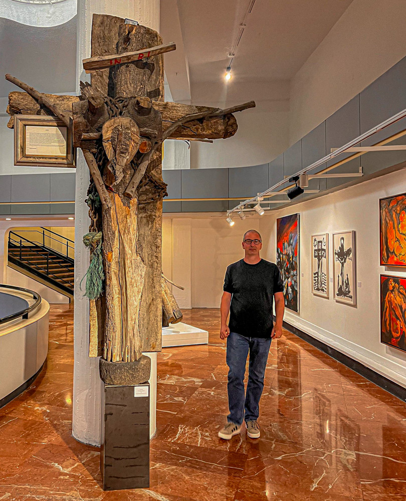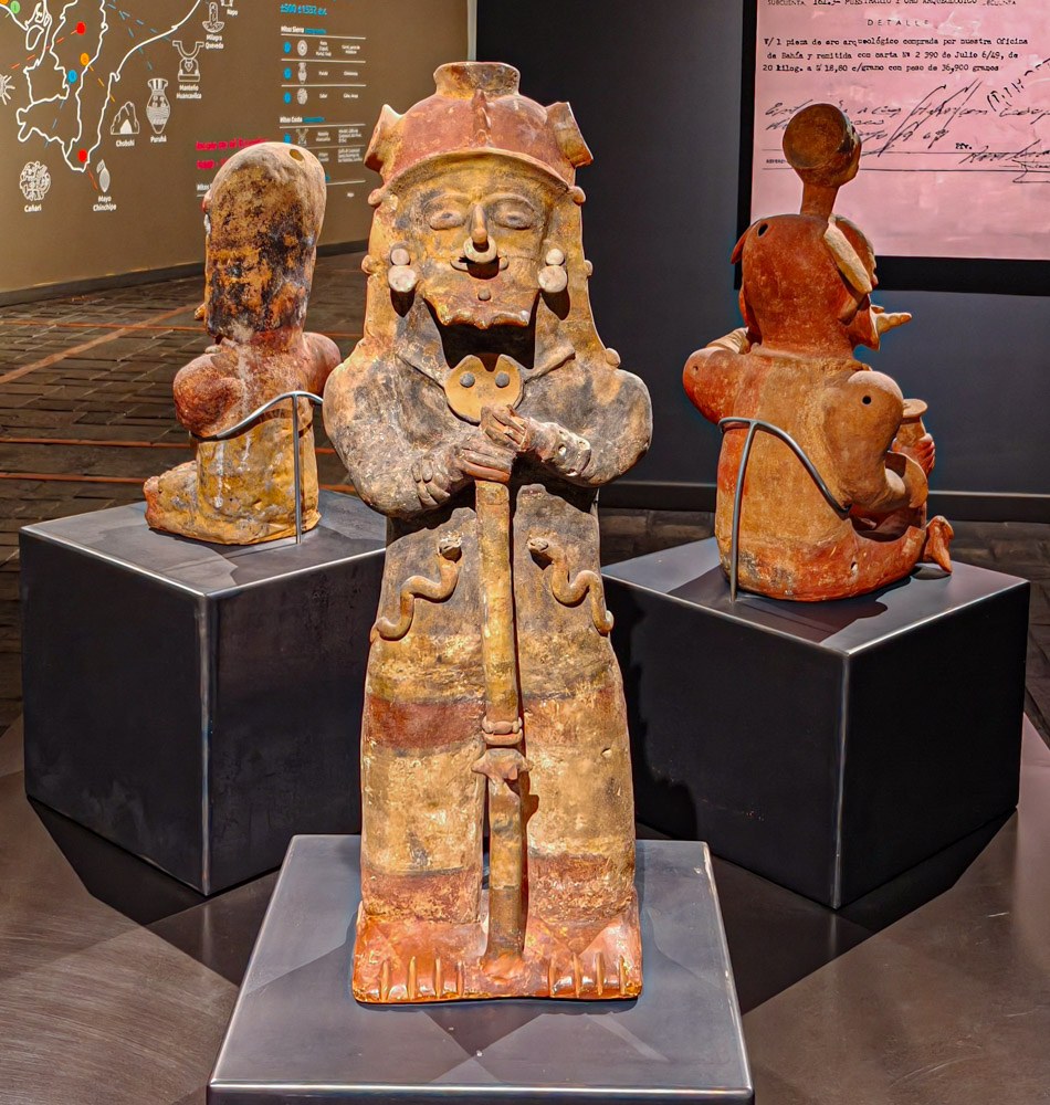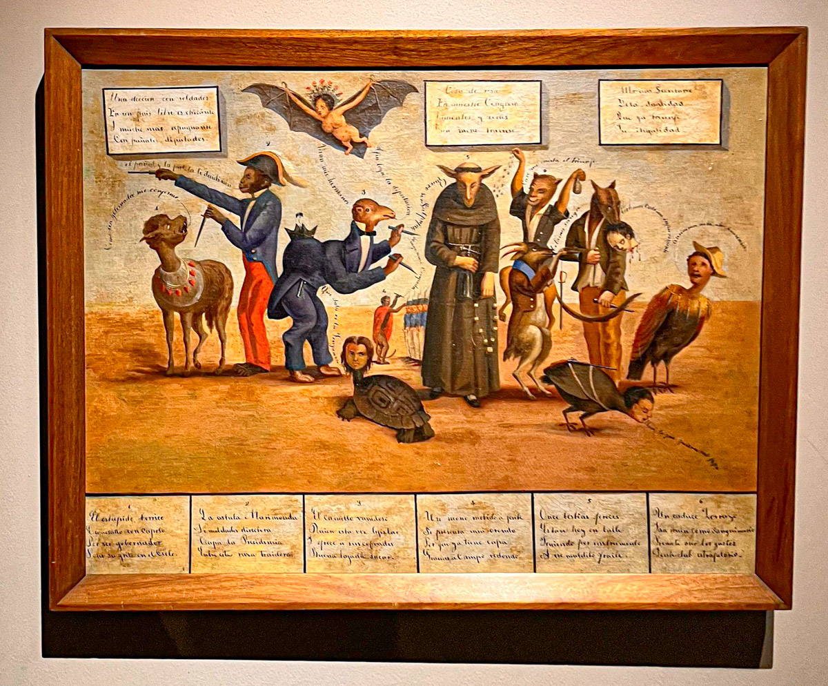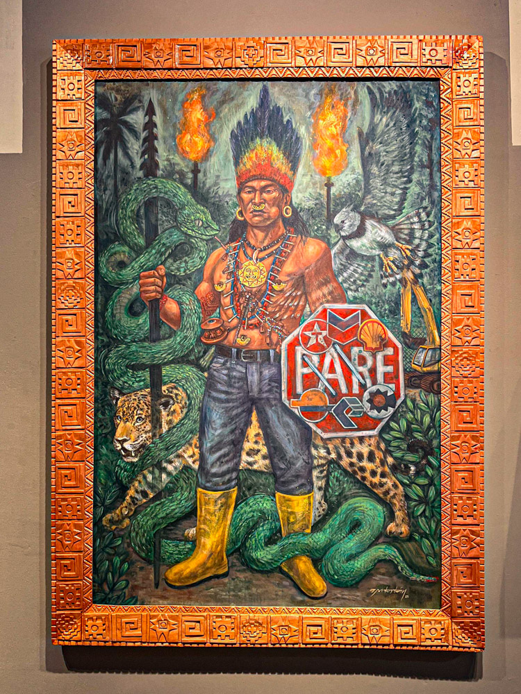 Om 10 uur stipt mogen we weer naar binnen. Het museum is niet zo heel groot. De stad heeft een lange historie maar heel veel is er niet bewaard gebleven, helaas. Alles is wel mooi en overzichtelijk in beeld gebracht. Mijn Spaans komt alweer van pas maar is duidelijk niet voldoende om alles te begrijpen. We zien pijlpunten uit het stenen tijdperk en kunstvoorwerpen uit alle tijdvakken tot en met de kolonisatie. Er is ook een opmerkelijke zaal met hedendaagse kunstenaars, die de geschiedenis van hun volk vermengen met 20ste eeuwse kunststromingen en aandacht vragen voor omstandigheden van indigena’s en de natuur in hun land.