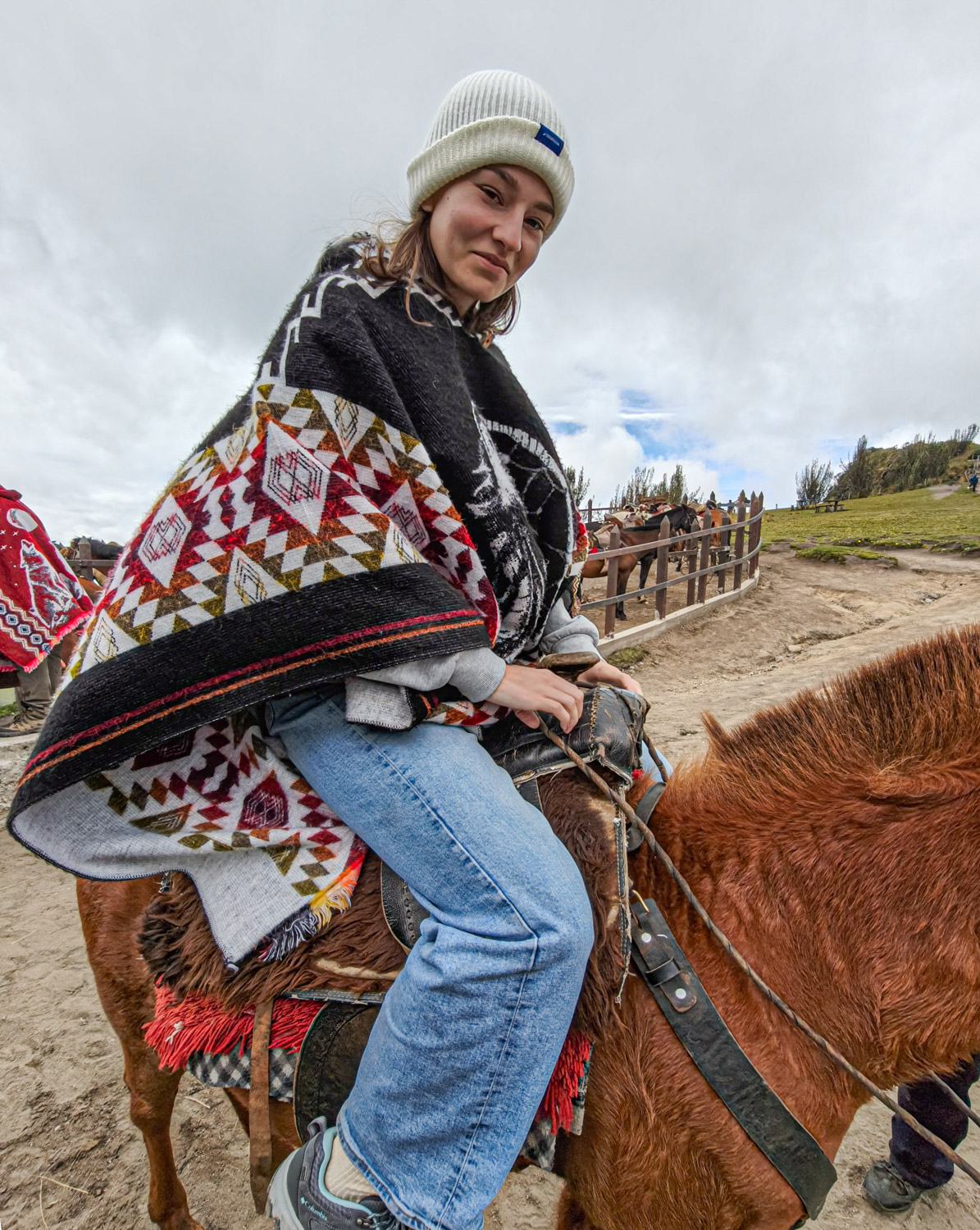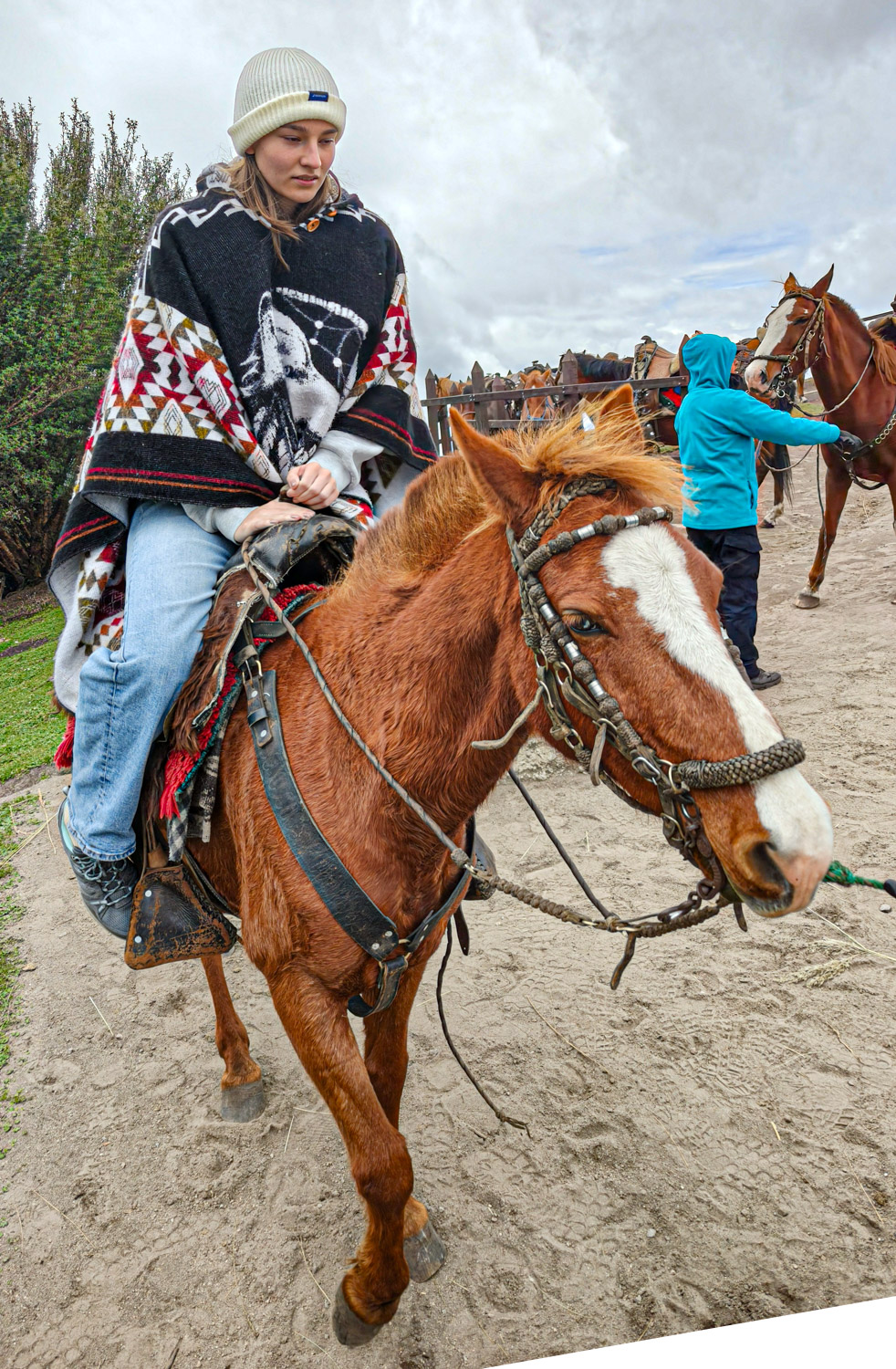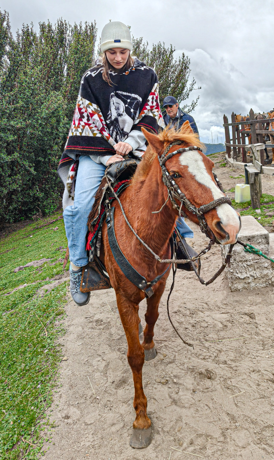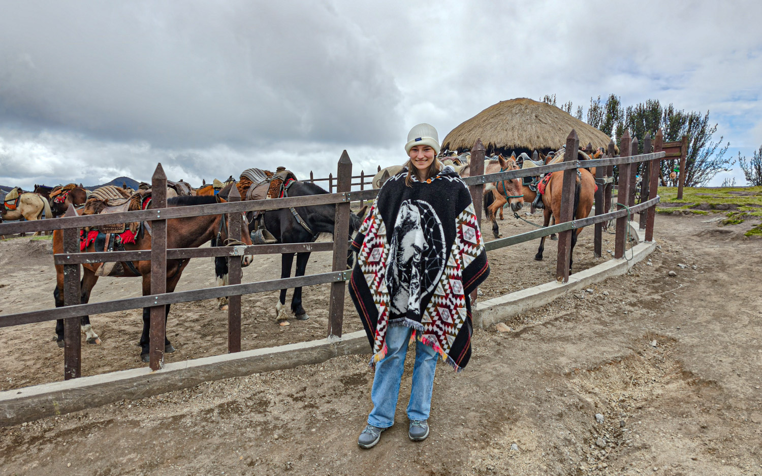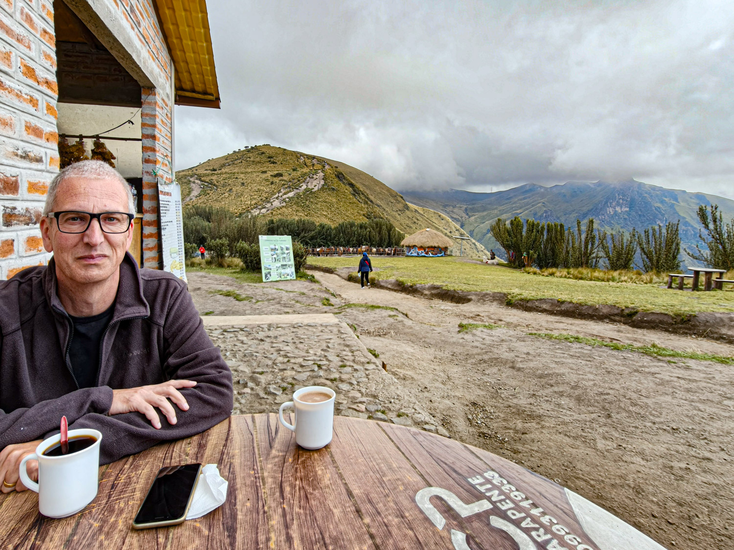 Wat verderop zijn paarden. Voor een paar dollar krijg je een poncho en mag je een ritje maken. Julia ziet het als een once in a lifetime experience en gaat ervoor. Wie kan er zeggen dat ze bovenop een vulkaan hebben paardgereden ? Ondertussen gaan mams en paps een koffietje drinken. De cafetaria heeft een vloer van aangestampte aarde en een hele bureaucratie. Eerst bestelling plaatsen en betalen, daarna krijg je een bonnetje. Je zet twee stappen naar links en kikt recht in de “keuken”. Een donker gat waar een onduidelijk aantal mensen aan het bekvechten zijn. Je geeft je bonnetje. Twee koffie ? Die worden met een pollepel uit een grote kom geschept. Melk ? Is er niet. We gaan op het “terras” zitten. Wat verder zit er nog een groep toeristen. We vermoeden Canadezen. Na een halfuurtje is Julia terug, een geweldige ervaring rijker. Ze werd namelijk helemaal alleen gelaten en had vrijheid te gaan waar ze wilde met het paard.