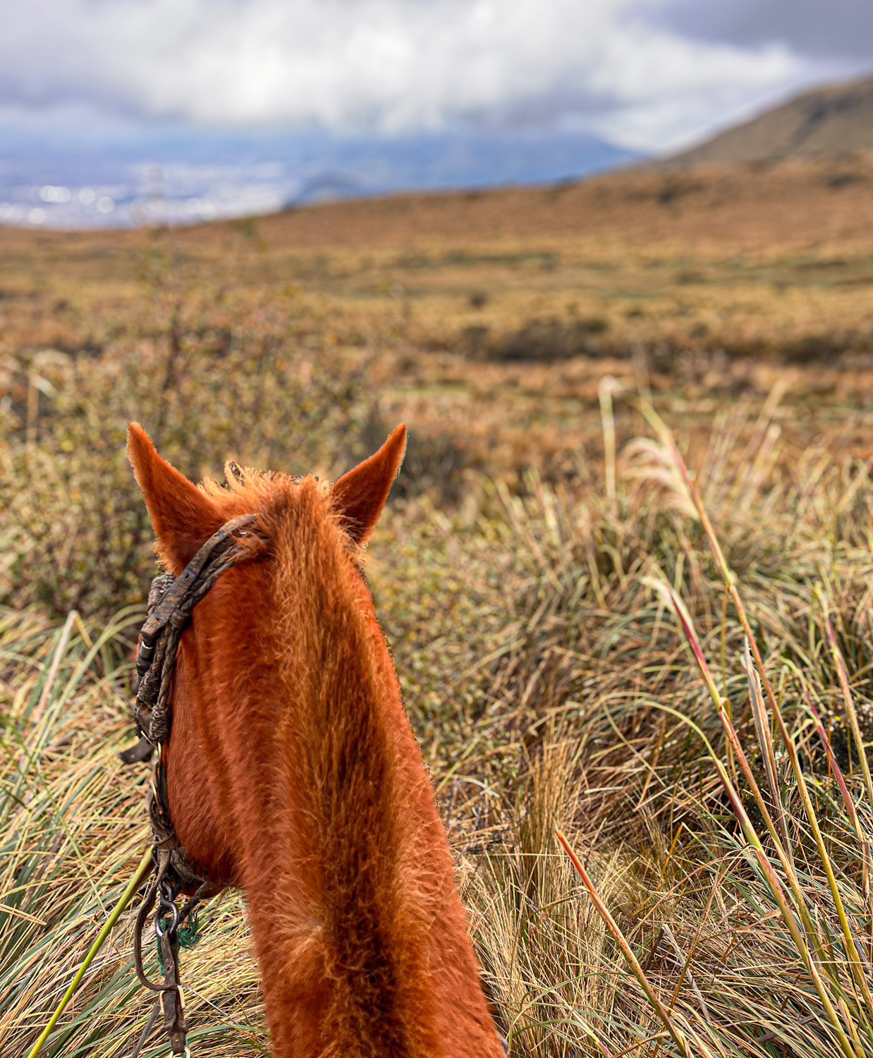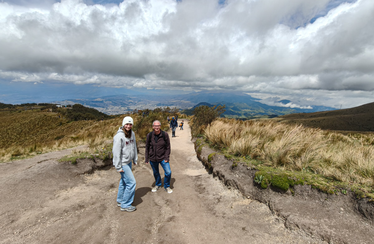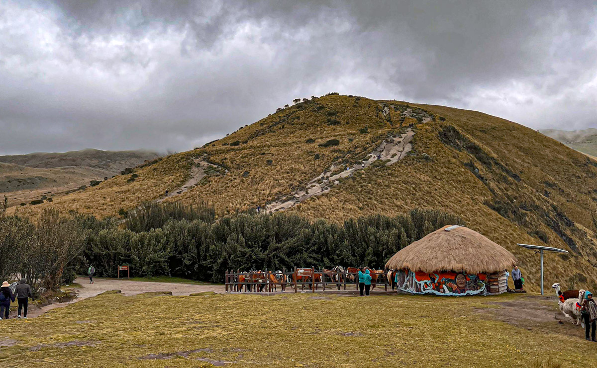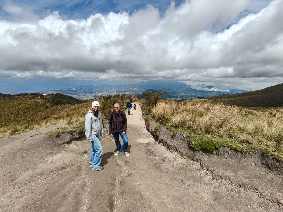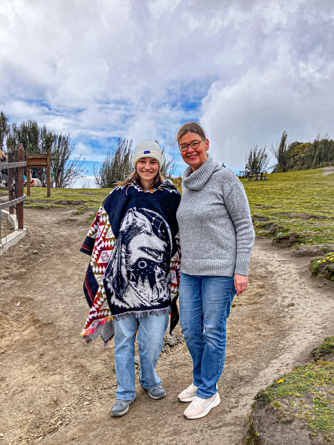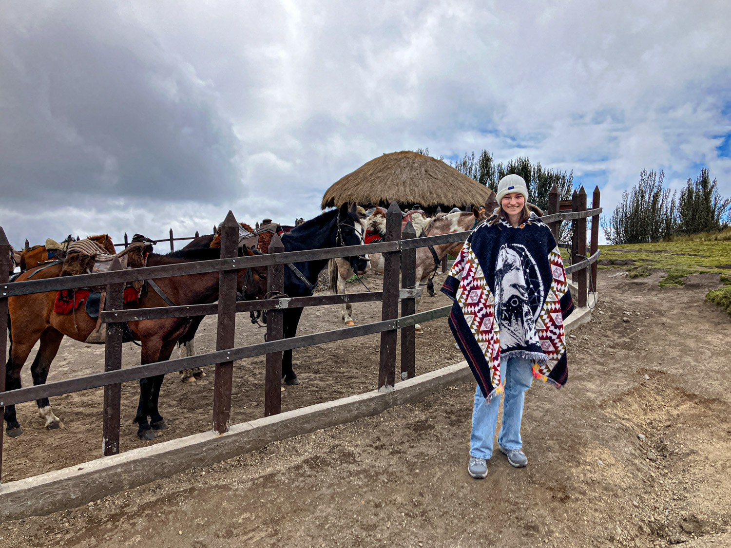 Wat verderop zijn paarden. Voor een paar dollar krijg je een poncho en mag je een ritje maken. Julia ziet het als een once in a lifetime experience en gaat ervoor. Wie kan er zeggen dat ze bovenop een vulkaan hebben paardgereden ? Ondertussen gaan mams en paps een koffietje drinken. De cafetaria heeft een vloer van aangestampte aarde en een hele bureaucratie. Eerst bestelling plaatsen en betalen, daarna krijg je een bonnetje. Je zet twee stappen naar links en kikt recht in de “keuken”. Een donker gat waar een onduidelijk aantal mensen aan het bekvechten zijn. Je geeft je bonnetje. Twee koffie ? Die worden met een pollepel uit een grote kom geschept. Melk ? Is er niet. We gaan op het “terras” zitten. Wat verder zit er nog een groep toeristen. We vermoeden Canadezen. Na een halfuurtje is Julia terug, een geweldige ervaring rijker. Ze werd namelijk helemaal alleen gelaten en had vrijheid te gaan waar ze wilde met het paard.