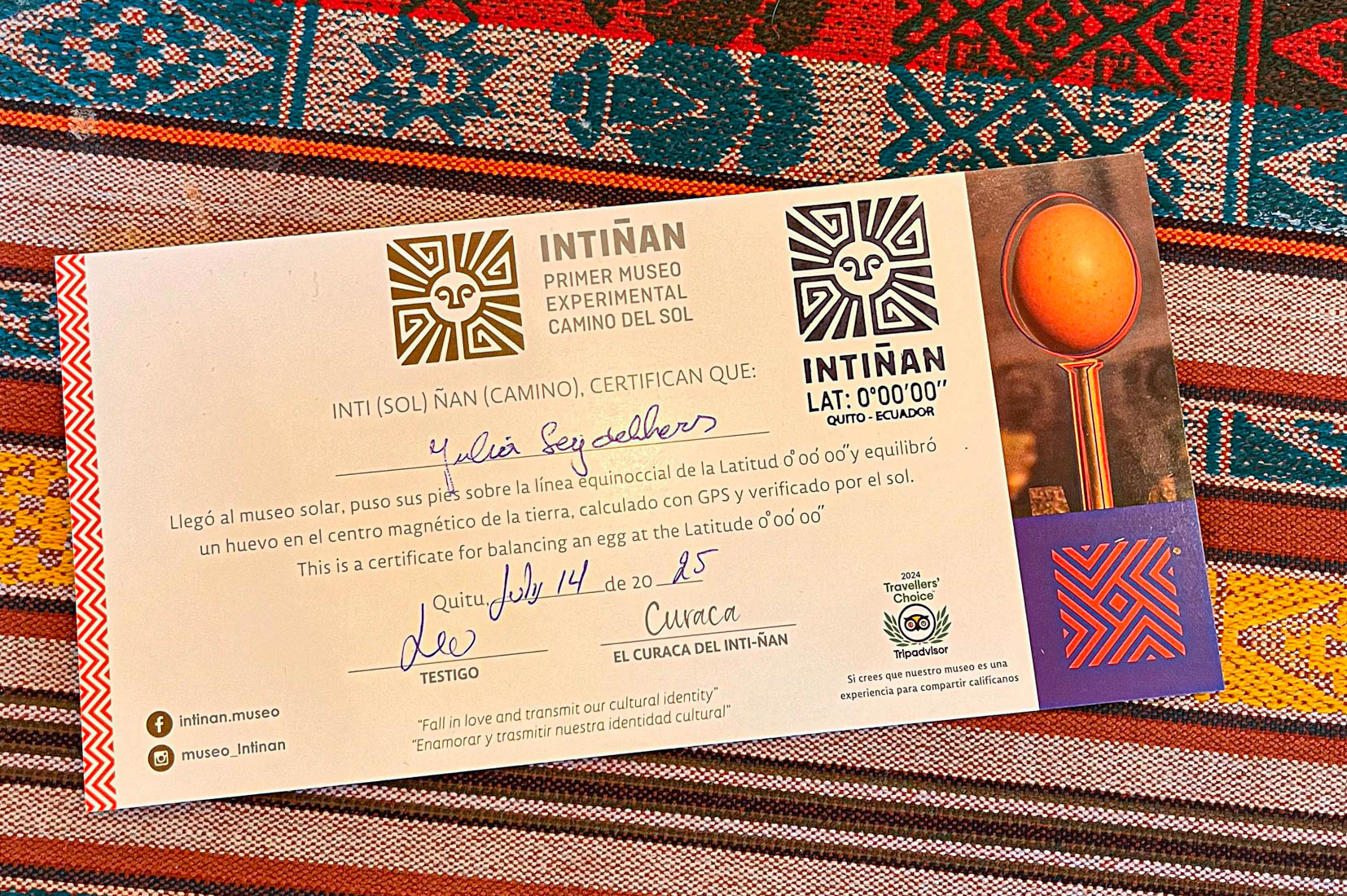 Al gauw hadden alle kinderen hun ei-diploma op zak. Gevraagd naar waarom net deze plaats “mitad” del mundo heet en niet een andere plaats op de evenaar in Colombia, Brazilië of Congo bijvoorbeeld, luidt het antwoord dat dit de hoogst gelegen plaats is die op de evenaar ligt.