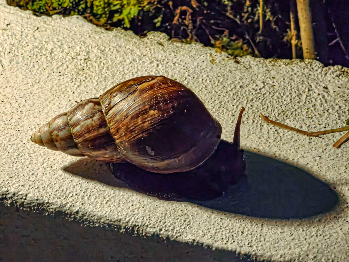 Iemand vindt een reuzegrote huisjesslak in de tuin.