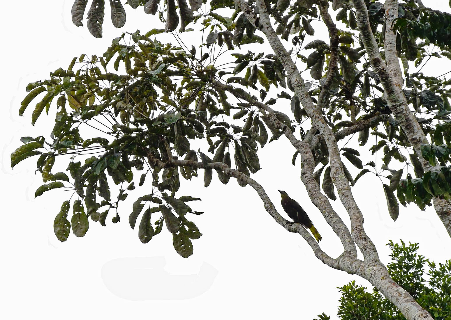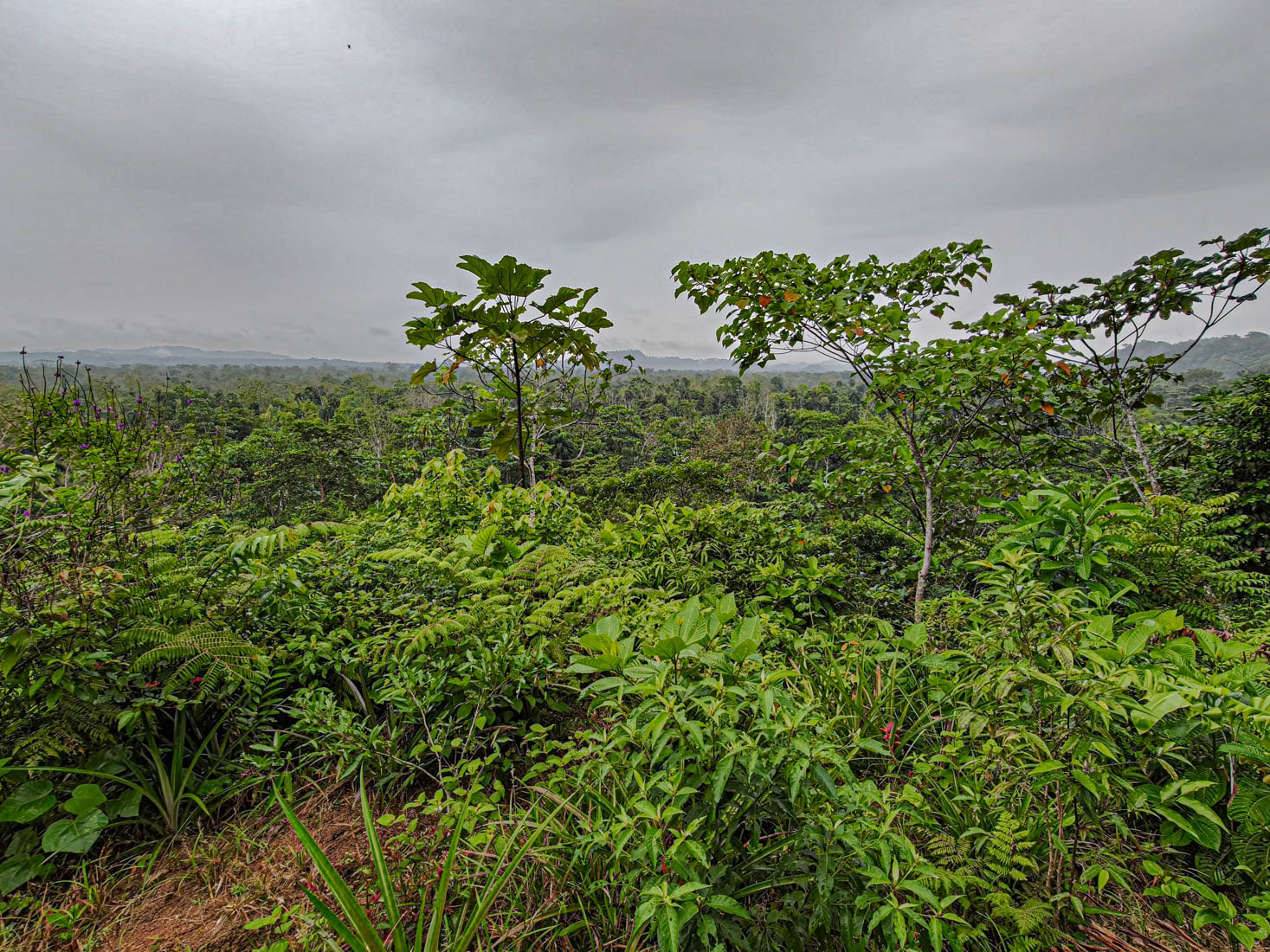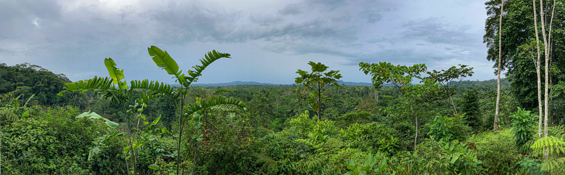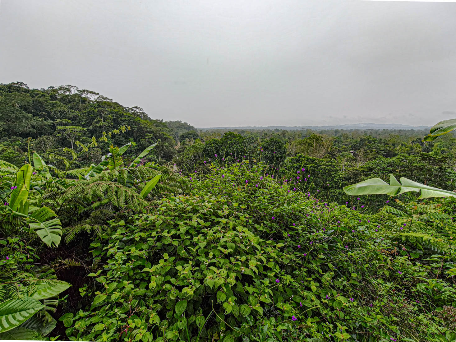 De wandeling eindigt op een hoogtepunt, letterlijk : we hebben een mooi overzicht over het verzopen oerwoud en de ecolodges ertussen.