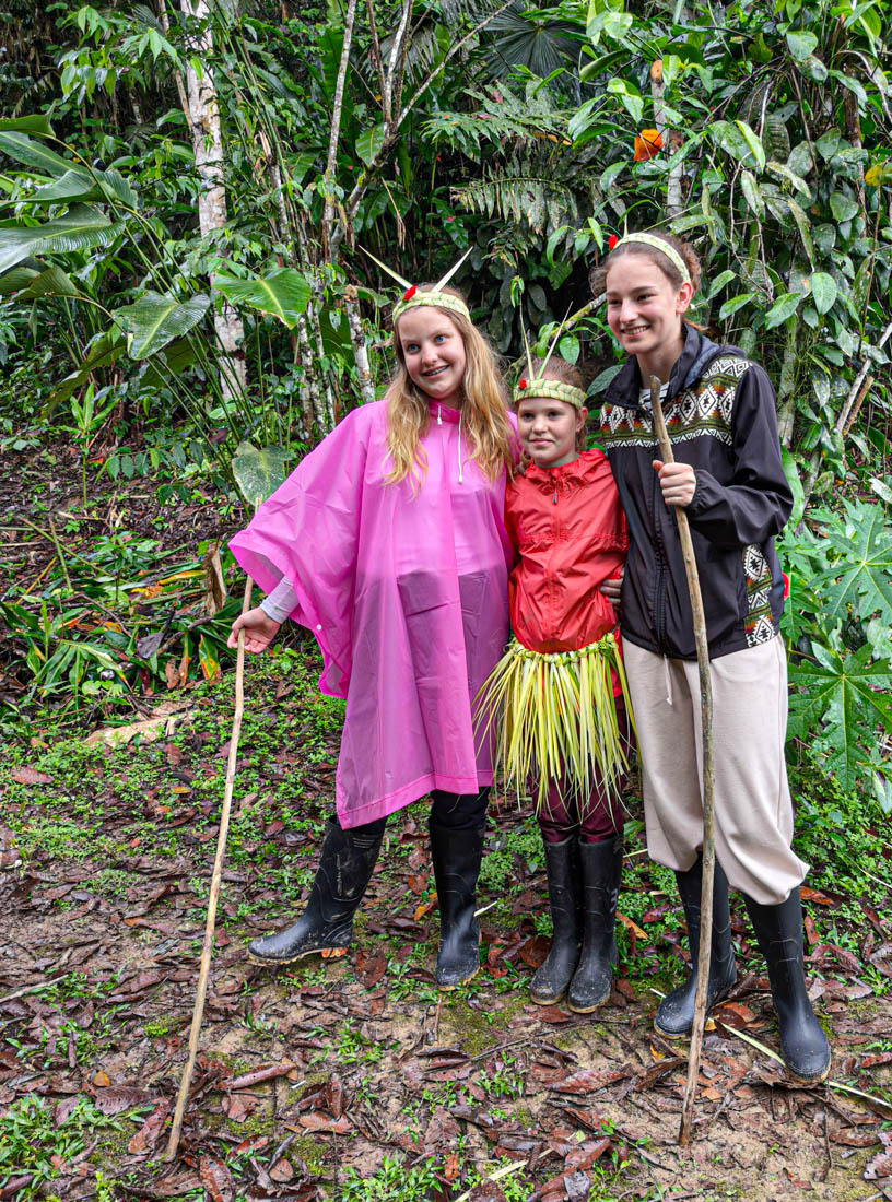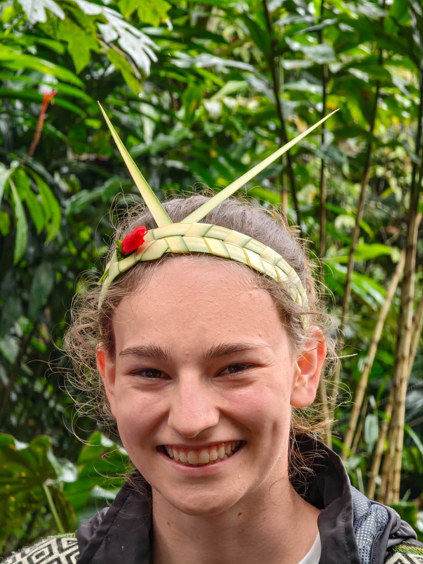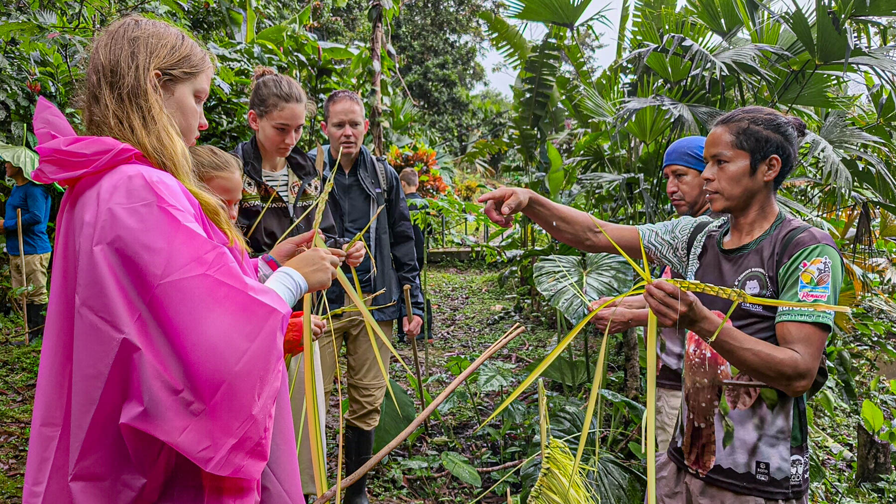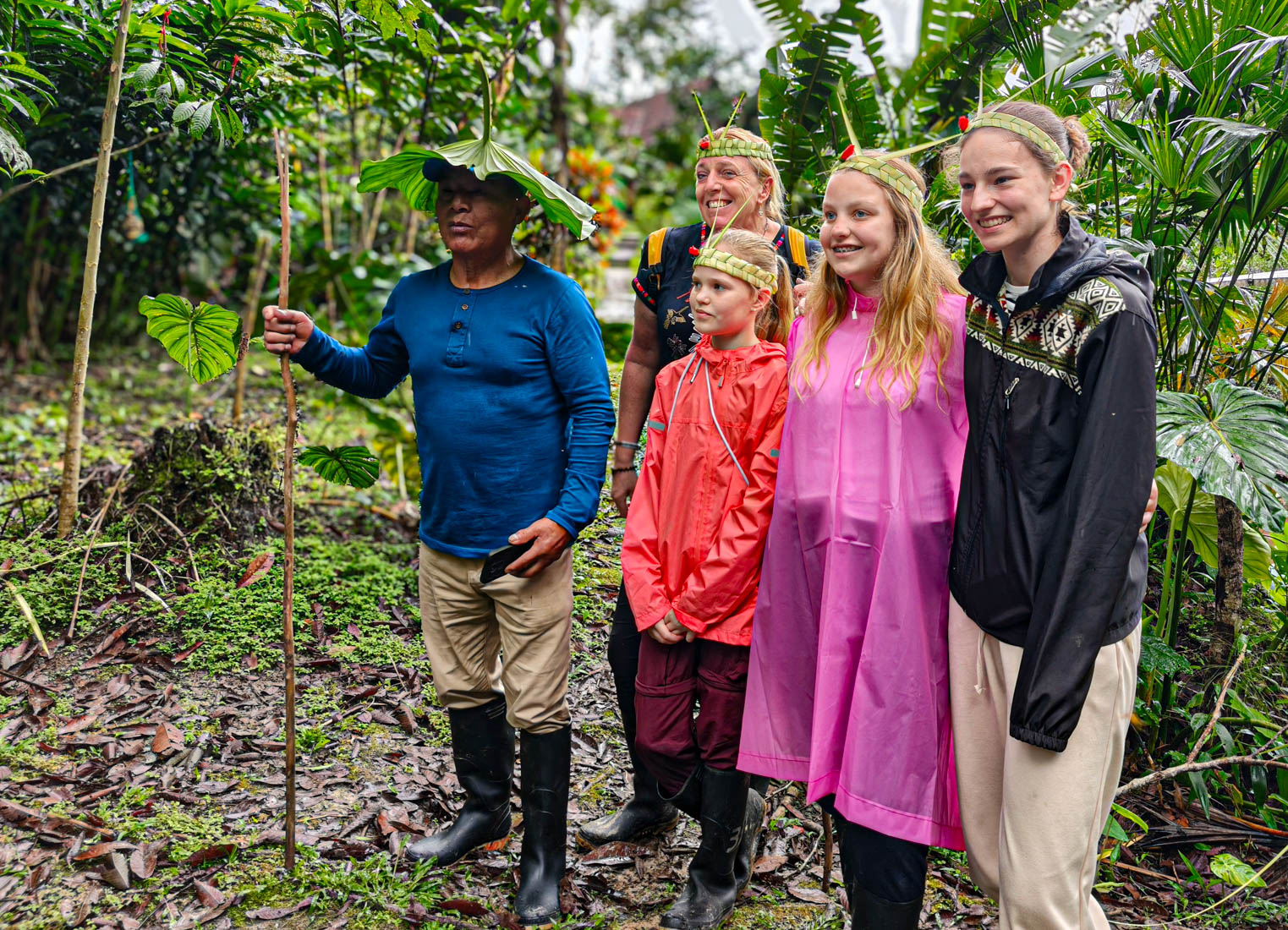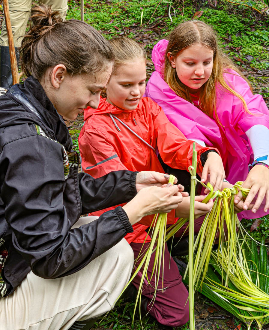 We gaan wandelen in de jungle. Rolando voorop en Fausto en Jose achteraan. Eerst toont Rolando hoe je van riet heel fijne vezels kan maken, en de kinderen mochten daarvan rokjes en kroontjes maken. Later gaan we zien dat van dezelfde vezels ook panamahoeden worden gemaakt. Sommige volwassenen hebben meer oog voor de grote vlinders die rondfladderen.