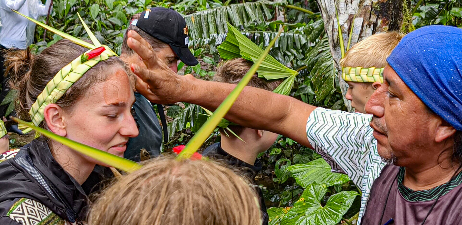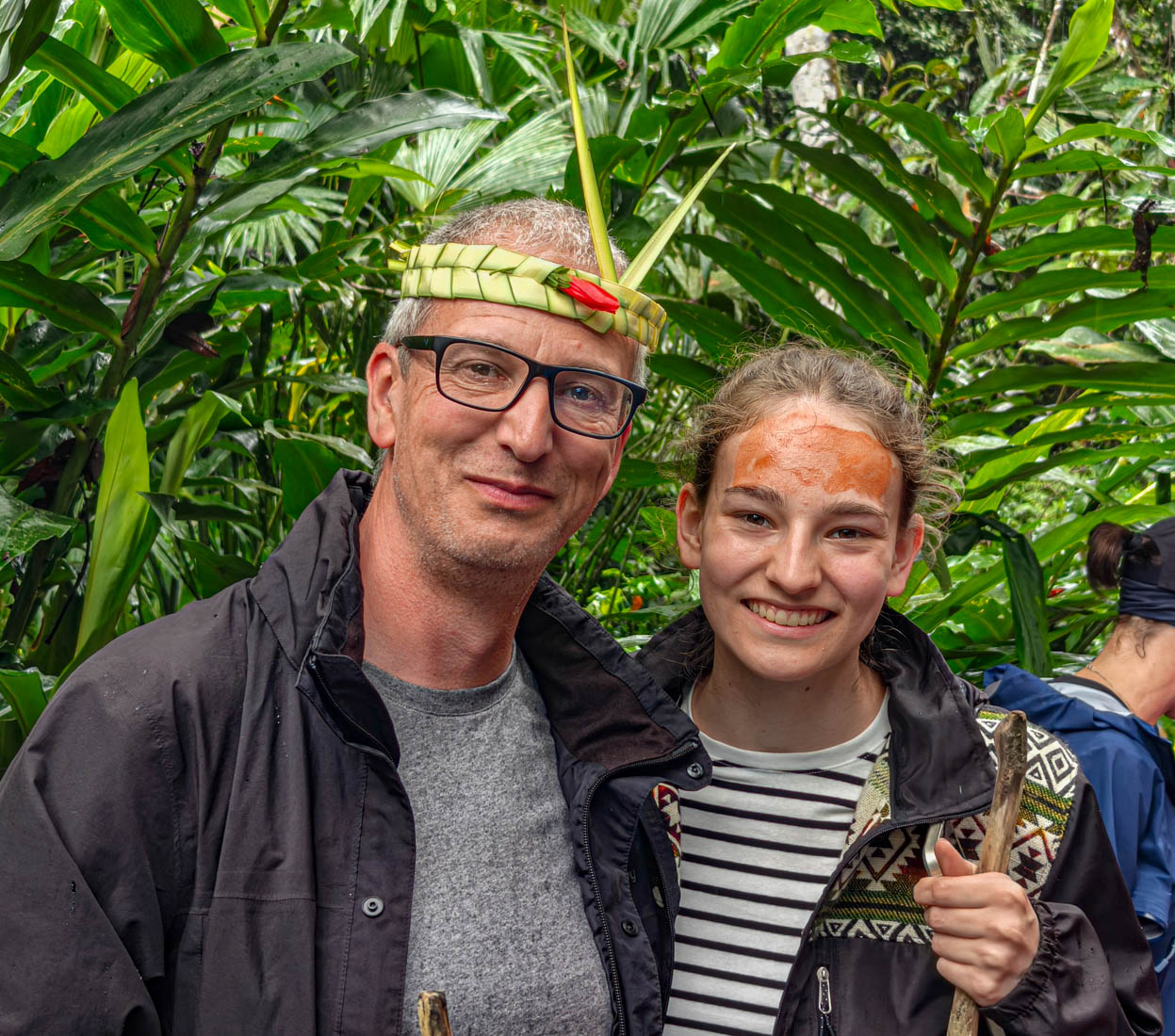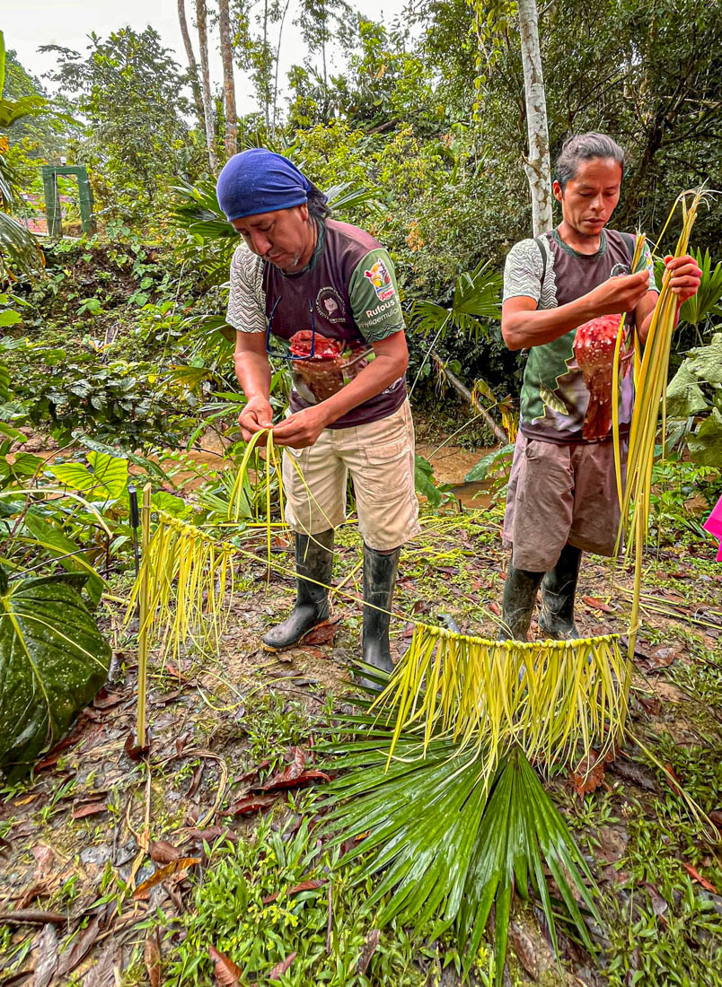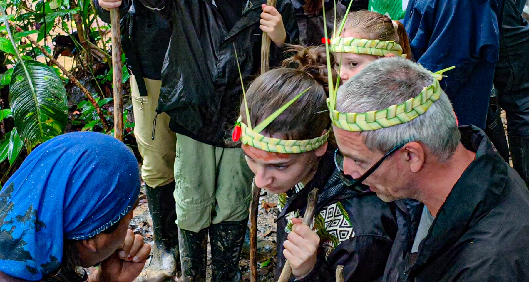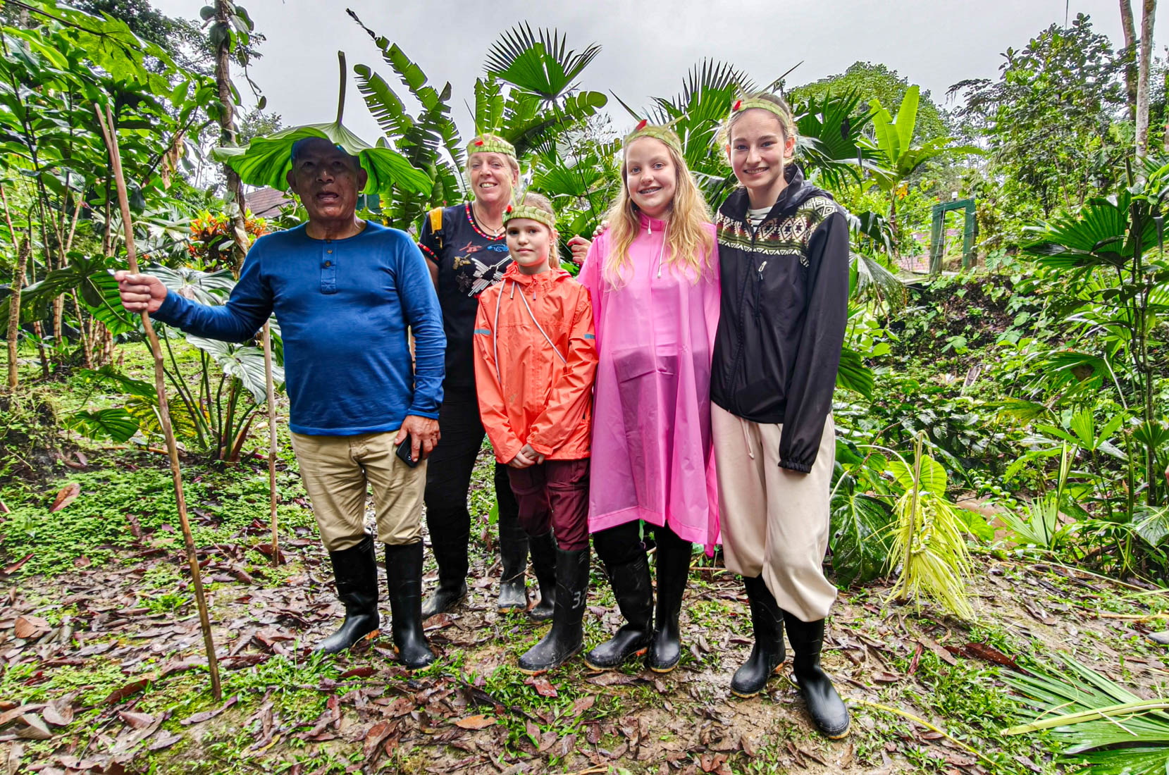 We gaan wandelen in de jungle. Rolando voorop en Fausto en Jose achteraan. Eerst toont Rolando hoe je van riet heel fijne vezels kan maken, en de kinderen mochten daarvan rokjes en kroontjes maken. Later gaan we zien dat van dezelfde vezels ook panamahoeden worden gemaakt. Sommige volwassenen hebben meer oog voor de grote vlinders die rondfladderen.