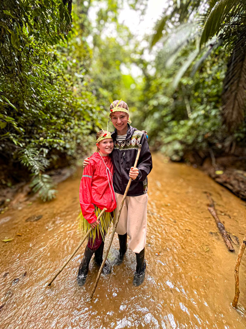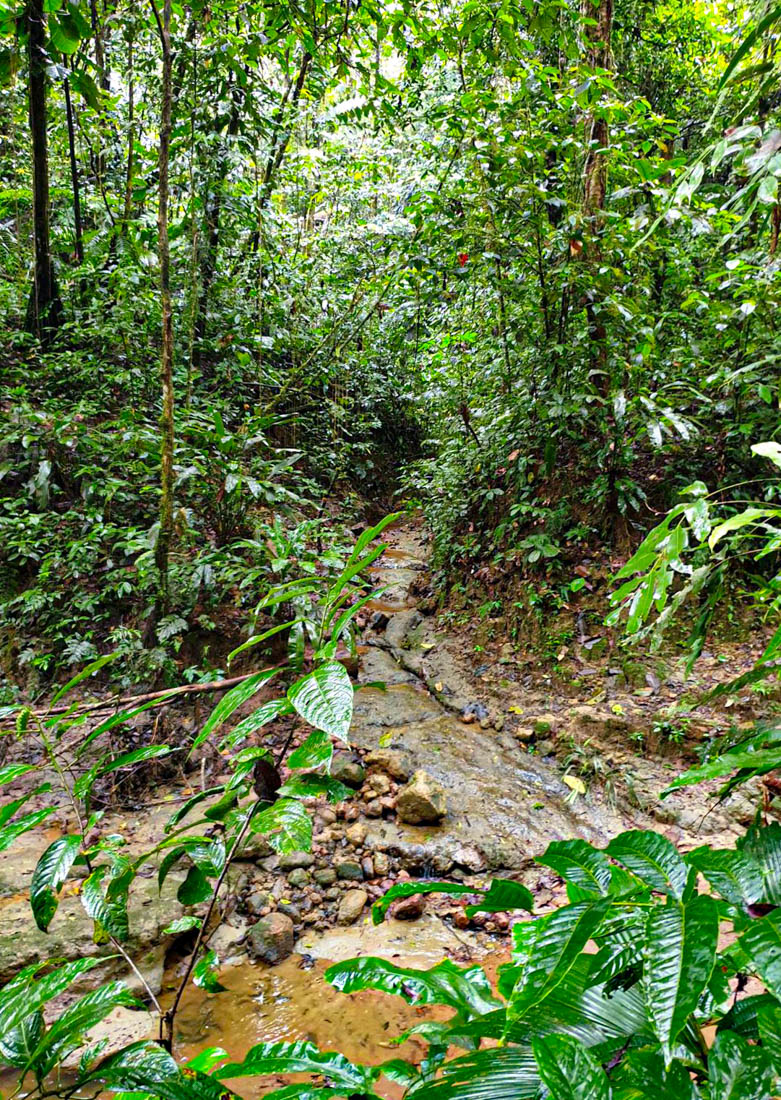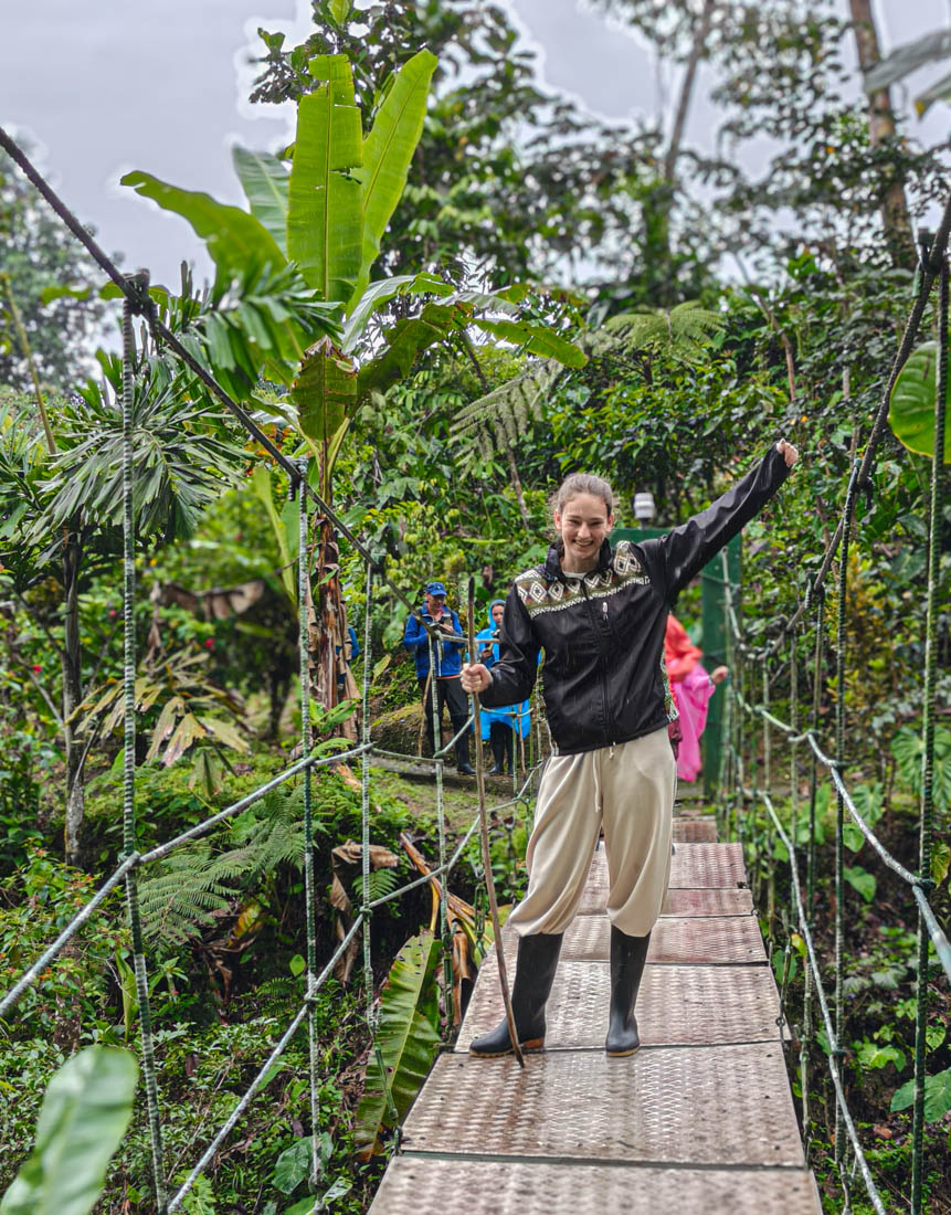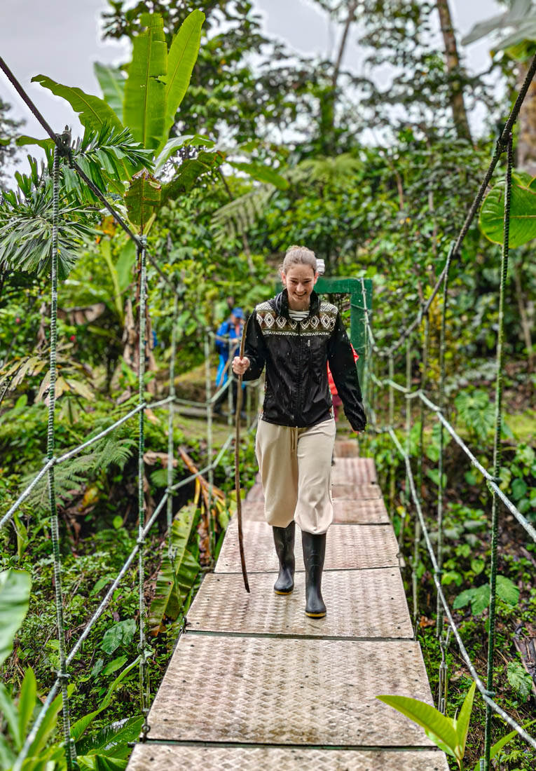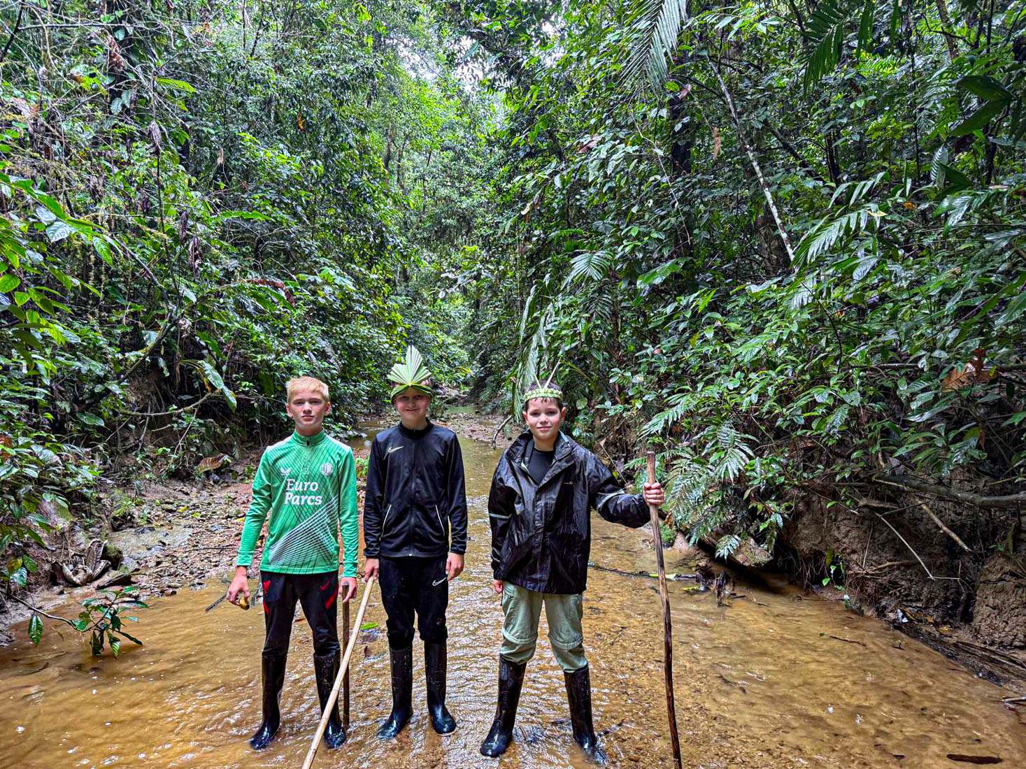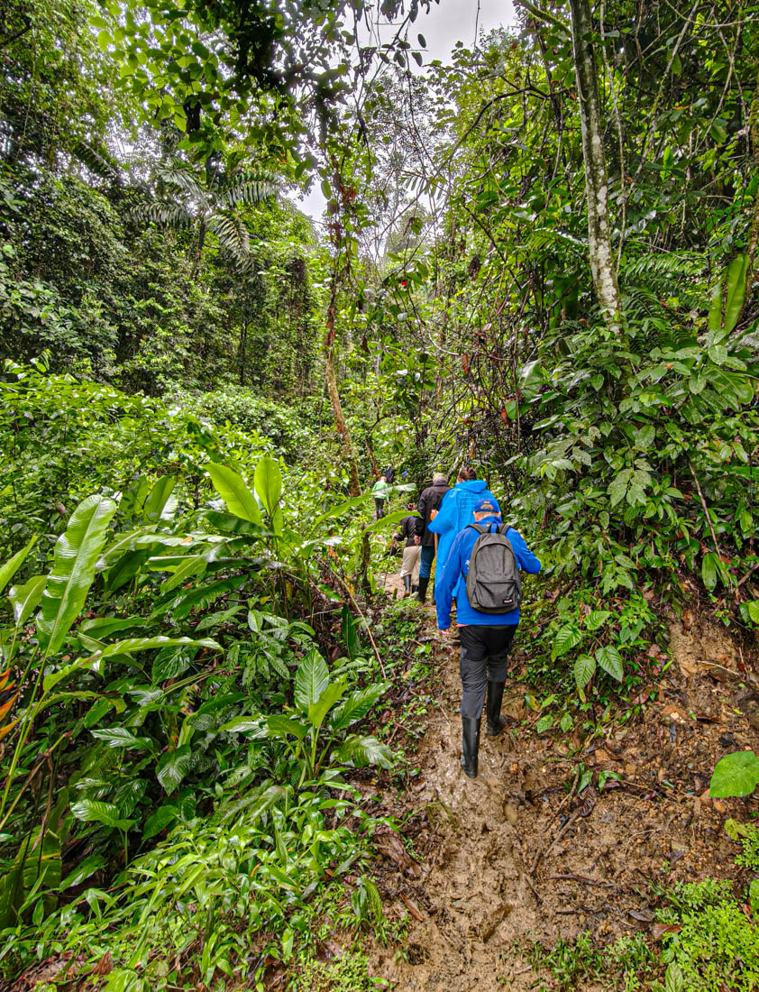 Achteraan de groep hakt Fausto er duchtig op los met zijn machete. We moeten allemaal ons uiterste best doen om niet uit te glijden in de modder of onze enkels te verzwikken op de gladde stenen. Als we door een riviertje moeten waden merk ik dat mijn laars eigenlijk lek is. We klimmen de rivieroever naar boven zonder eigenlijk goed om ons heen te kunnen kijken, wat wel jammer is. De chauffeur loopt achteraan en filmt alles met zijn smartphone. Hij heeft een groot blad van een plant omgekeerd op zijn hoofd gezet.