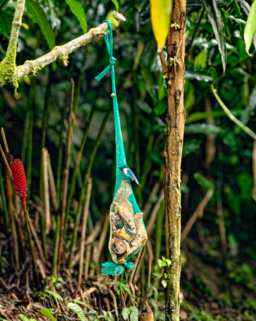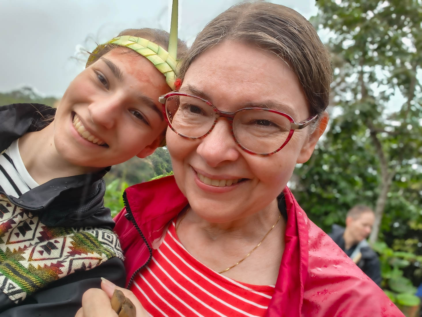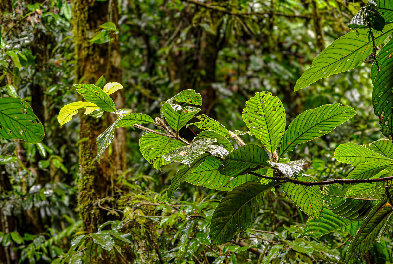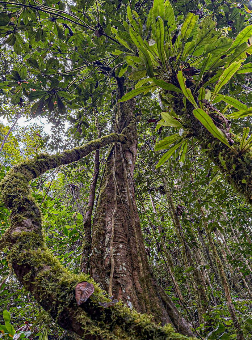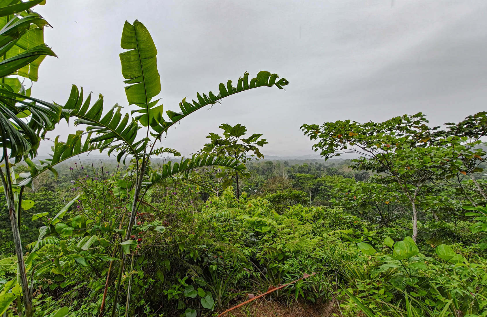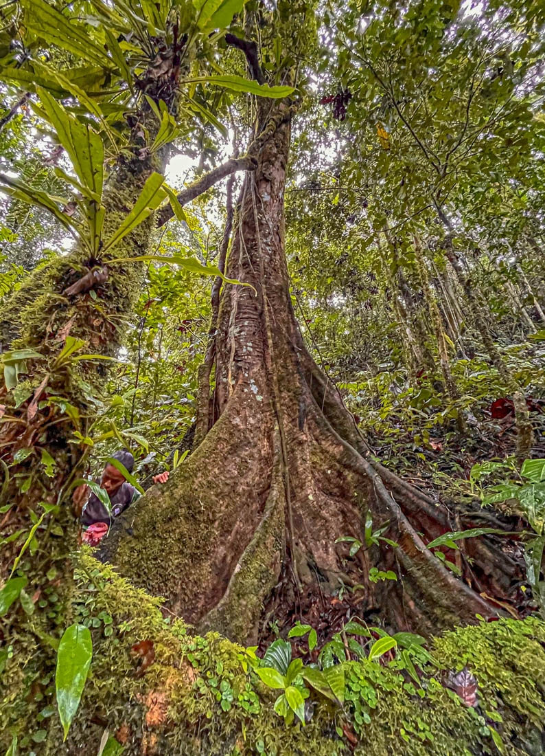 Achteraan de groep hakt Fausto er duchtig op los met zijn machete. We moeten allemaal ons uiterste best doen om niet uit te glijden in de modder of onze enkels te verzwikken op de gladde stenen. Als we door een riviertje moeten waden merk ik dat mijn laars eigenlijk lek is. We klimmen de rivieroever naar boven zonder eigenlijk goed om ons heen te kunnen kijken, wat wel jammer is. De chauffeur loopt achteraan en filmt alles met zijn smartphone. Hij heeft een groot blad van een plant omgekeerd op zijn hoofd gezet.