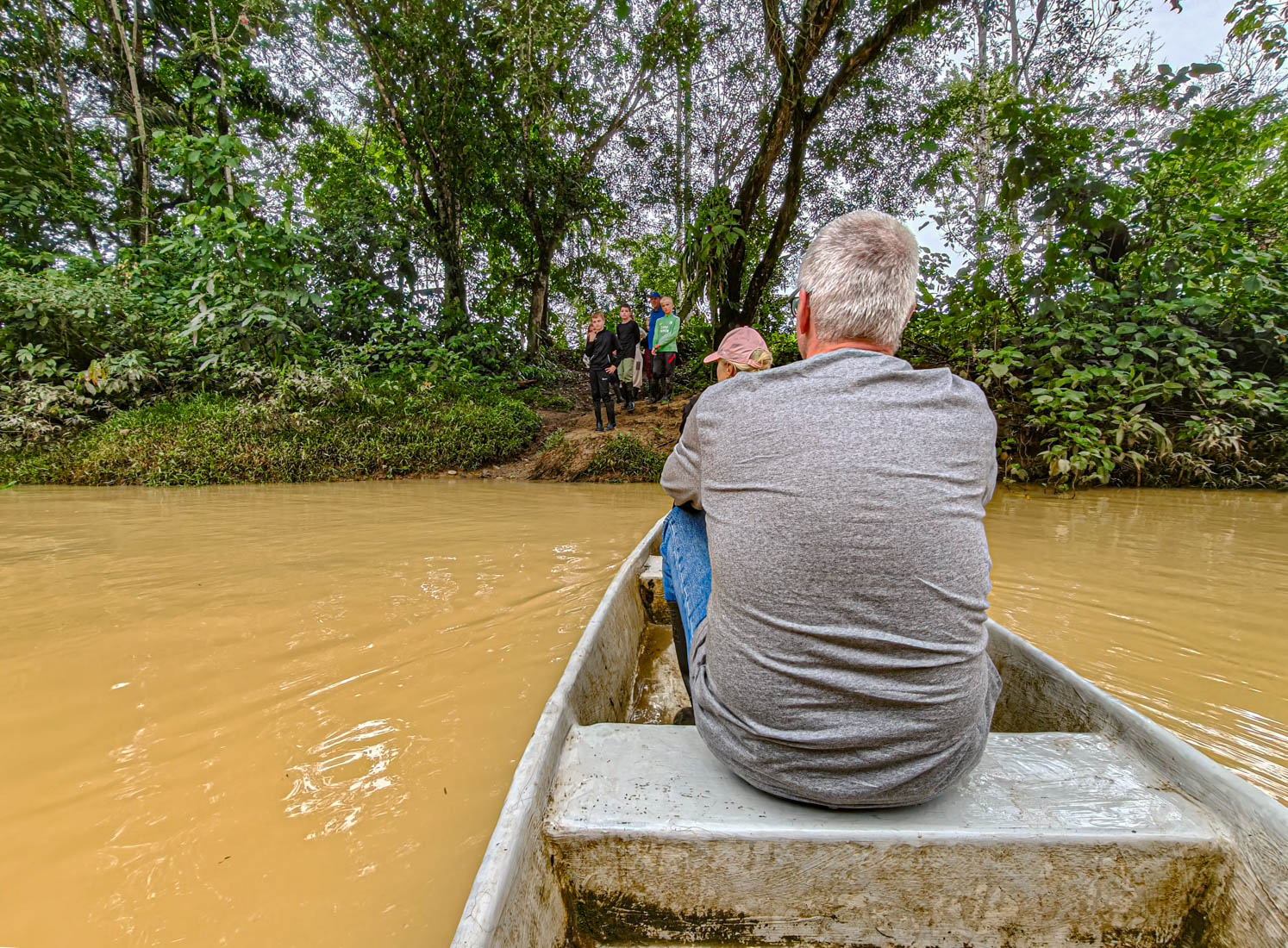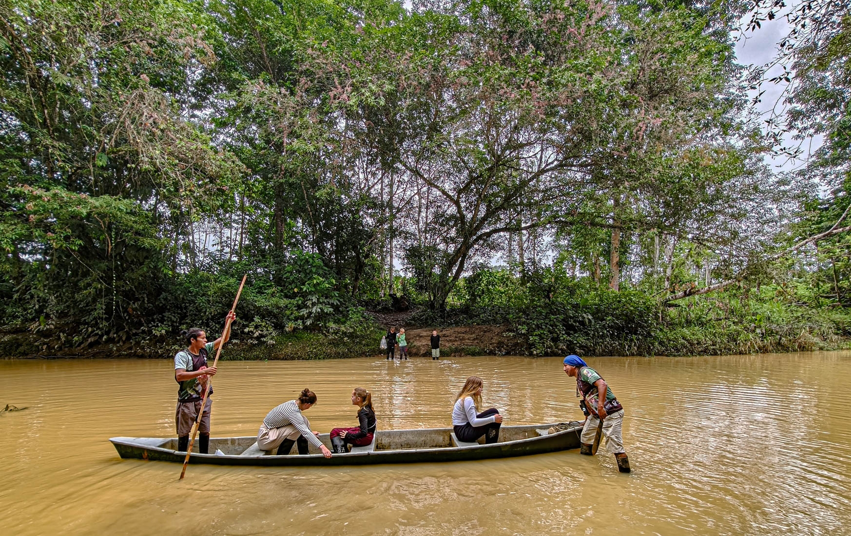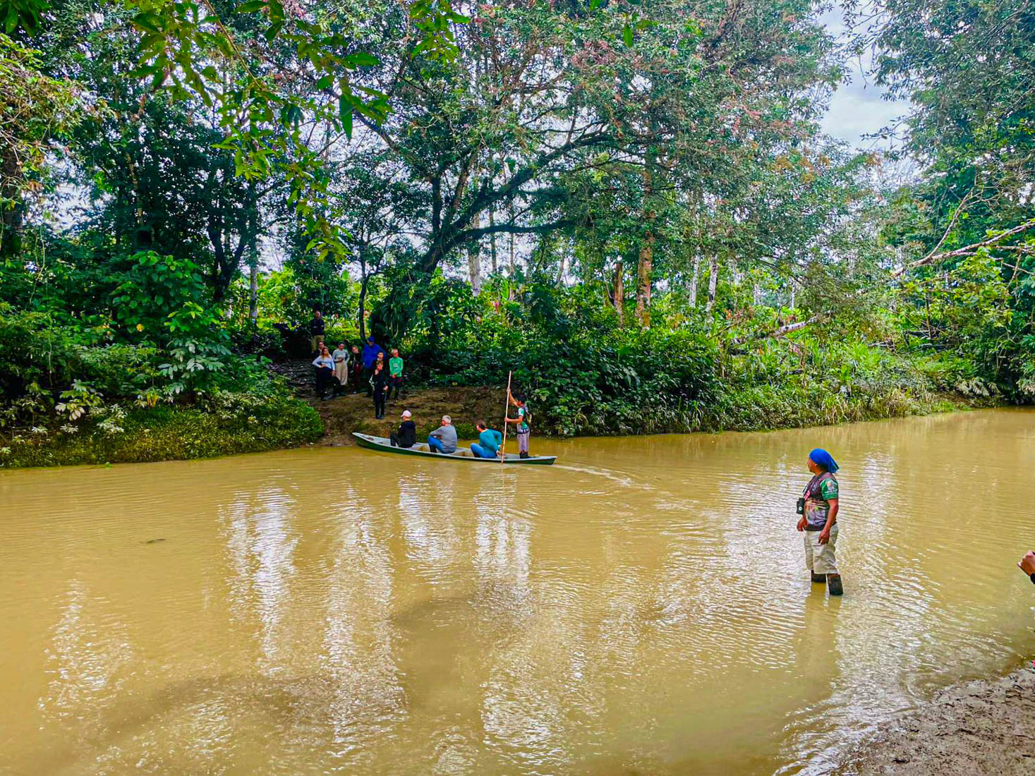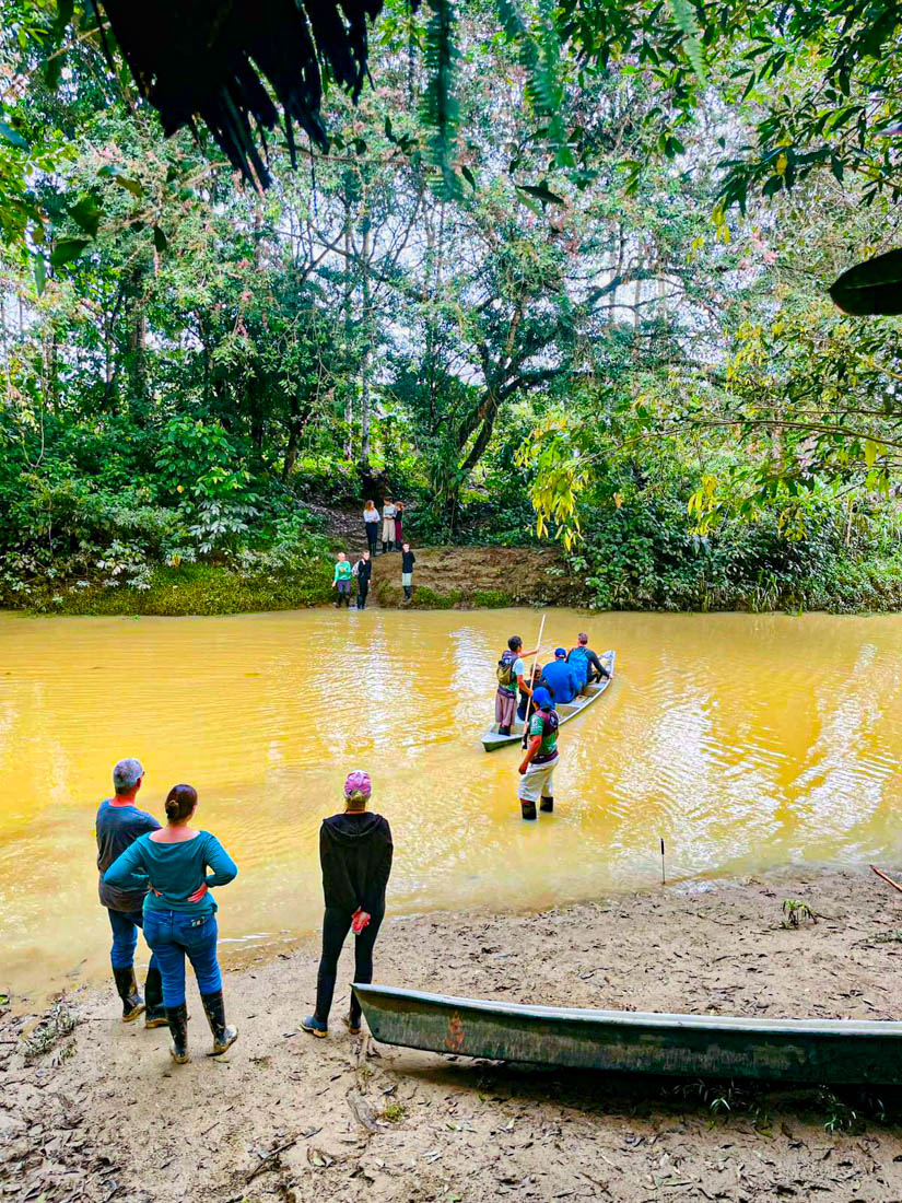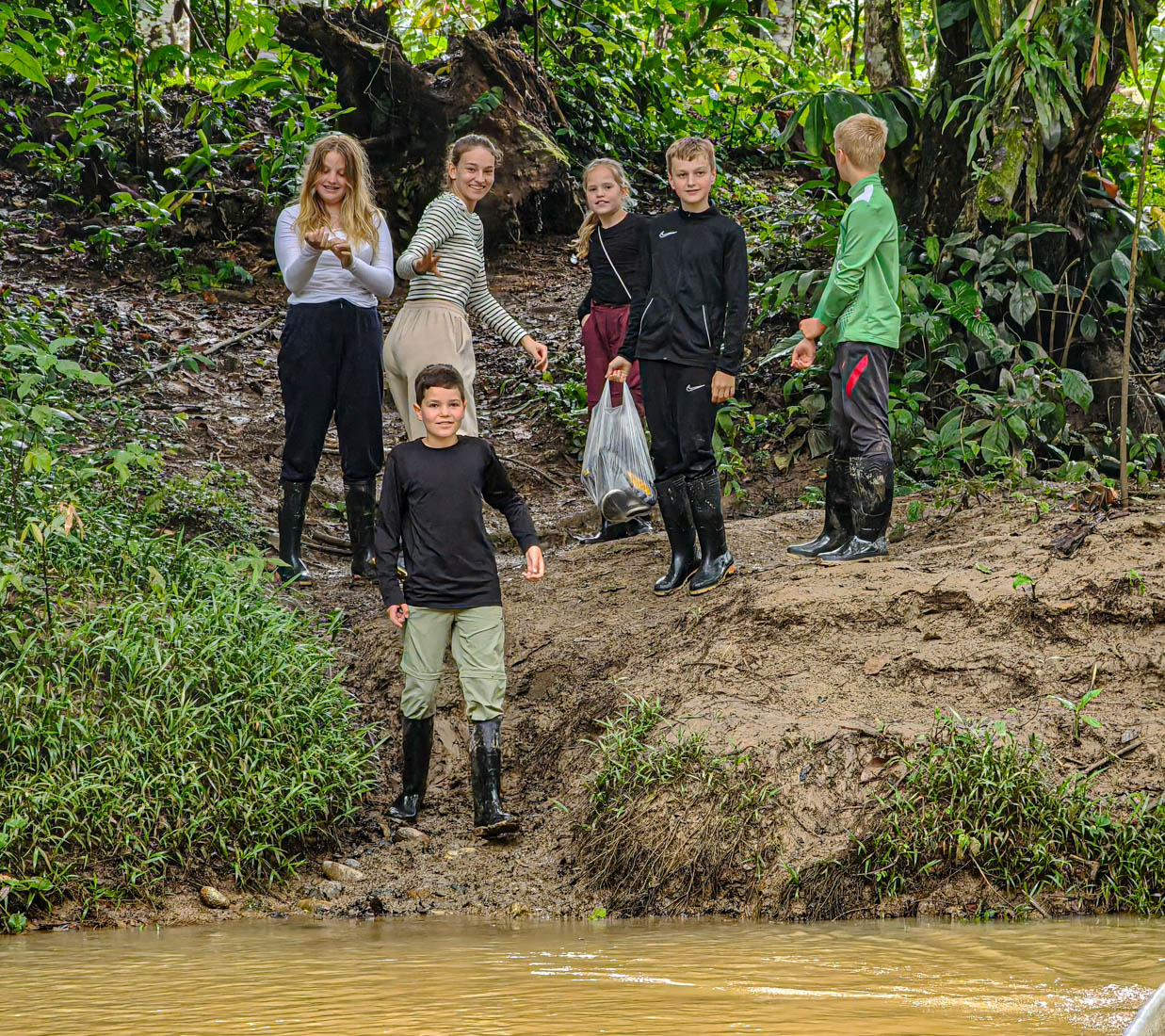 We lunchen samen en nemen daarna de boot naar de overkant van de rivier. Door de onophoudelijke regenval staat het water te hoog om de oversteek te maken met onze laarzen aan.