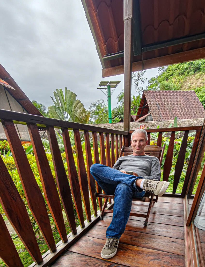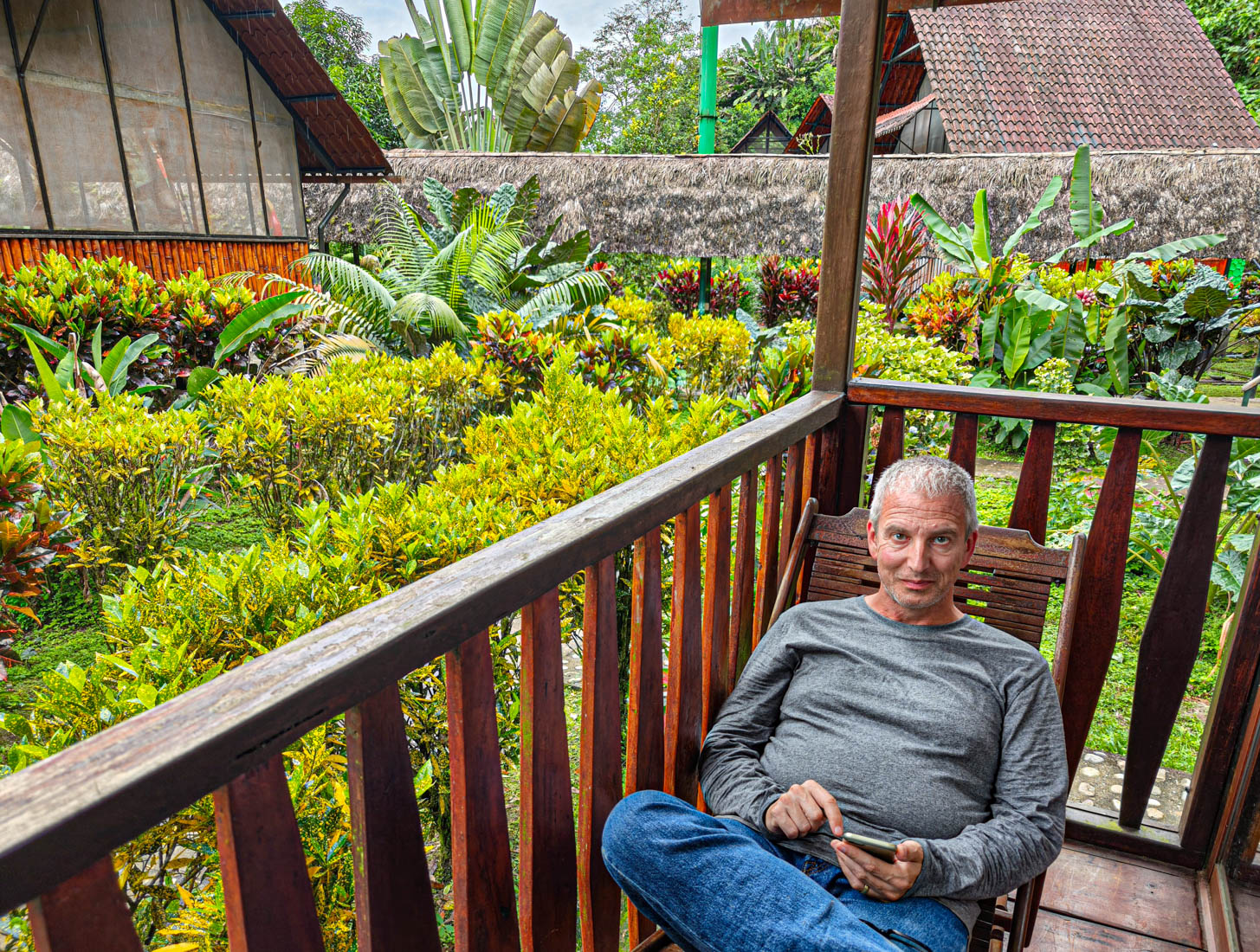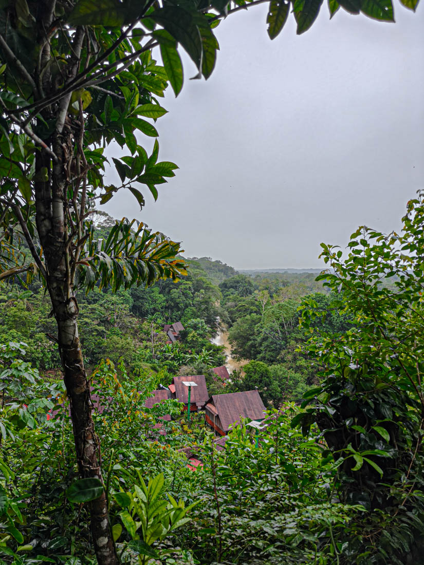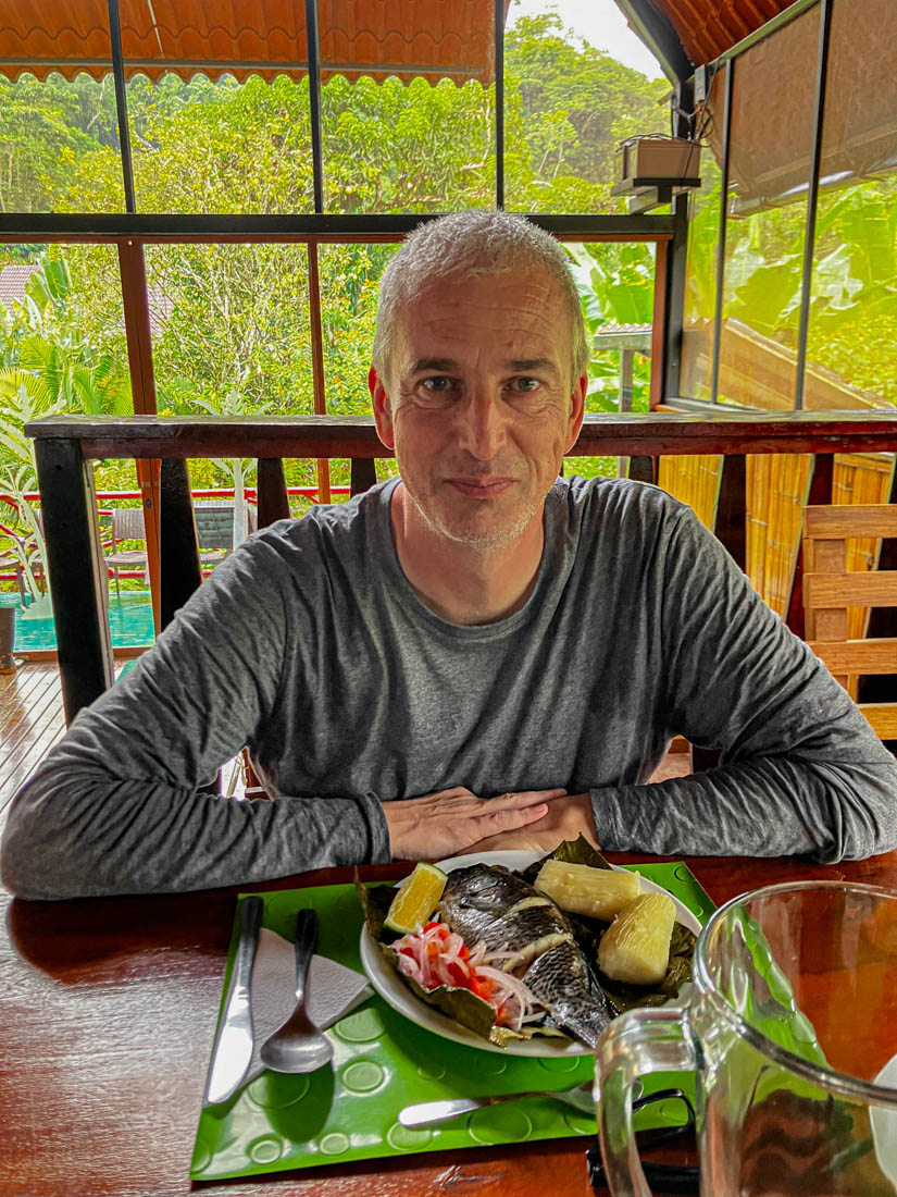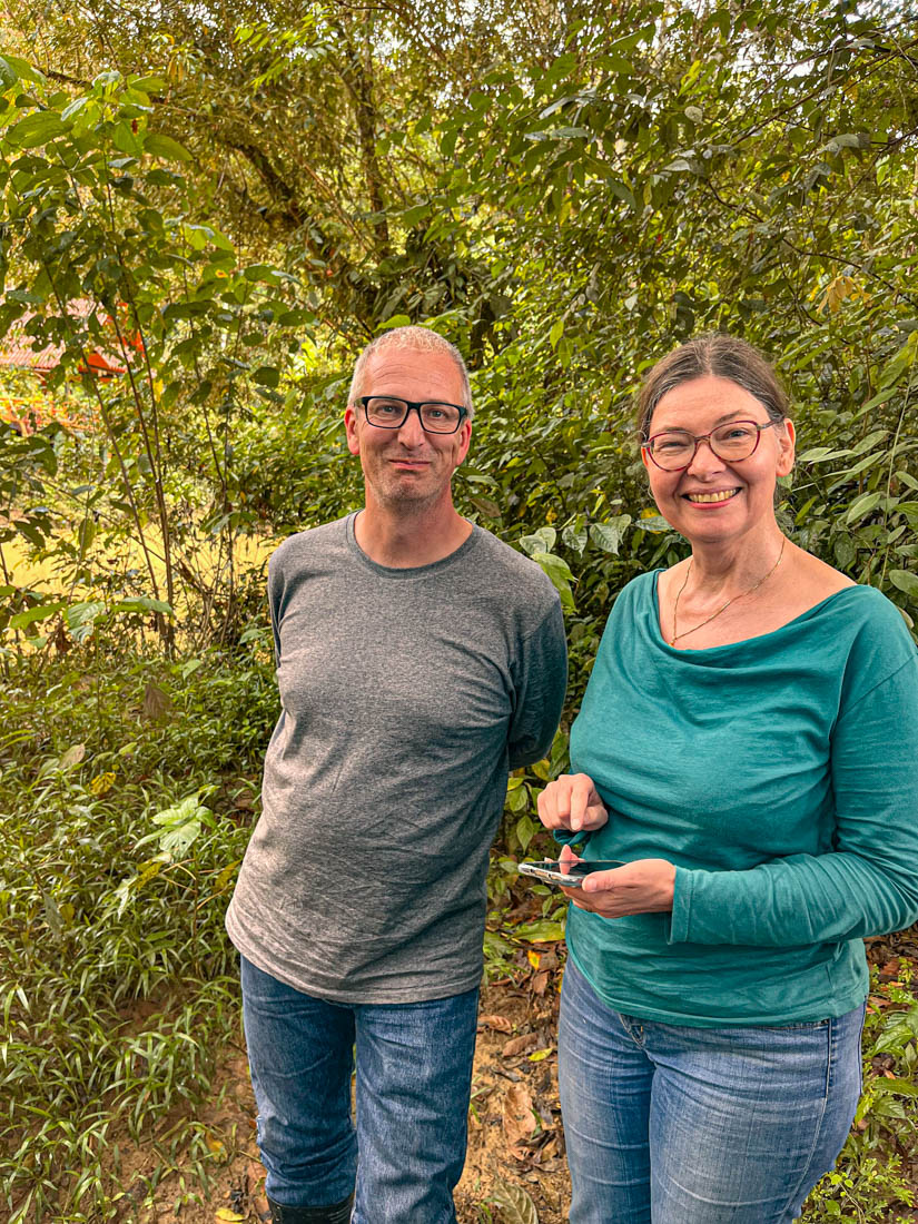 We lunchen samen en nemen daarna de boot naar de overkant van de rivier. Door de onophoudelijke regenval staat het water te hoog om de oversteek te maken met onze laarzen aan.