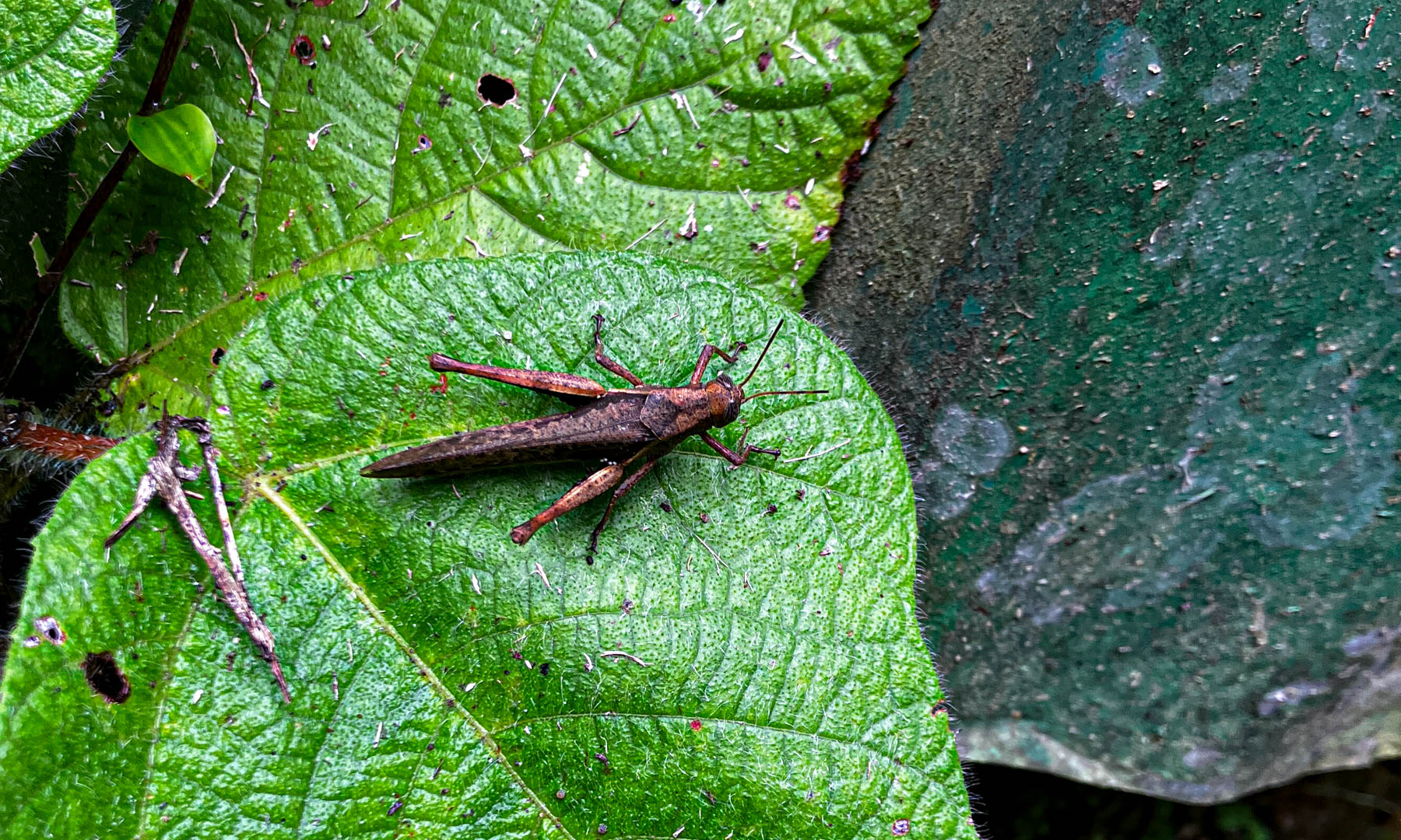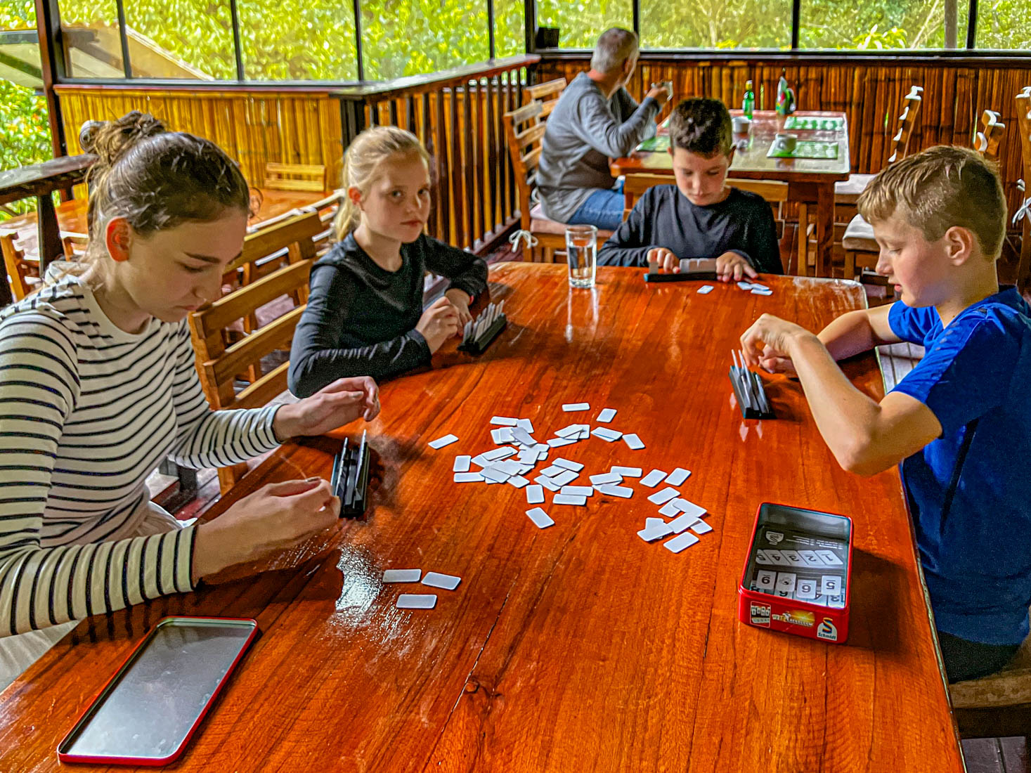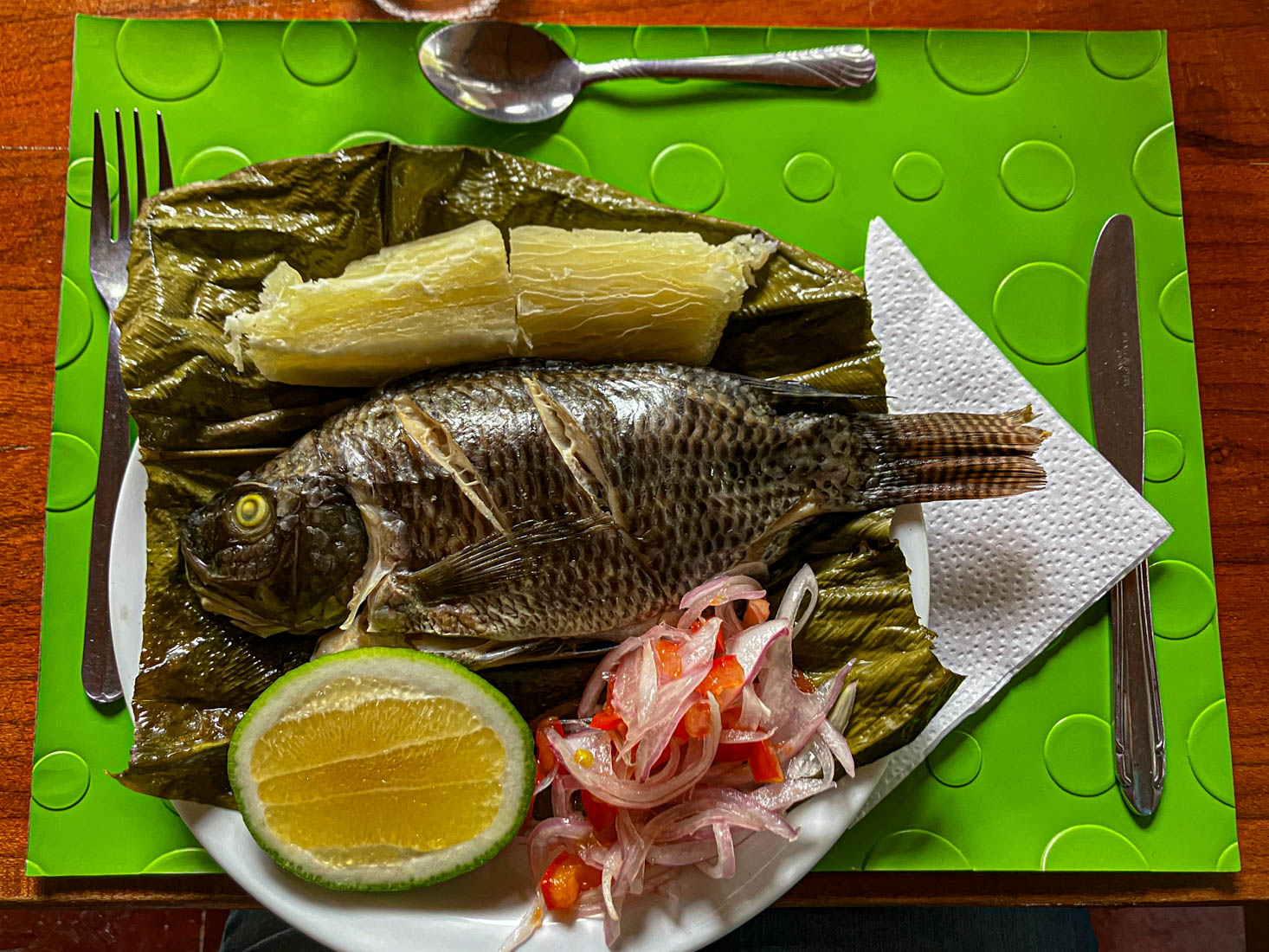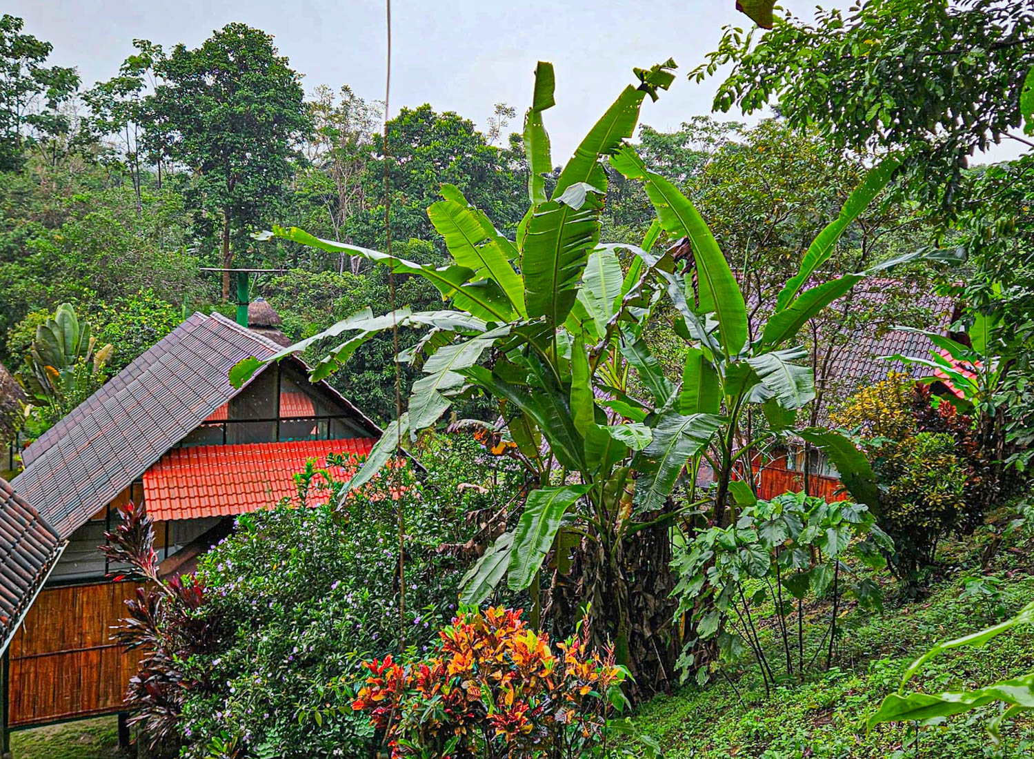 We lunchen samen en nemen daarna de boot naar de overkant van de rivier. Door de onophoudelijke regenval staat het water te hoog om de oversteek te maken met onze laarzen aan.