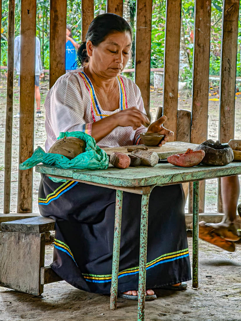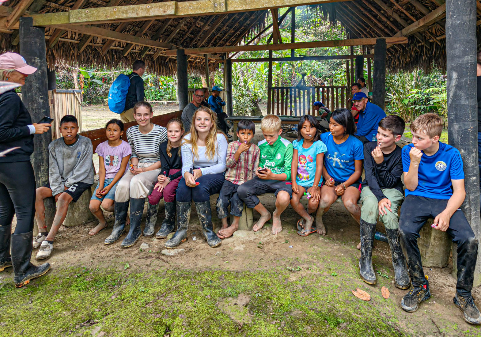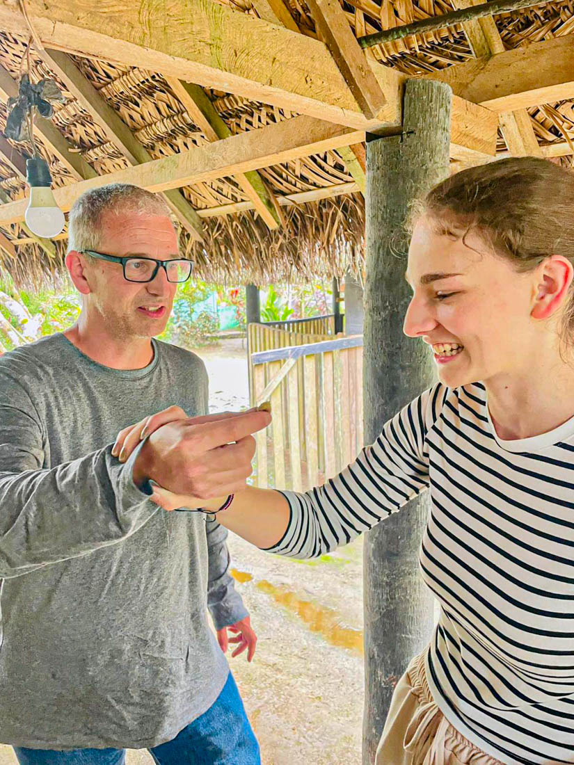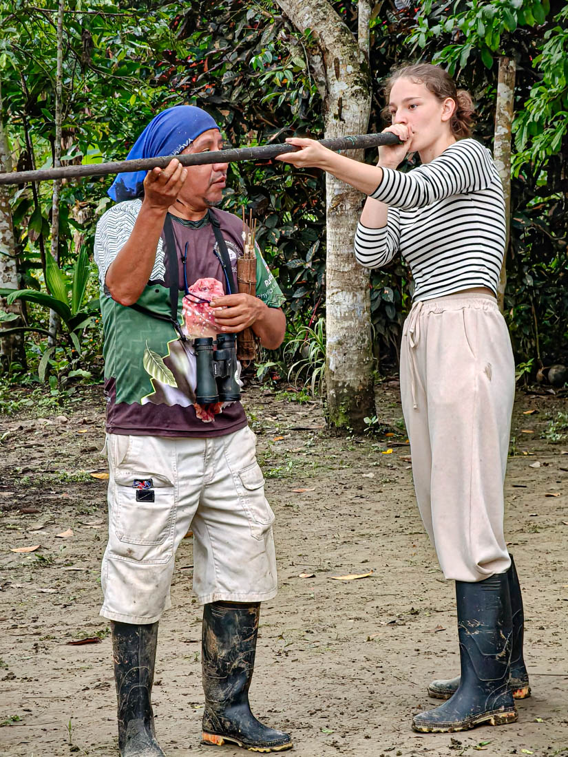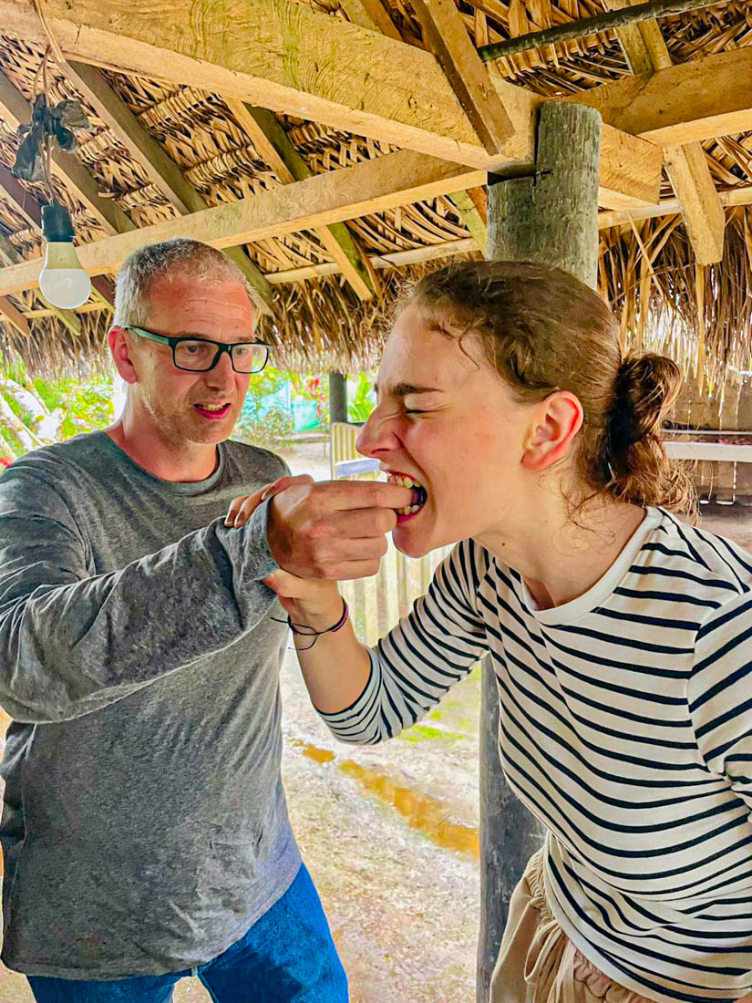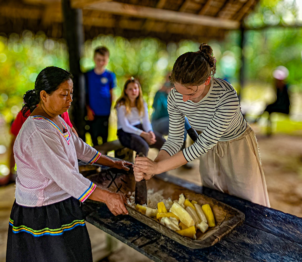 De volgende demonstraties zijn een pak minder smakelijk. Er wordt uitgelegd hoe van cassave (yucca) chicha wordt gemaakt. Na het koken wordt de wortelgroente geplet (kinderen mogen helpen) en daarna wordt wat wazig gedaan over het productieproces maar Karin vertelt dat een van de stappen is dat de oude vrouwen de groente alvast voorkauwen. Het speeksel is een katalysator voor de afbraak van koolhydraten. We mogen allemaal eens proeven.