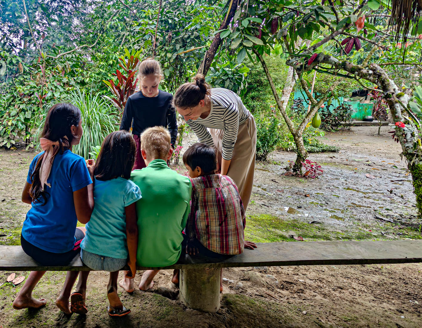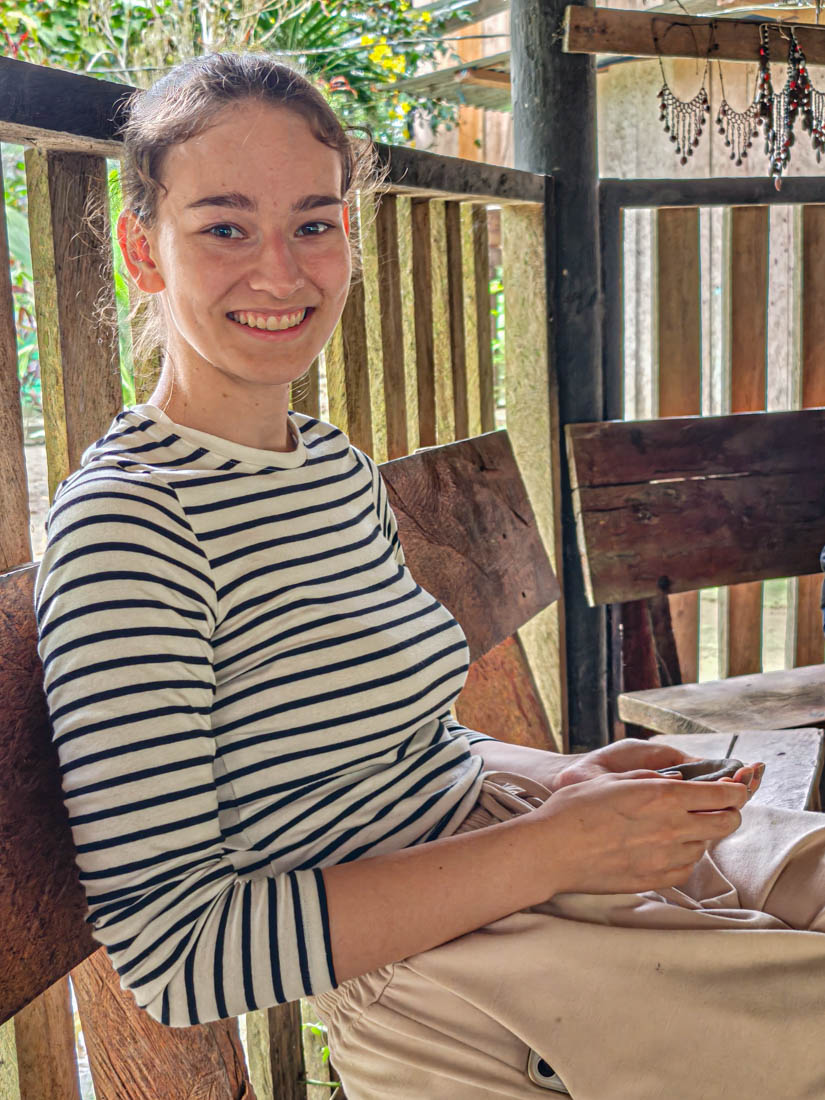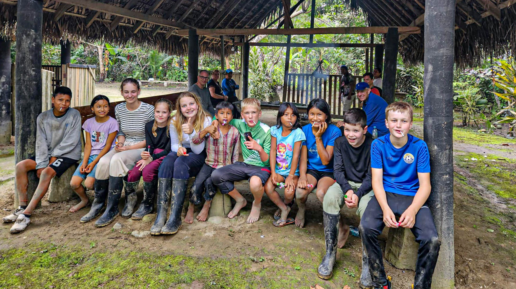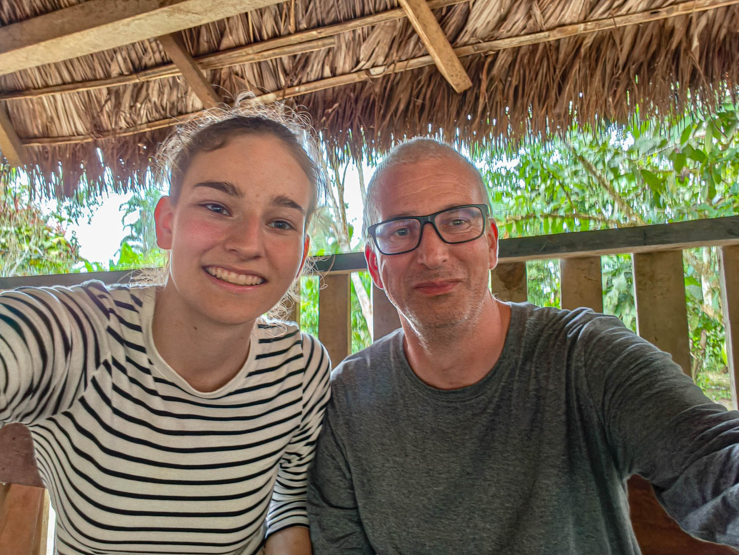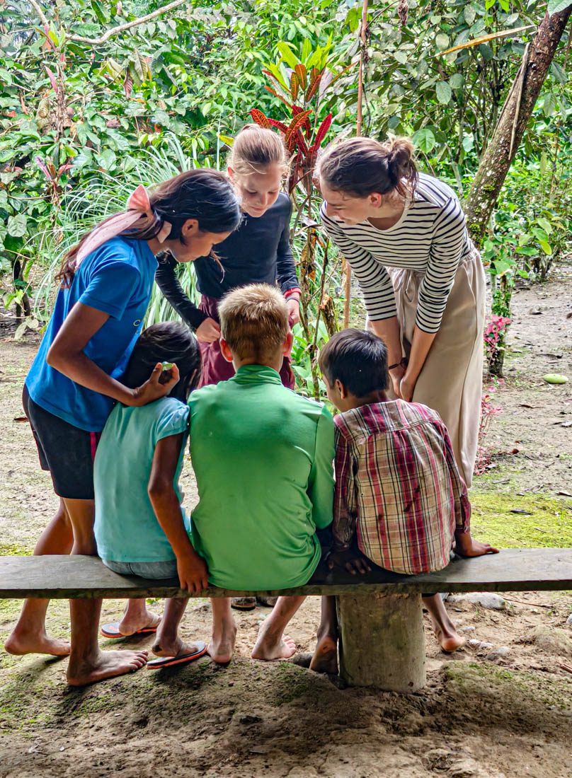 De volgende demonstraties zijn een pak minder smakelijk. Er wordt uitgelegd hoe van cassave (yucca) chicha wordt gemaakt. Na het koken wordt de wortelgroente geplet (kinderen mogen helpen) en daarna wordt wat wazig gedaan over het productieproces maar Karin vertelt dat een van de stappen is dat de oude vrouwen de groente alvast voorkauwen. Het speeksel is een katalysator voor de afbraak van koolhydraten. We mogen allemaal eens proeven.