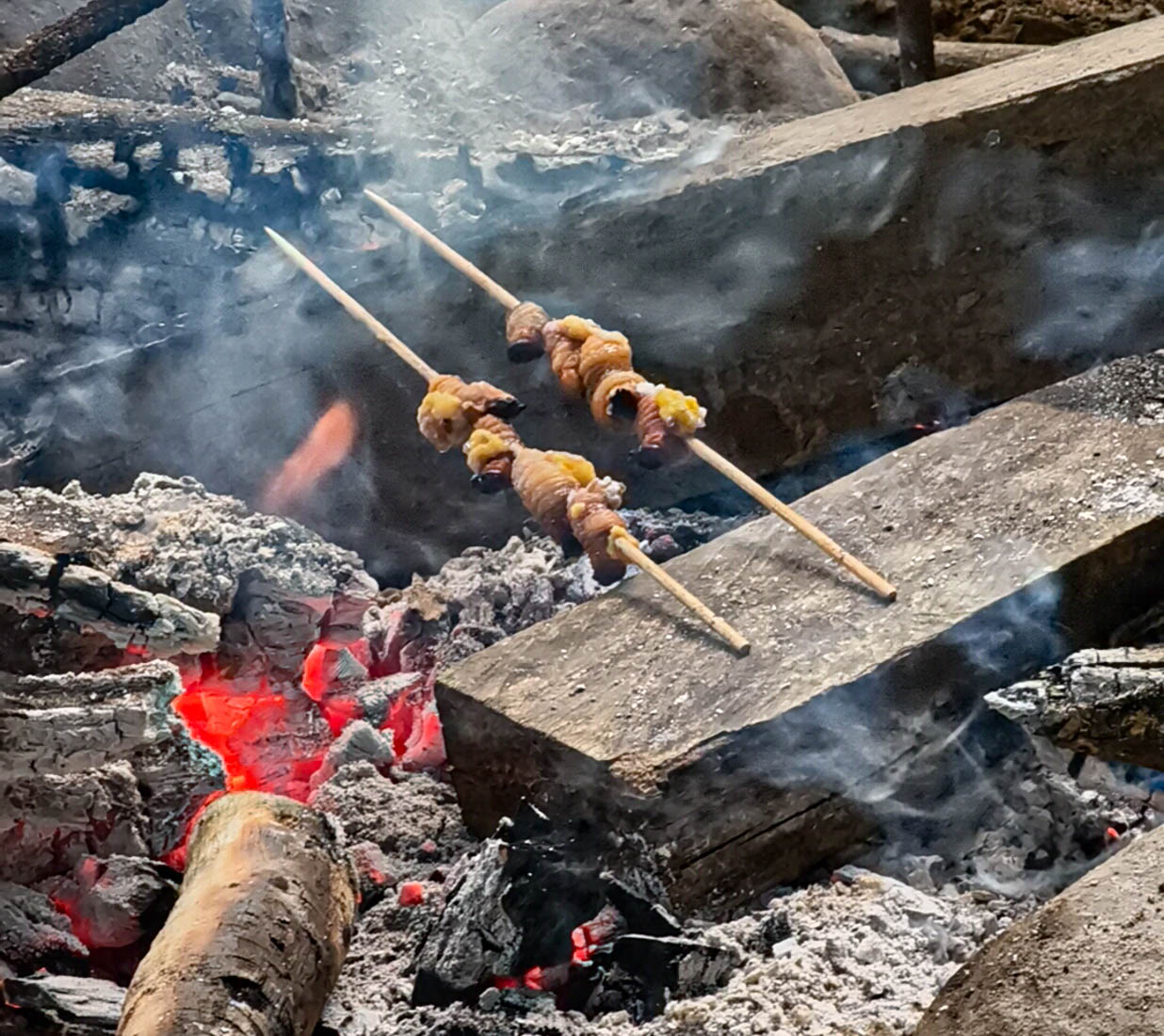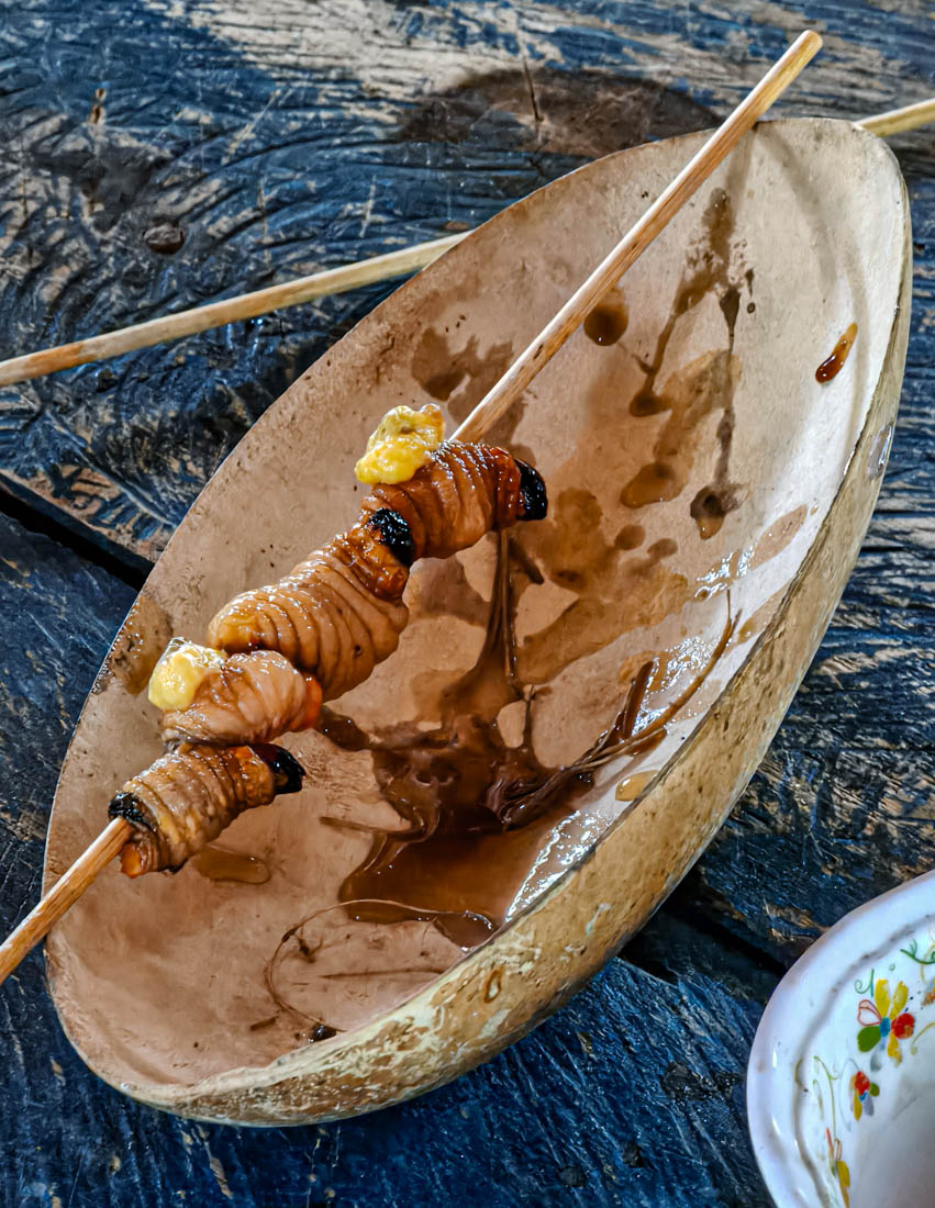 Het volgende is nog viezer. Er worden grote maden aangevoerd. Fausto demonstreert hoe deze gewoonlijk gegeten worden : je bijt de kop eraf en eet die op, daarna de rest. De kop is een beetje krokant, zo wordt het hier omschreven. Voor de toeristen worden de maden anders klaargemaakt. Ze worden opengesneden, er wordt zout in gestrooid en ze worden op een stokje geregen. Daarna worden ze geroosterd op een vuurtje alsof het marshmallows zijn. Om de een of andere reden voelt Julia zich verplicht te proeven, en Ben proeft ook. Ze vinden het smaken naar spekjes. De andere kinderen amuseren zich met in de bomen te klimmen en te zwaaien aan lianen.