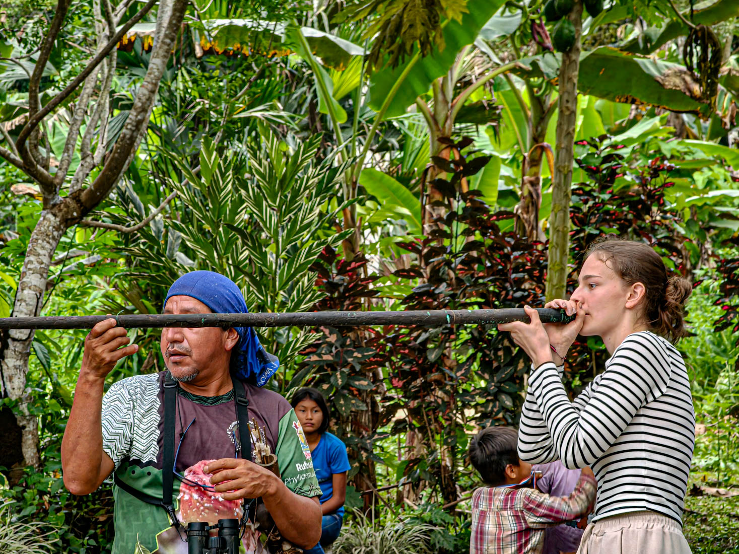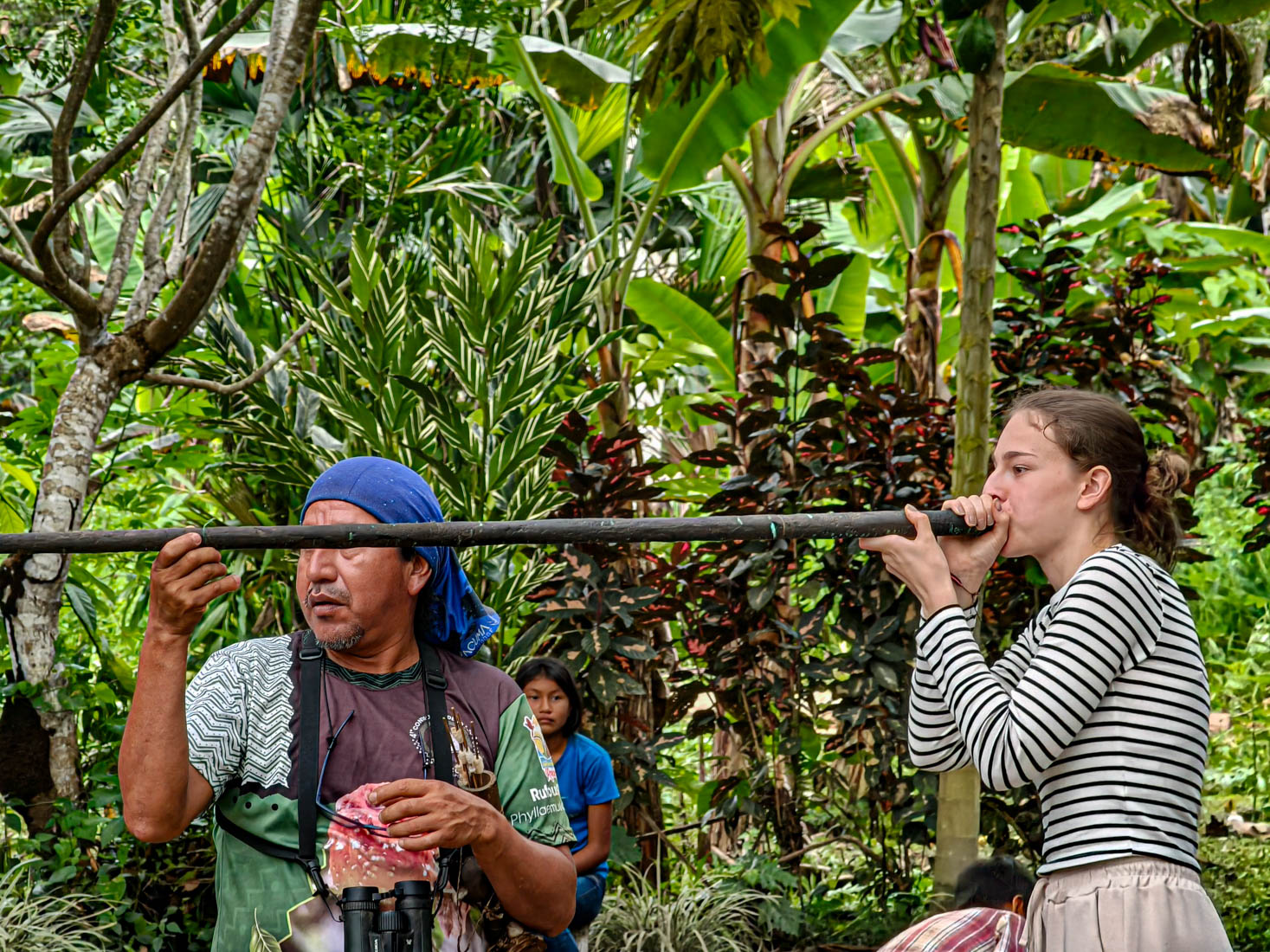 De volgende demonstratie behelst pijltjes schieten met een lange blaaspijp. We maken er een wedstrijd van. Wie het eerst de vogel raakt krijgt een prijs. Het is moeilijker dan gedacht !!!