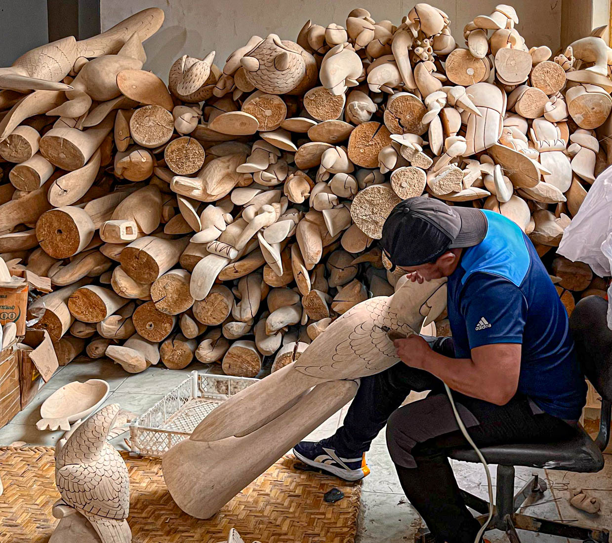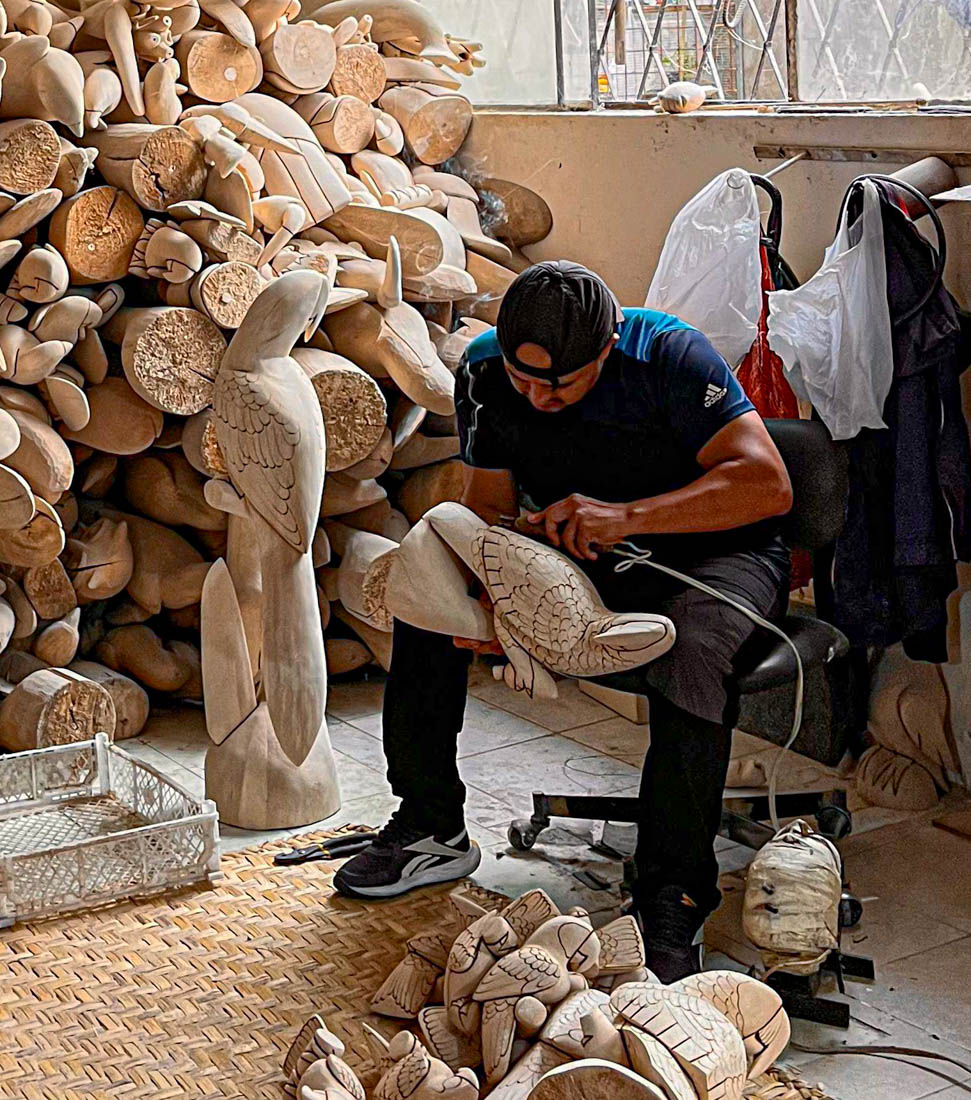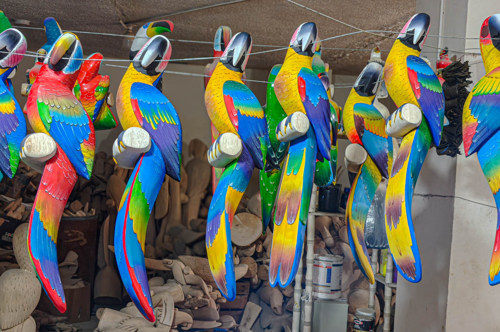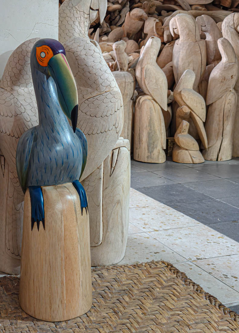 De volgende stop is in een basalthoutfabriekje. Omdat het zaterdag is, is er helemaal niemand en Karin moet de sleutel ergens gaan ophalen. We zien houten beelden in verschillende stadia van afwerking en mogen alles bekijken en aanraken.