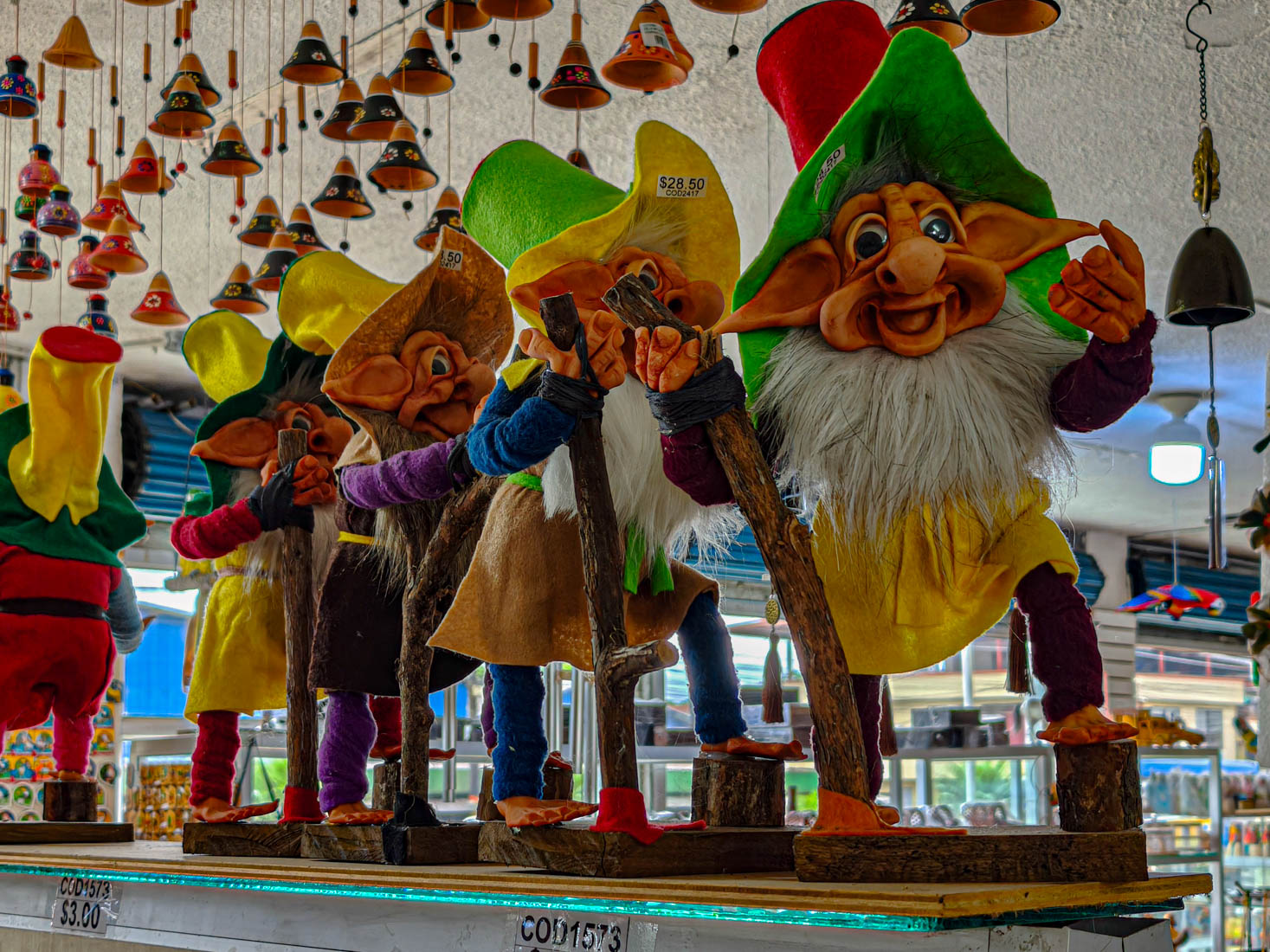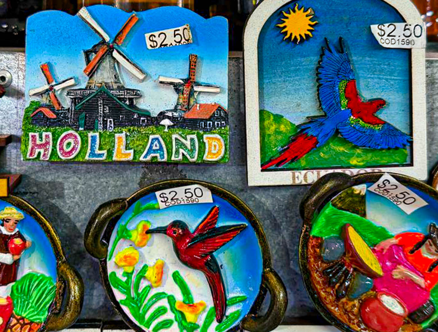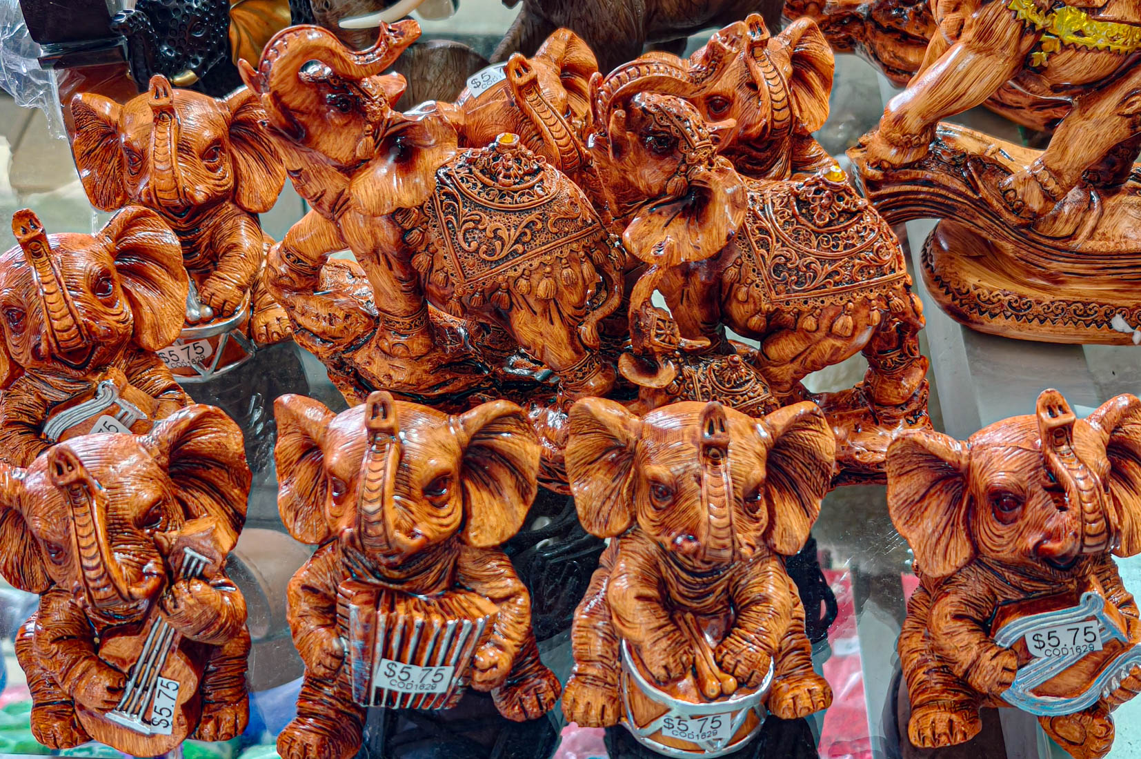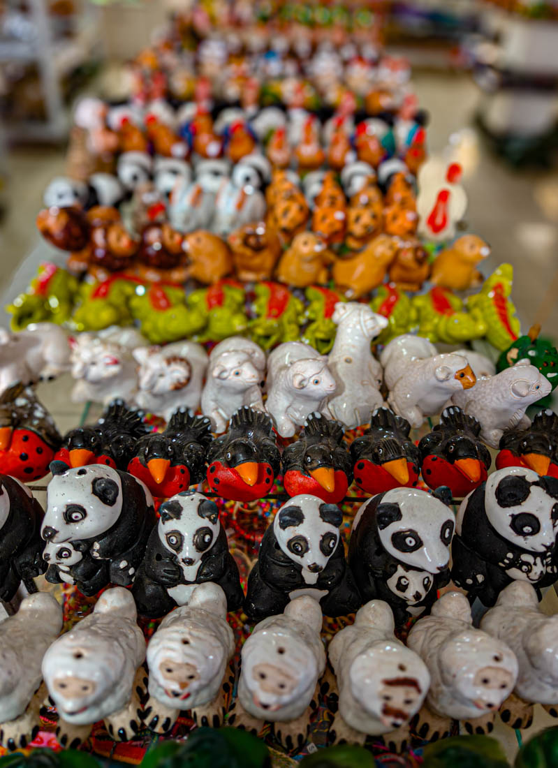 Daarna gaan we naar de erboven gelegen souvenirwinkel waar iedereen naar hartenlust inkopen kan doen. Het is supergoedkoop maar naar de herkomst van de souvenirs is het raden want er zijn vele olifanten, panda’s, koala’s en zelfs Hollandse molentjes.
