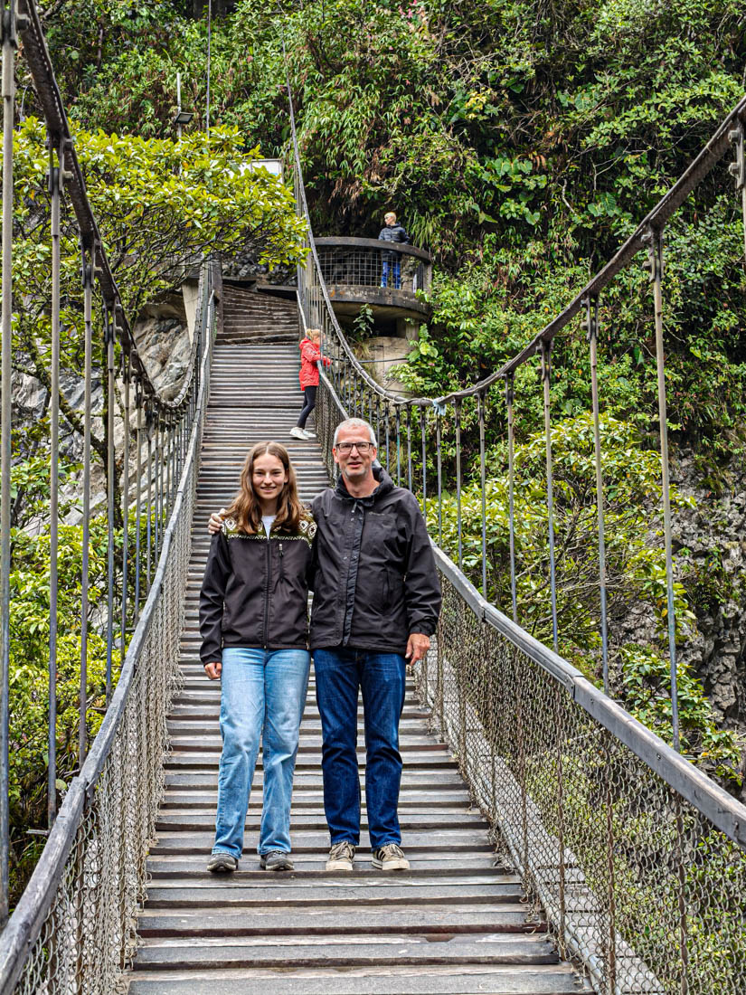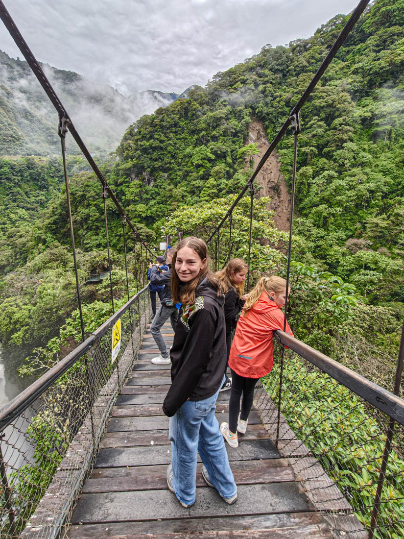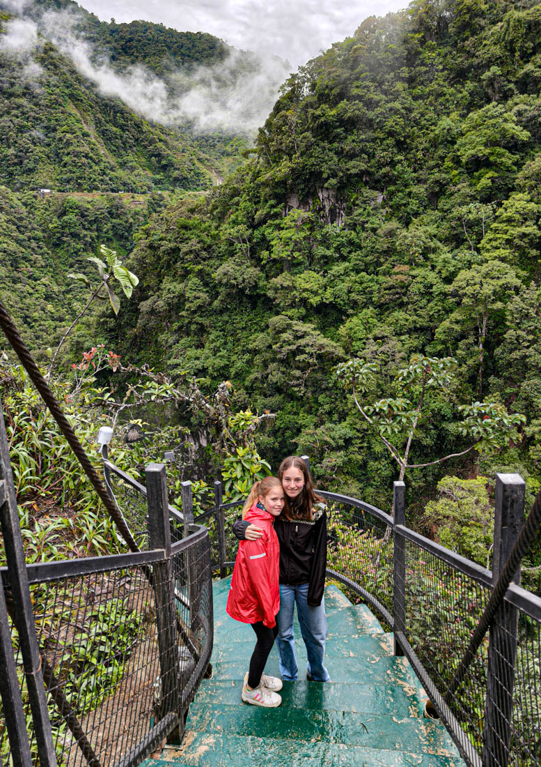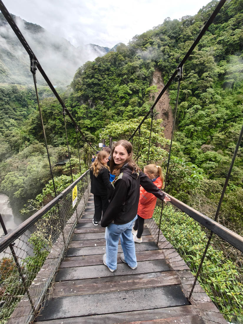 Om 9 uur staan we aan de ingang vande Cascada del pailon del diablo. Het is niet de hoogste, de breedste of de mooiste die we al ooit gezien hebben maar hij is toch wel prachtig gelegen, en de touwbruggen en trapjes erlangs maken het heel plezant voor de kinderen.
