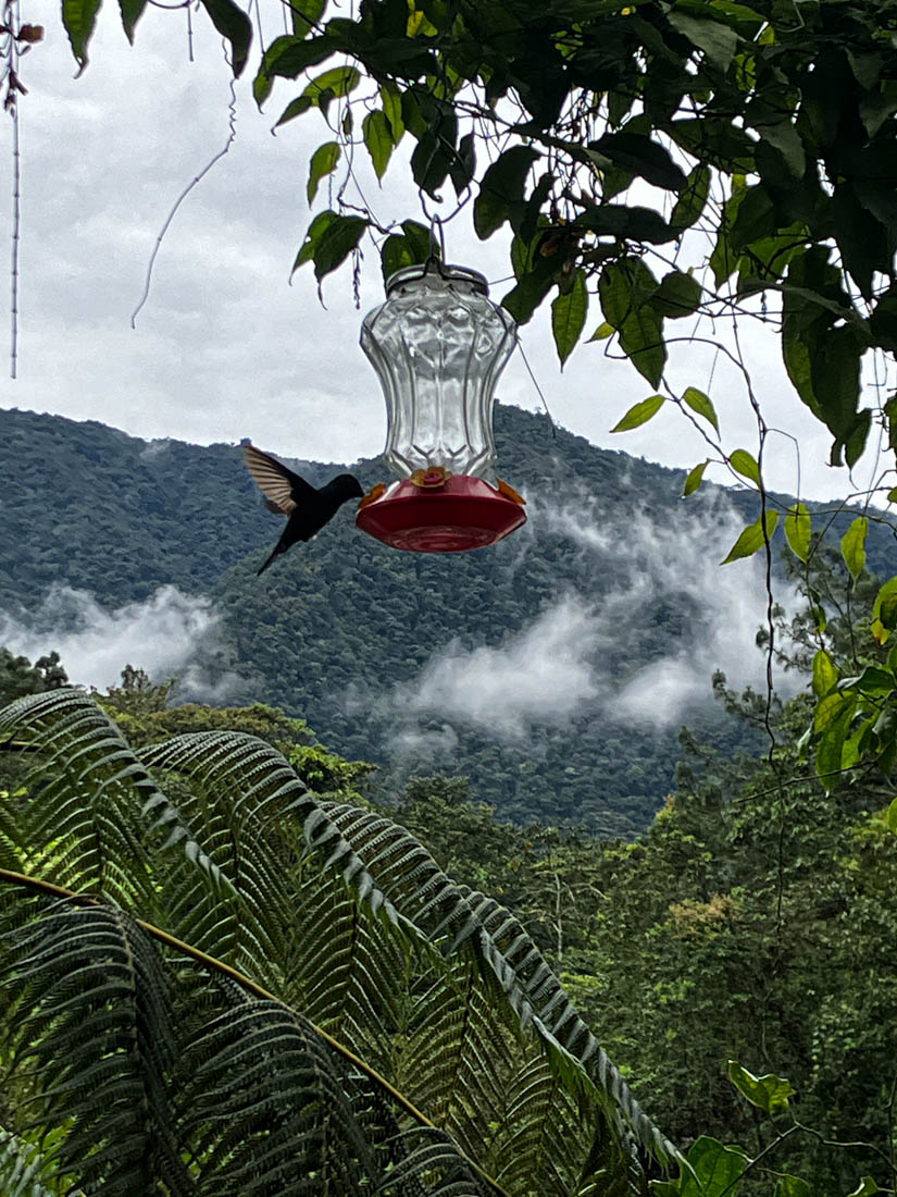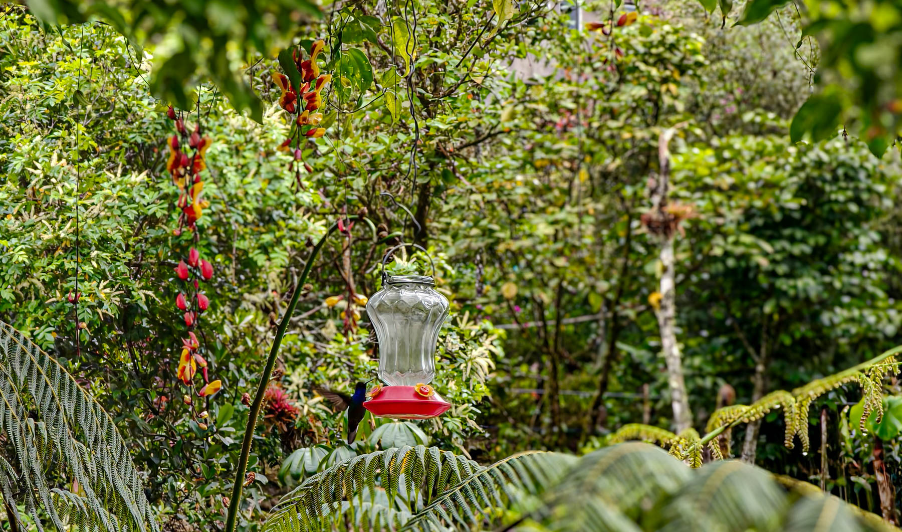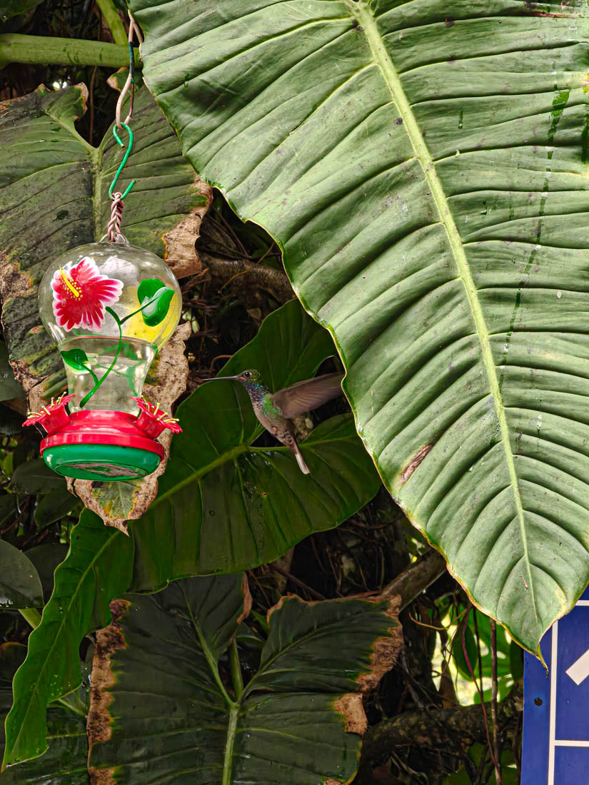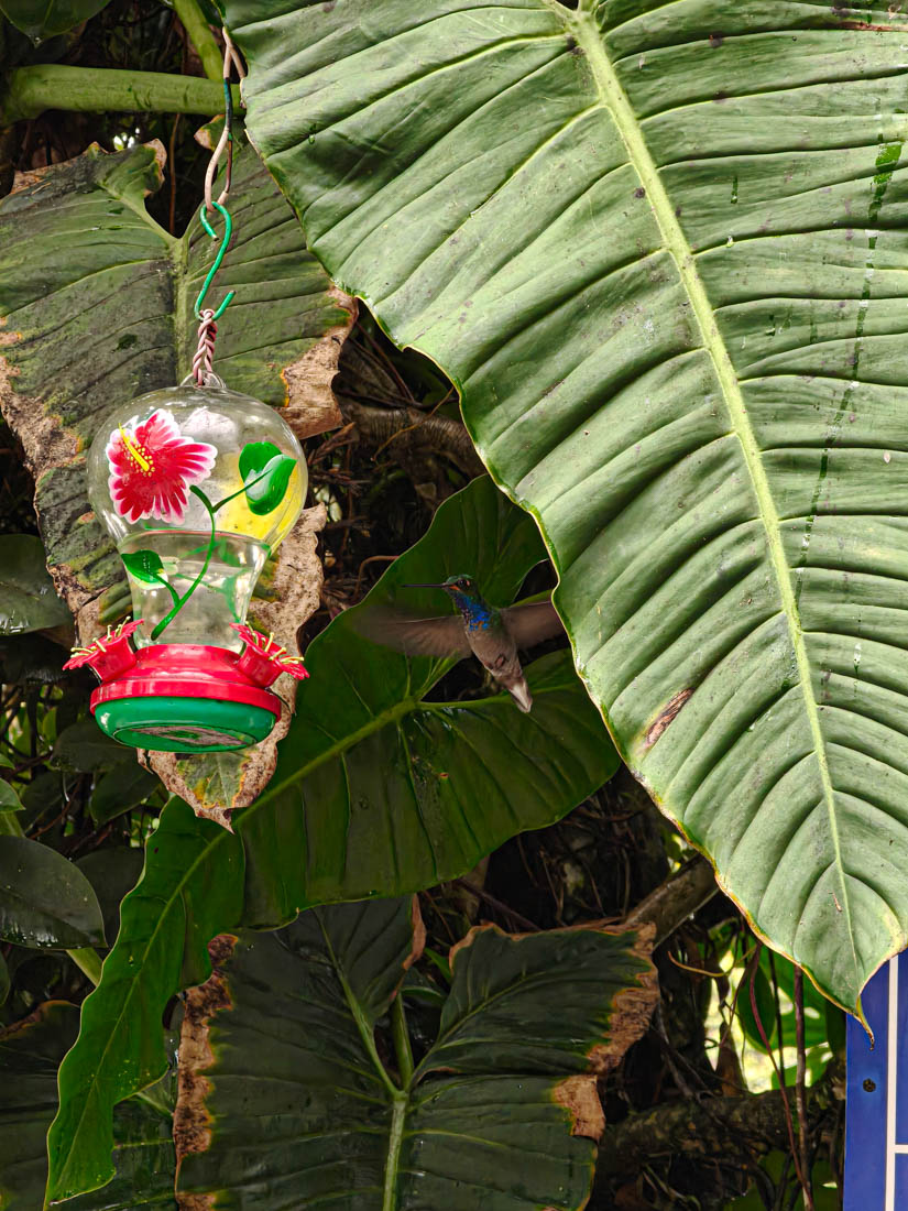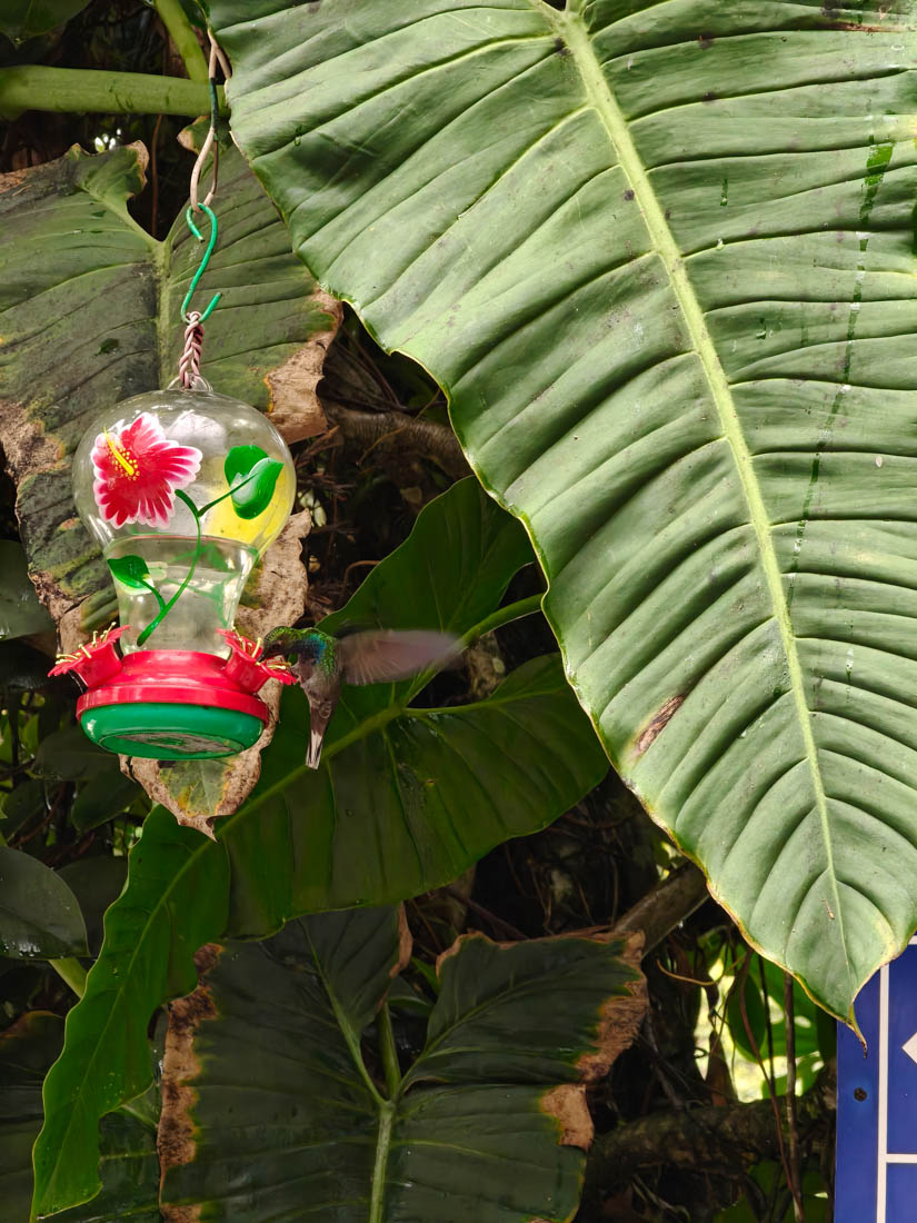 Daar zien we dat er voeder – en drankbakjes opgehangen zijn, wat dan weer veel kolibri’s aantrekt.