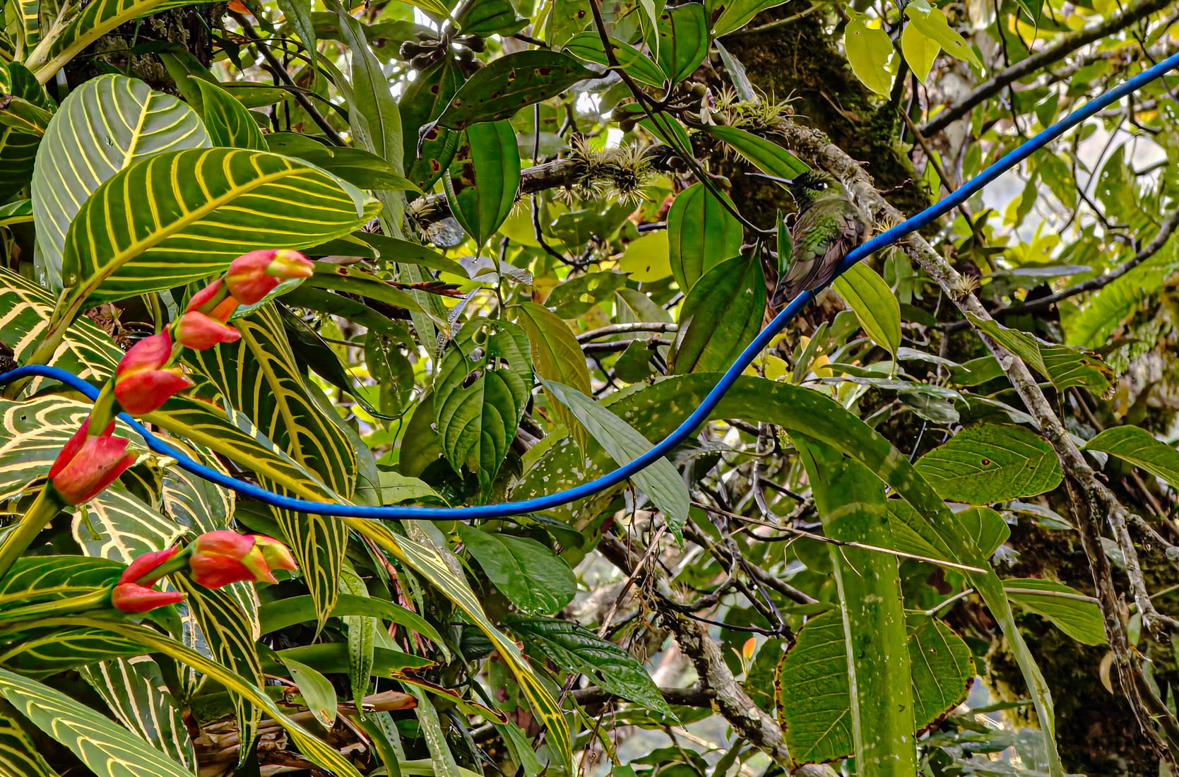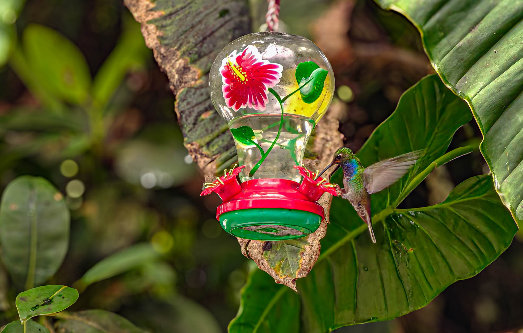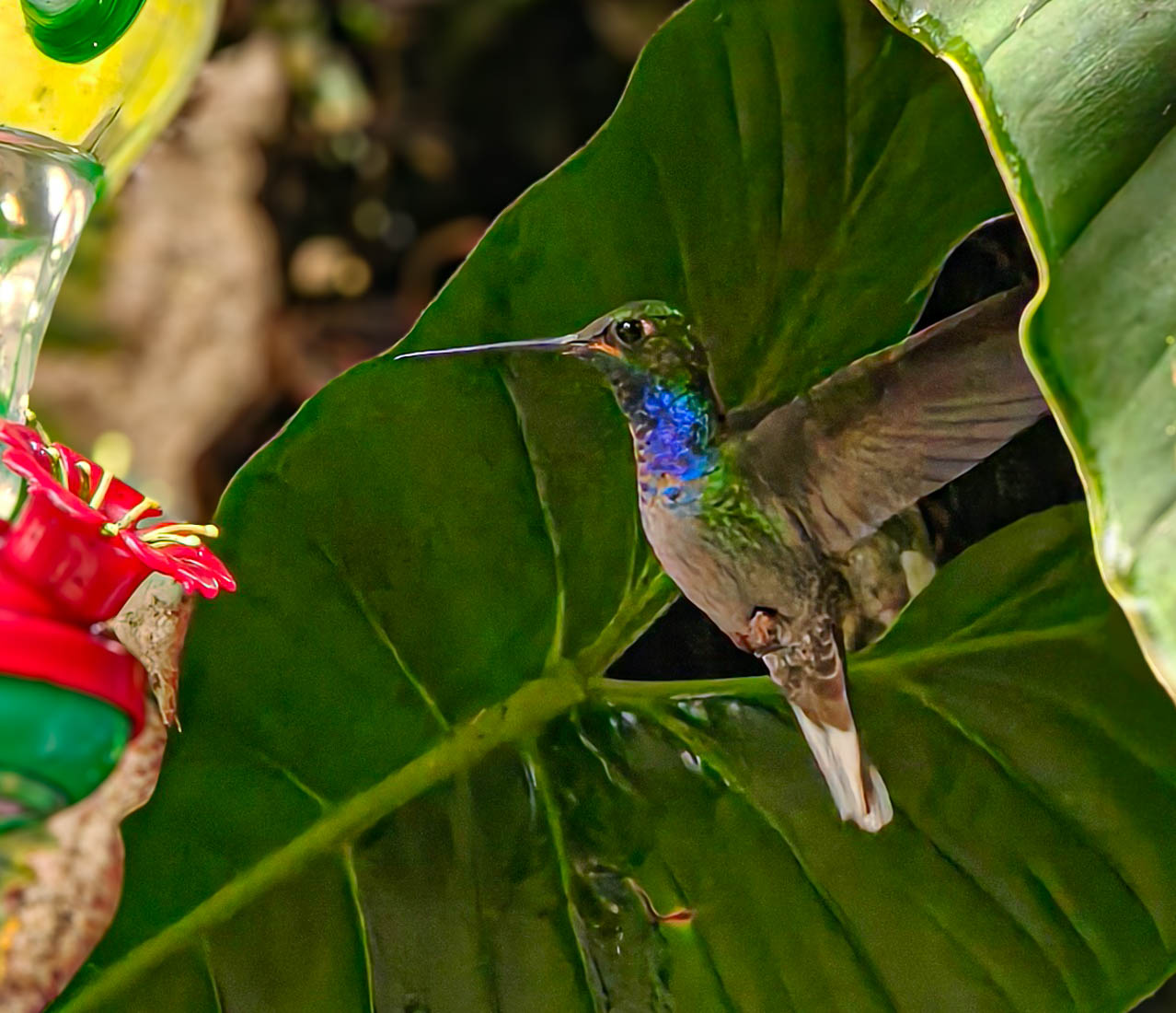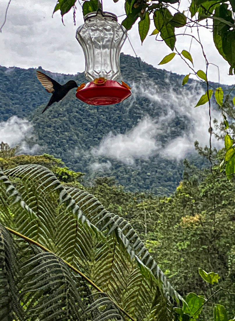 Daar zien we dat er voeder – en drankbakjes opgehangen zijn, wat dan weer veel kolibri’s aantrekt.