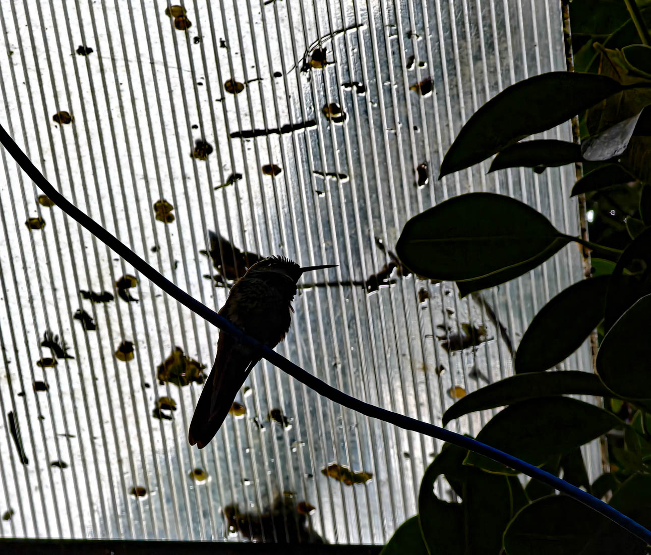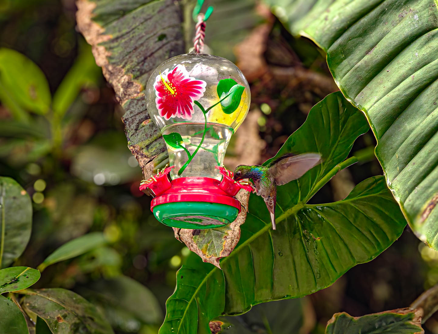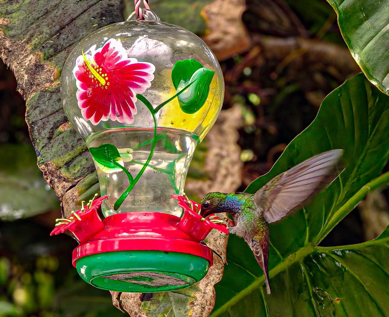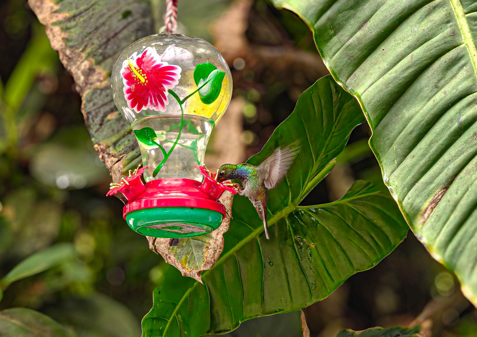 Daar zien we dat er voeder – en drankbakjes opgehangen zijn, wat dan weer veel kolibri’s aantrekt.