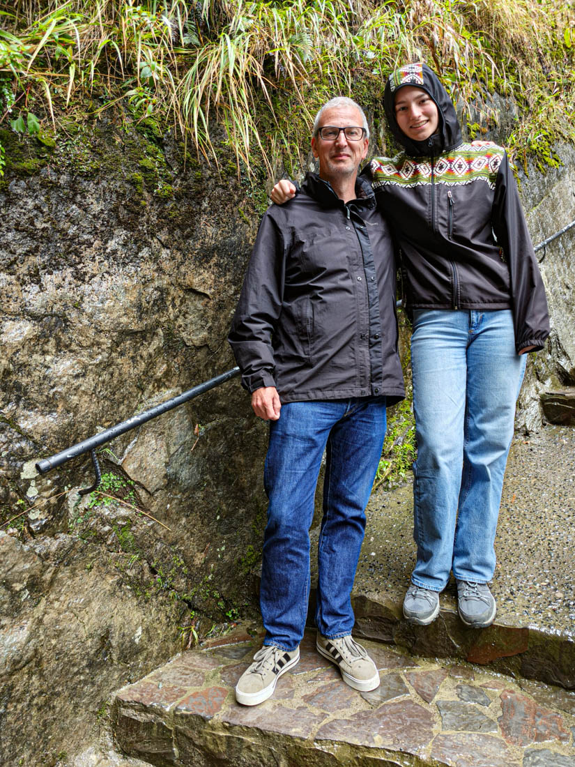 Gelukkig hebben we allemaal een regenjas bij, maar we worden sowieso kleddernat. Er worden alweer honderden foto’s gemaakt vooraleer we weer bij de uitgang zijn.