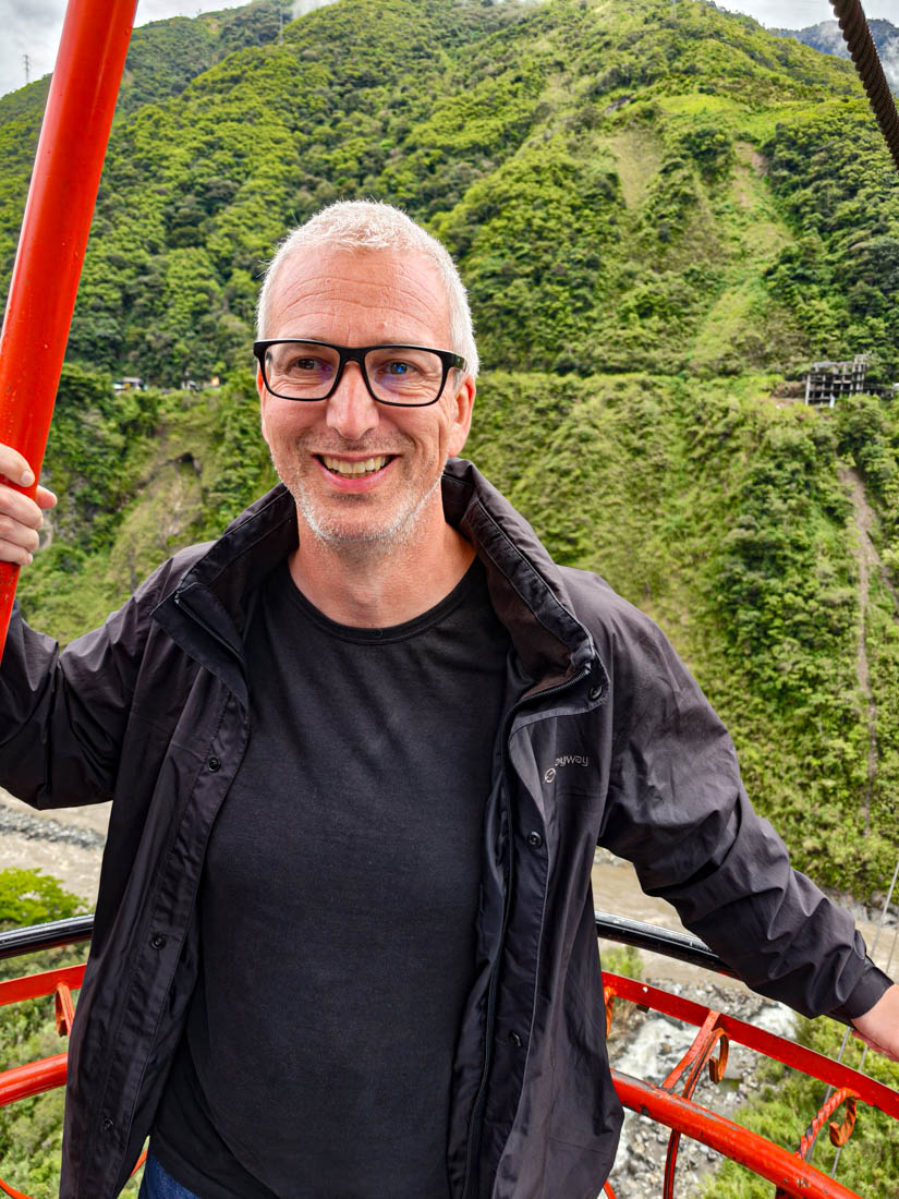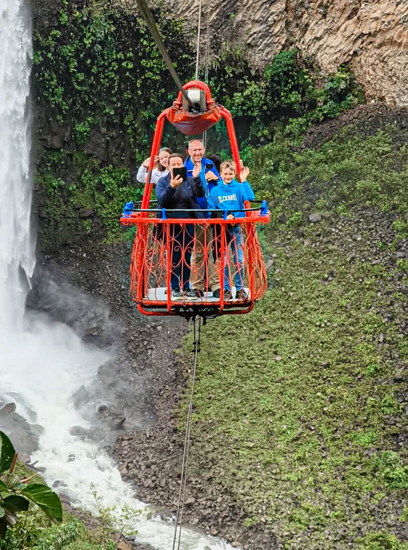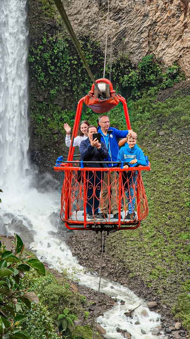 De volgende stopplaats van ons busje is bij een soort zelfgemaakte kabelbaan. Een traktormotor drijft een bakje aan waarme je over een kloof wordt getakeld. Daarna hang je even stil bij een waterval “el manto de la novia” en daarna ga je nog wat verder. Eigenlijk is het niks bijzonders maar het uitzicht en het wankele bakje dragen bij tot het excitement.