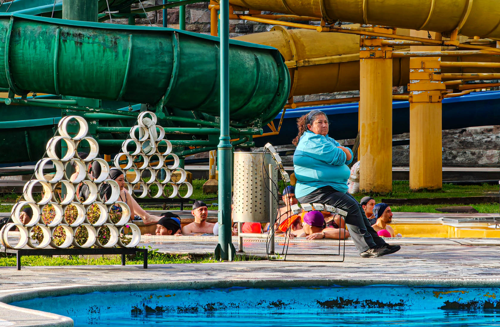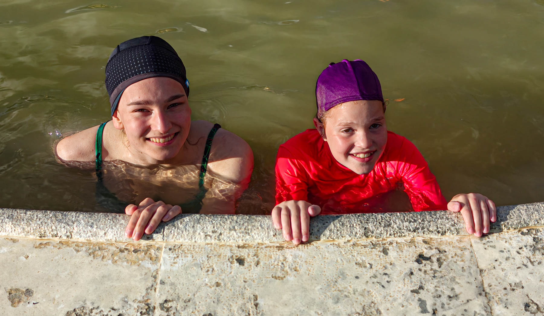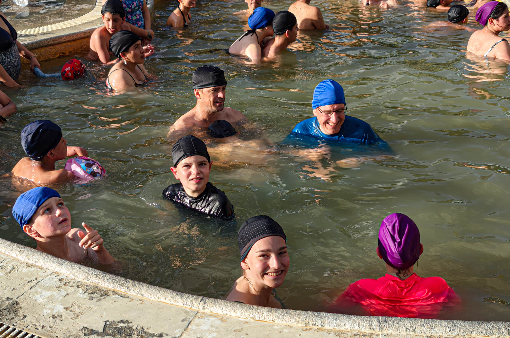 Het zwembad is populair op zondagnamiddagen, ook bij de locals. Het gaat er vrij streng aan toe. We kunnen een box lenen om onze droge kleren in te leggen maar moeten die afgeven. Sommigen zien dat helemaal niet zitten en slagen erin die box bij zich te houden, op voowaarde dat er constant iemand bij de wacht houdt. Badmutsen zijn verplicht en kunnen, net als badhanddoeken, aangekocht worden. Een koopje, volgens sommigen uit de groep.