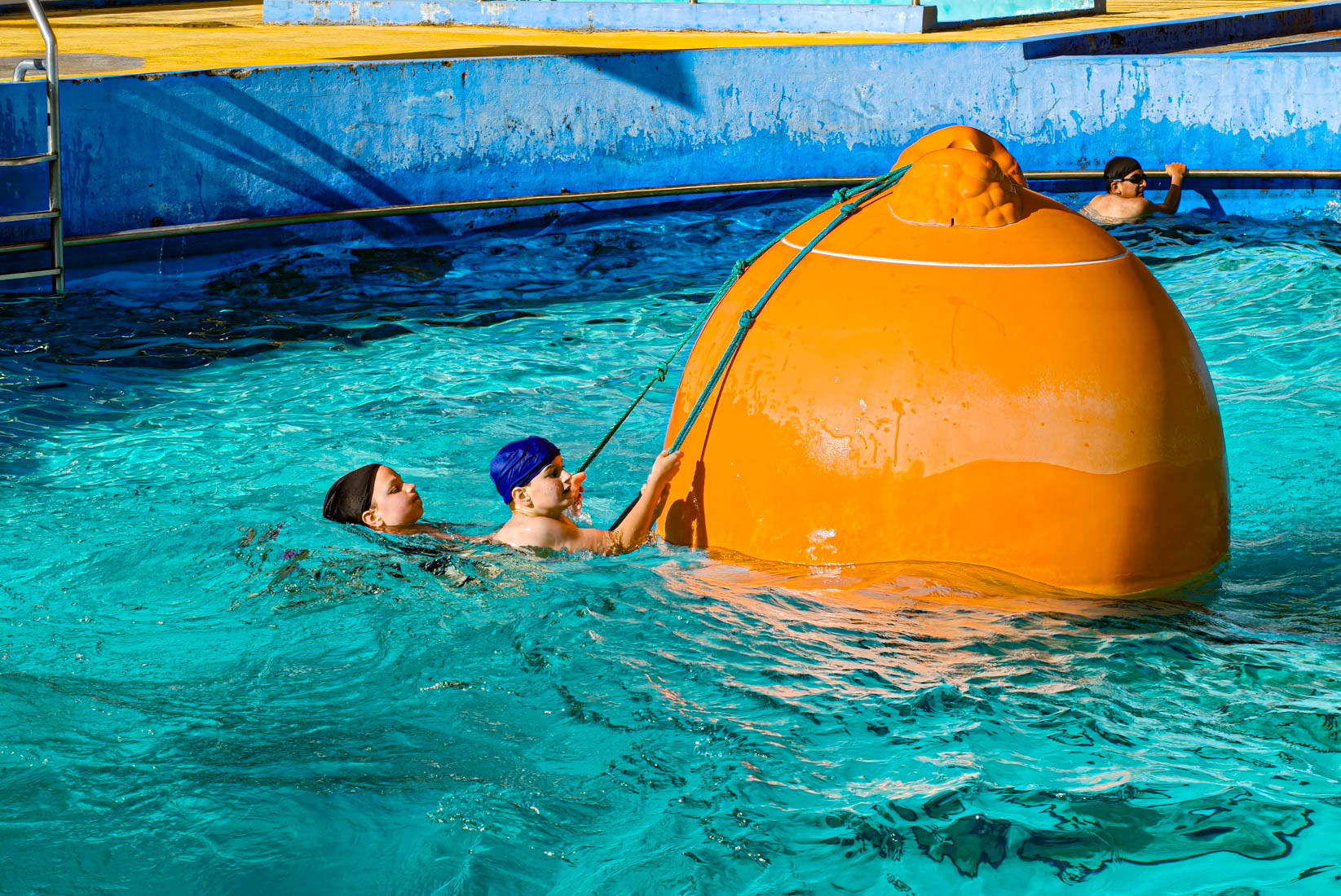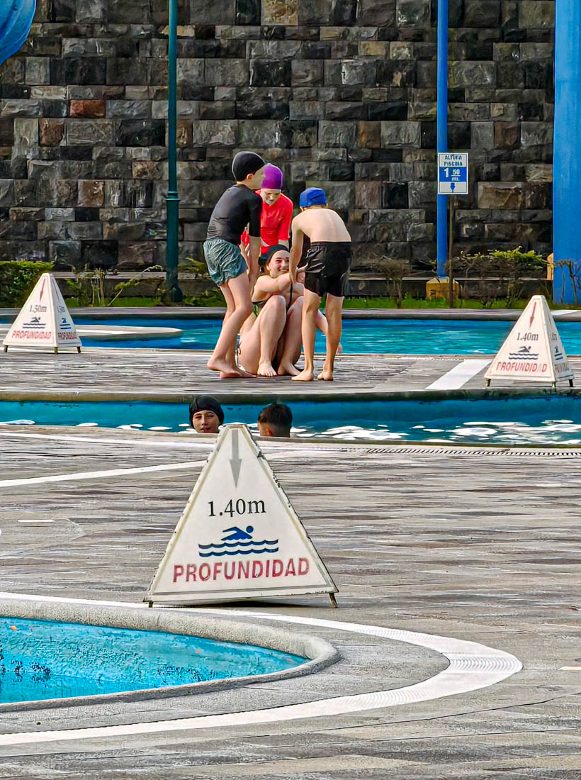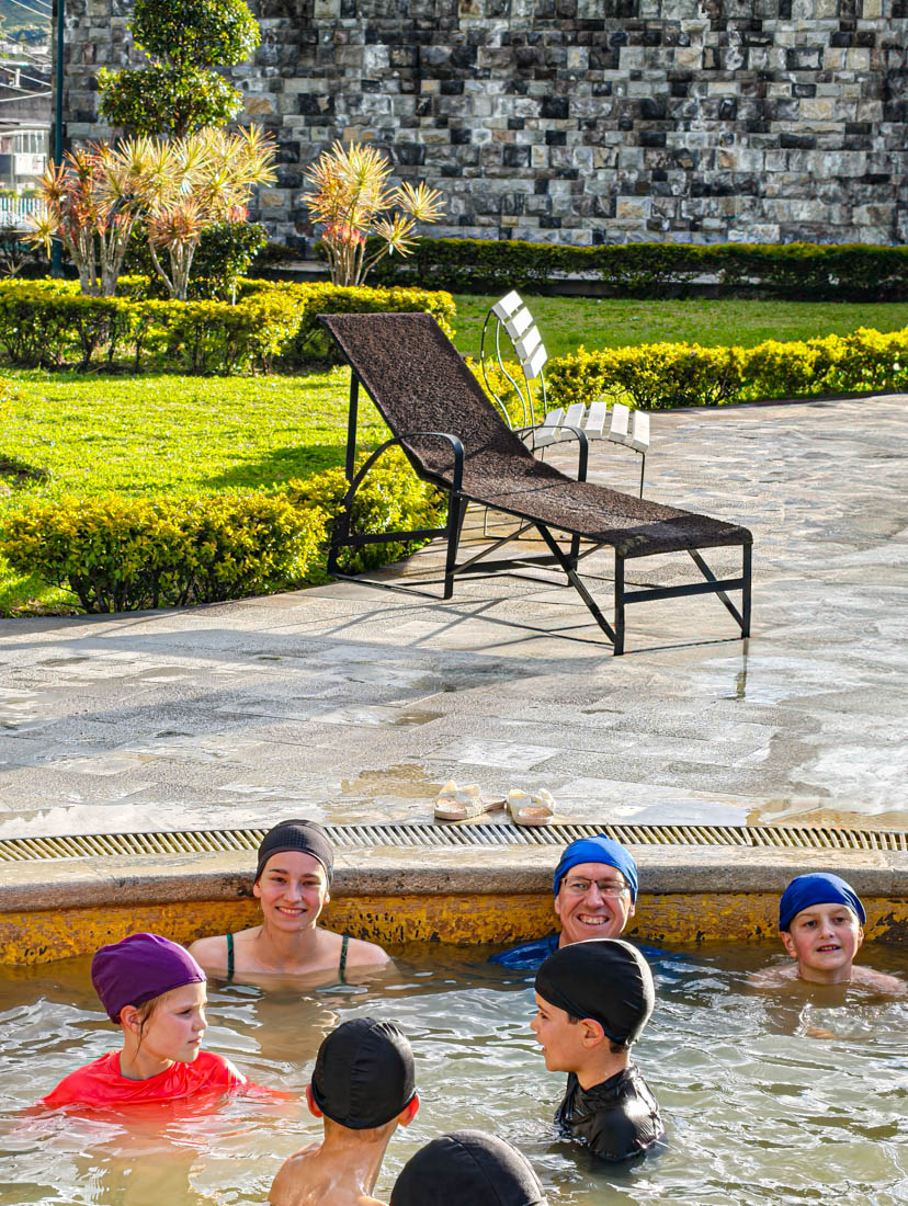 Het zwembad is populair op zondagnamiddagen, ook bij de locals. Het gaat er vrij streng aan toe. We kunnen een box lenen om onze droge kleren in te leggen maar moeten die afgeven. Sommigen zien dat helemaal niet zitten en slagen erin die box bij zich te houden, op voowaarde dat er constant iemand bij de wacht houdt. Badmutsen zijn verplicht en kunnen, net als badhanddoeken, aangekocht worden. Een koopje, volgens sommigen uit de groep.