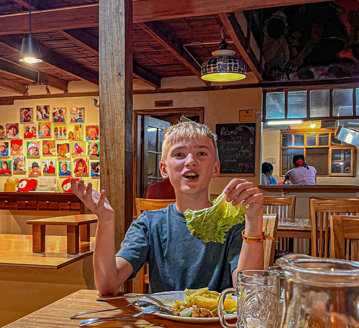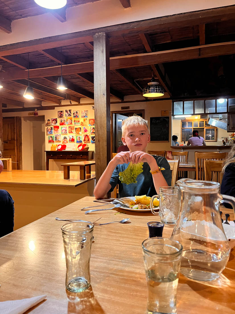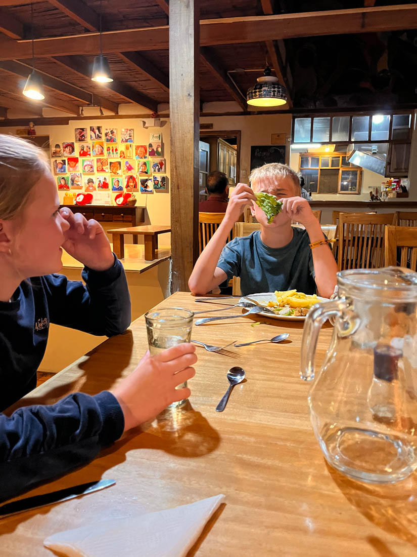 Iedereen is vrij moe en we kunnen niet echt genieten van het avondeten, alhoewel het wel lekker is en de bediening is super vriendelijk.