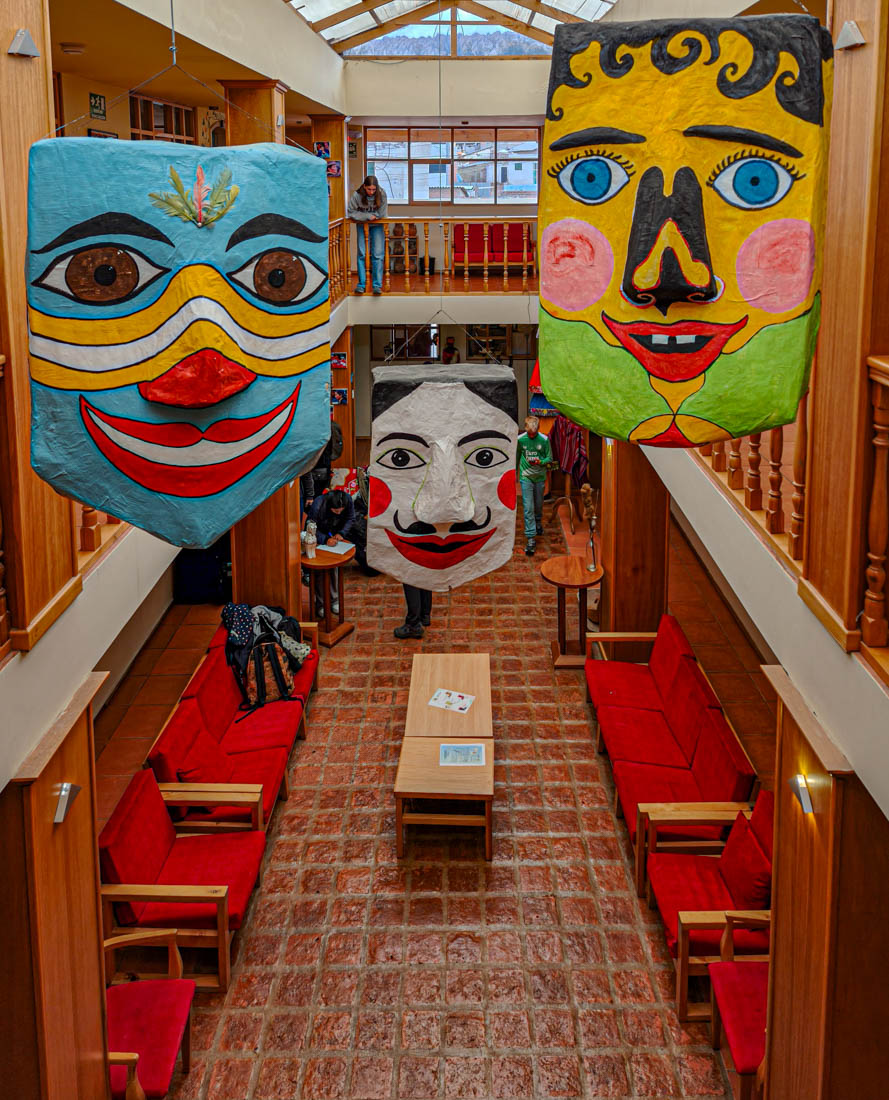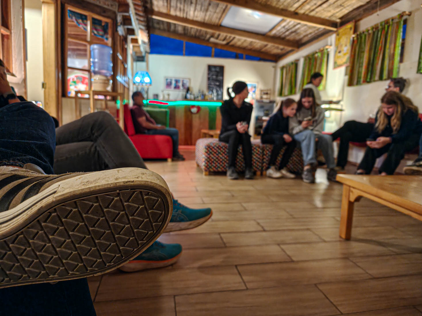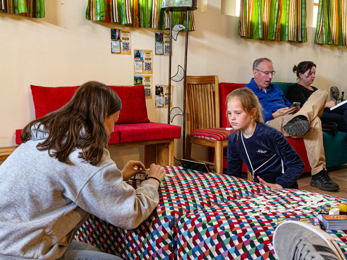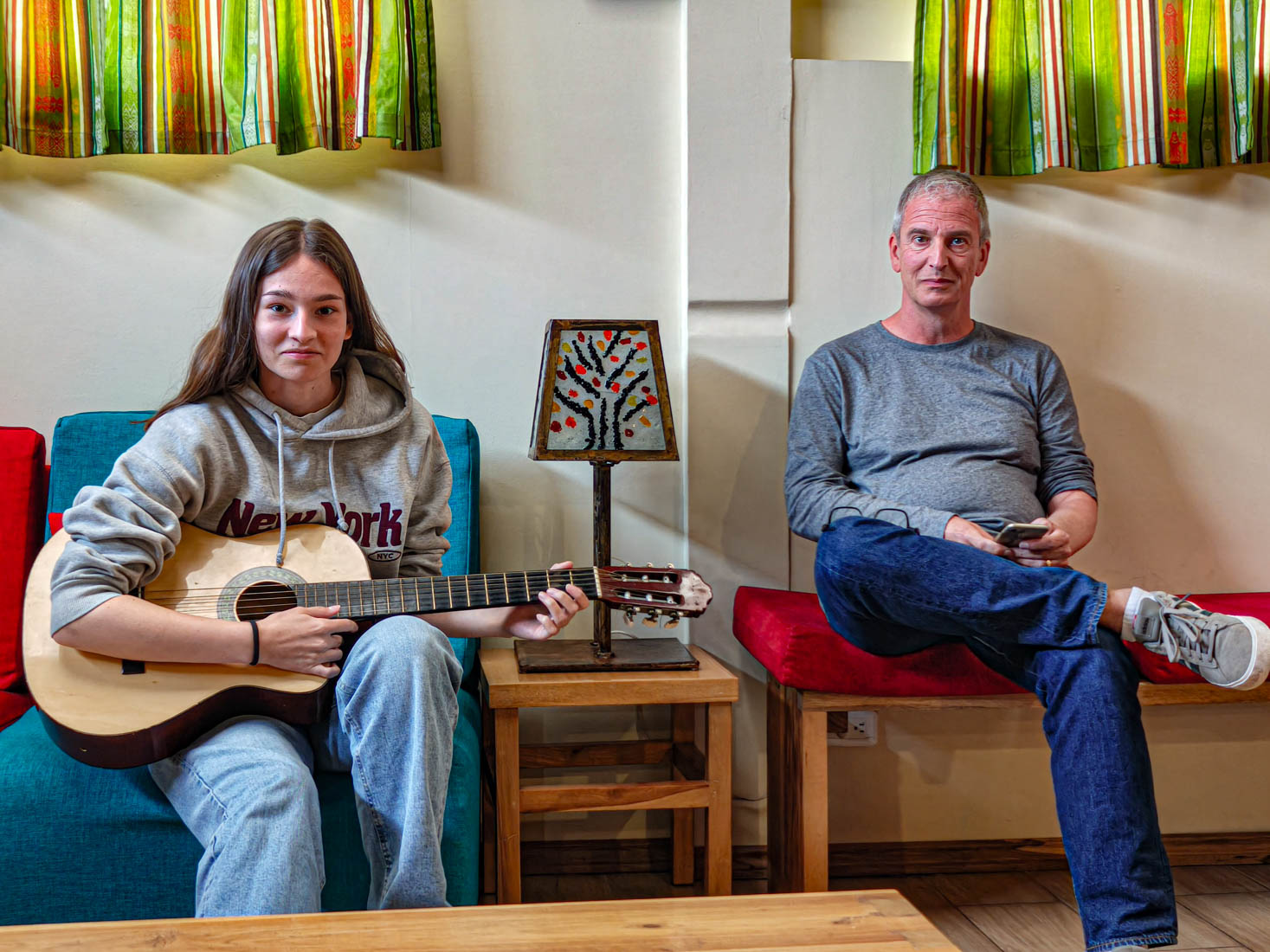 Er is een gezellige “woonkamer” waar de muzikale geesten gitaar mogen spelen