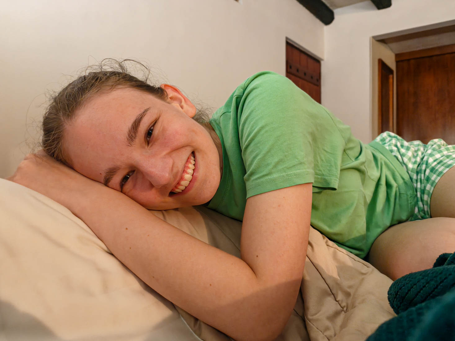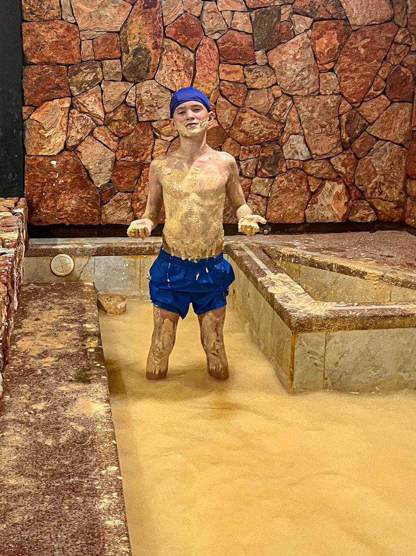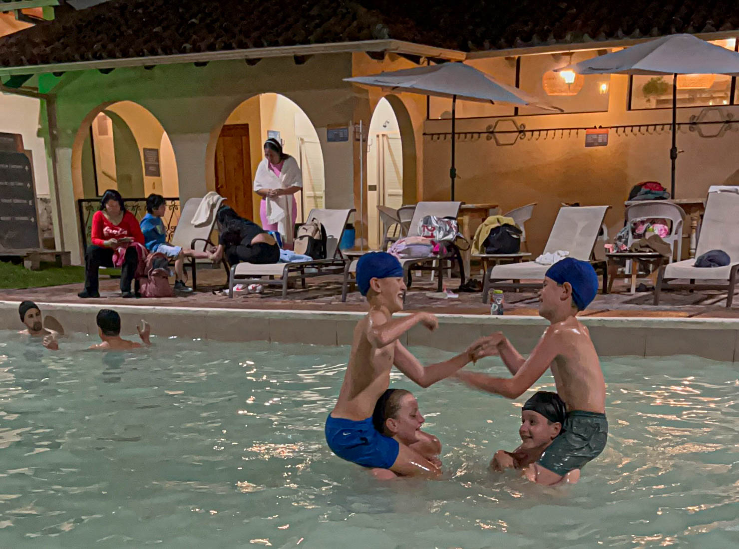 We eten in het hotel, terwijl de kids zich uitleven in het zwembad en in het