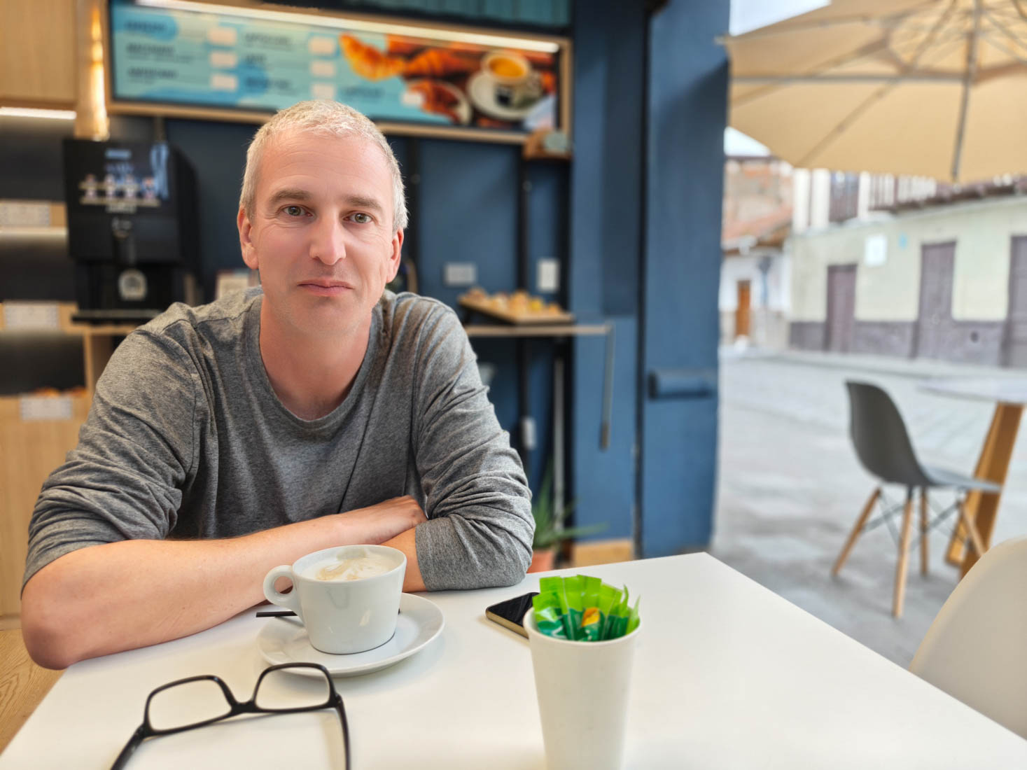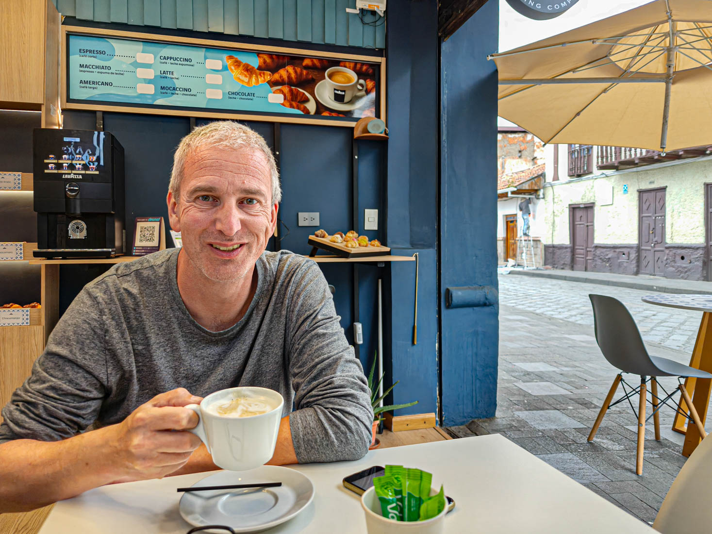 We gaan een koffie drinken in >een absurd westers uitziend barretje. De