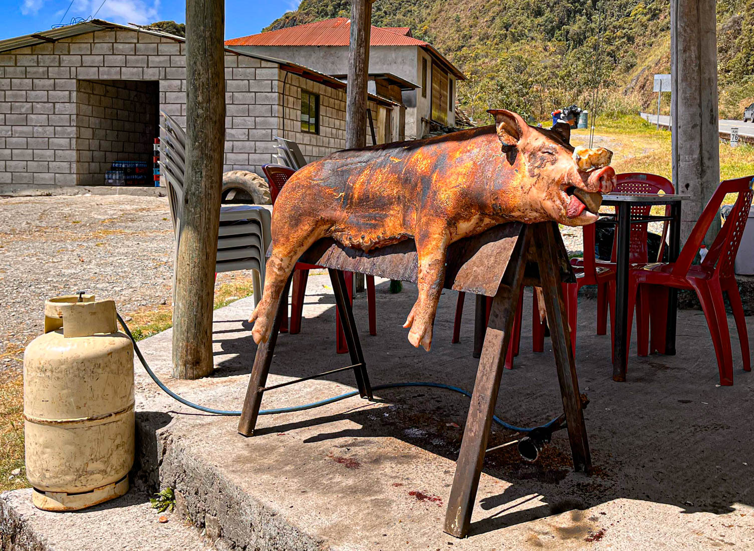 Op de parking van het restaurant wordt een varken gegrilld. Voor sommige