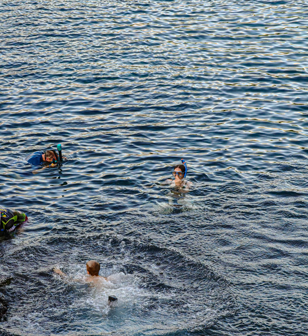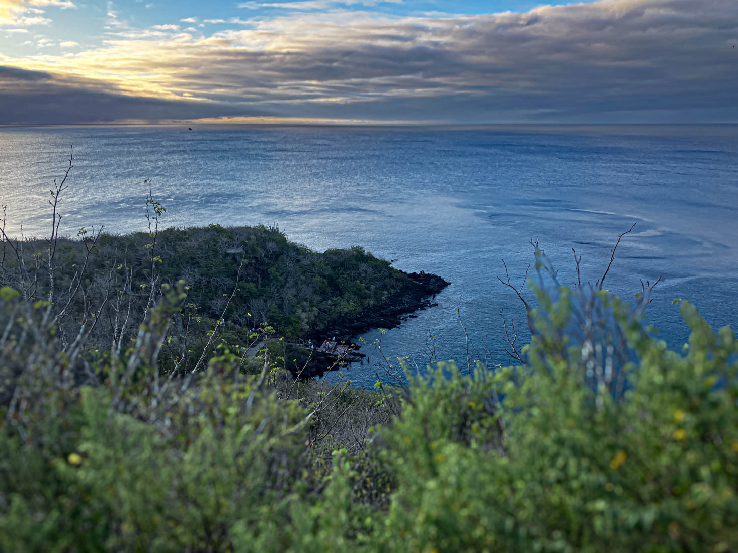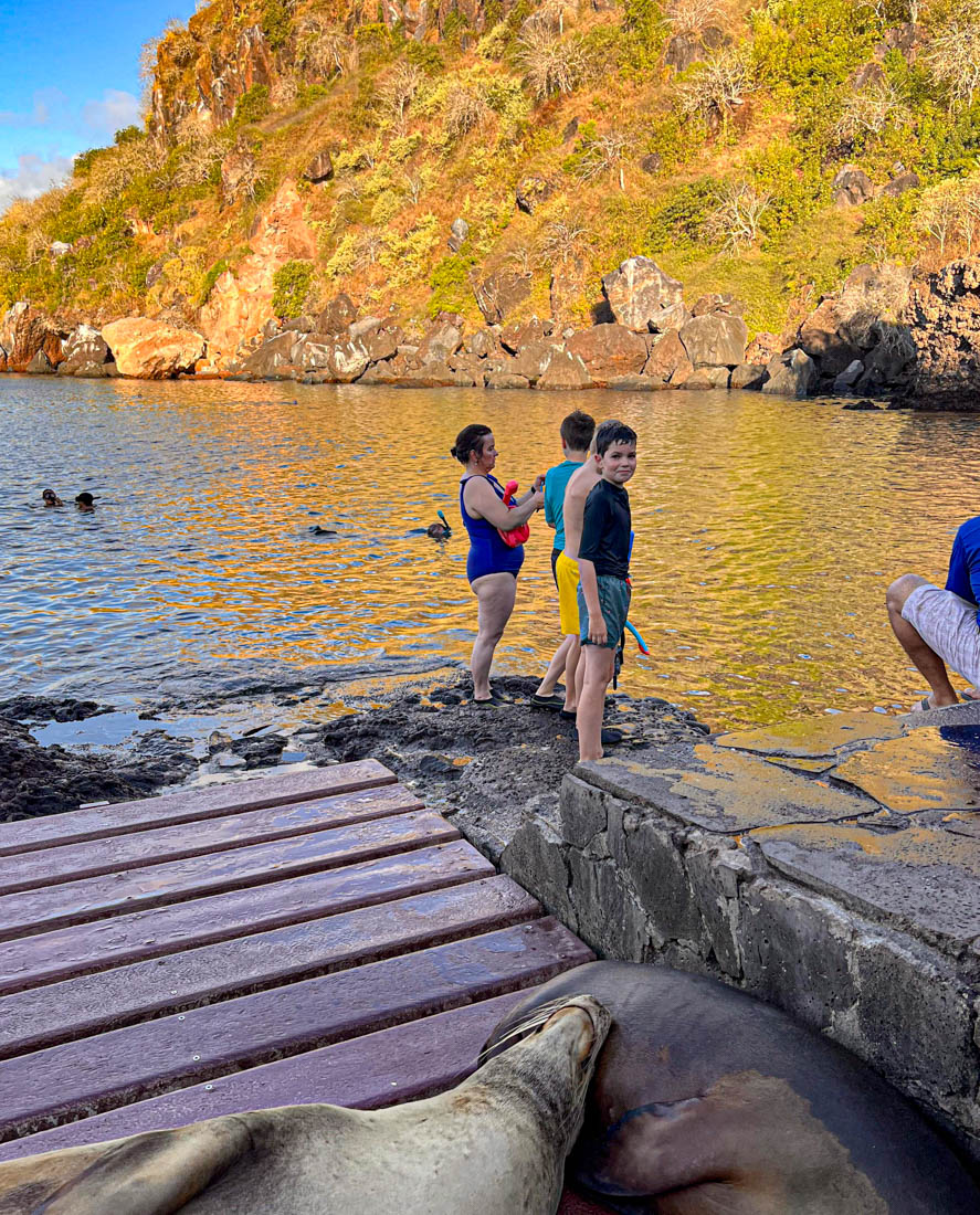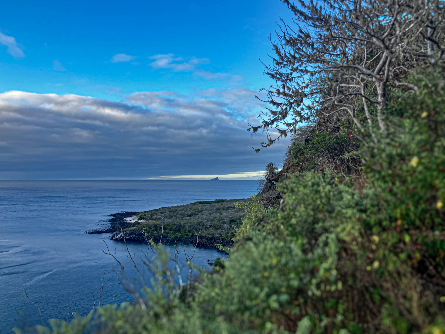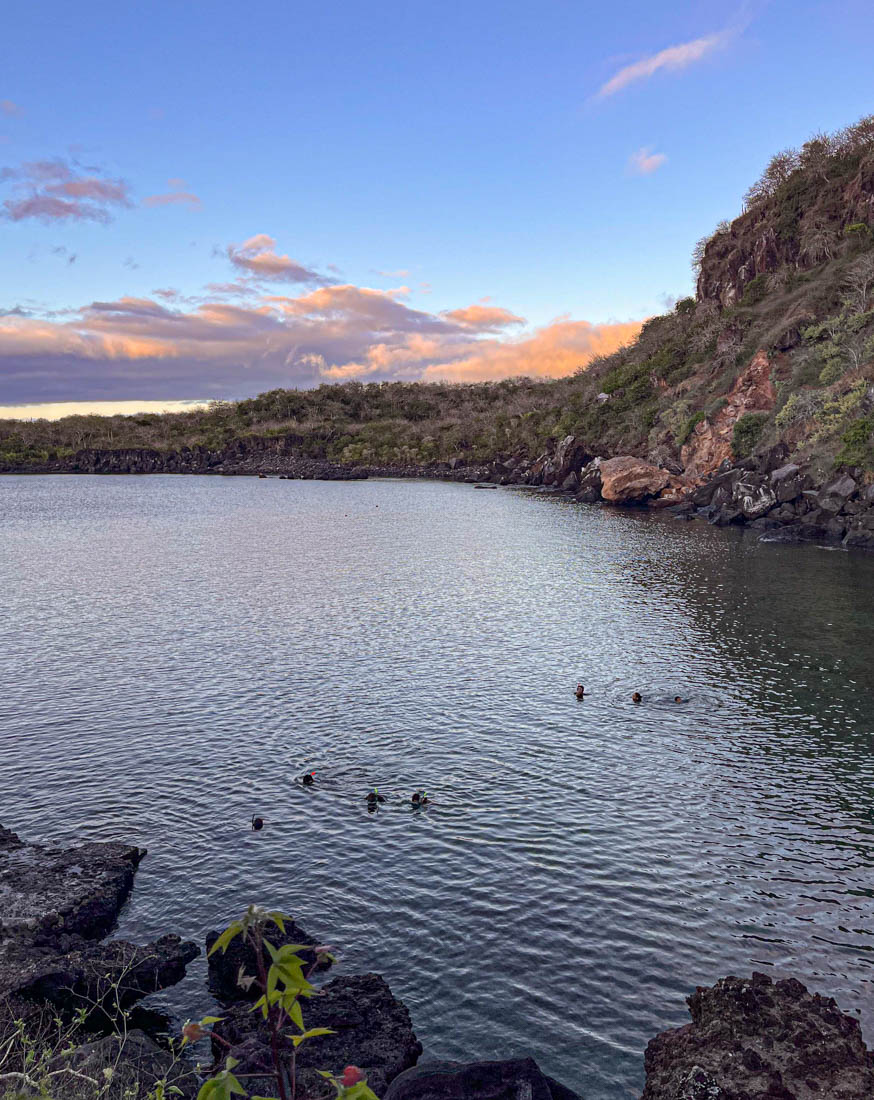 We zien veel verschillende vogels maar geen fregatvogels. We lopen verder naar een kleine baai waar men kan snorkelen en zwemmen.