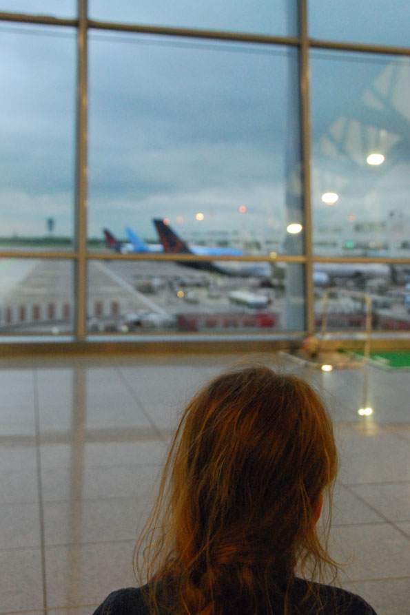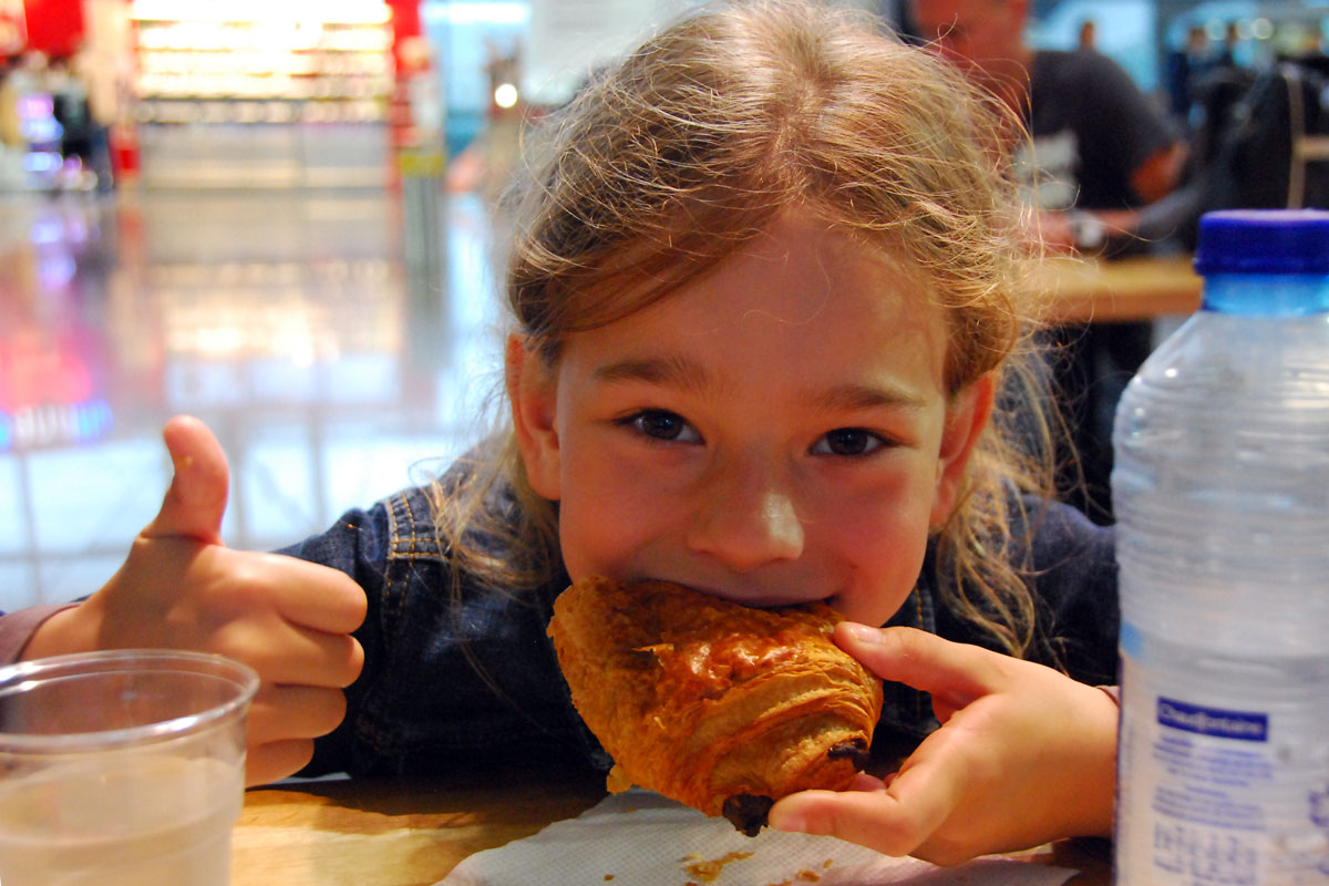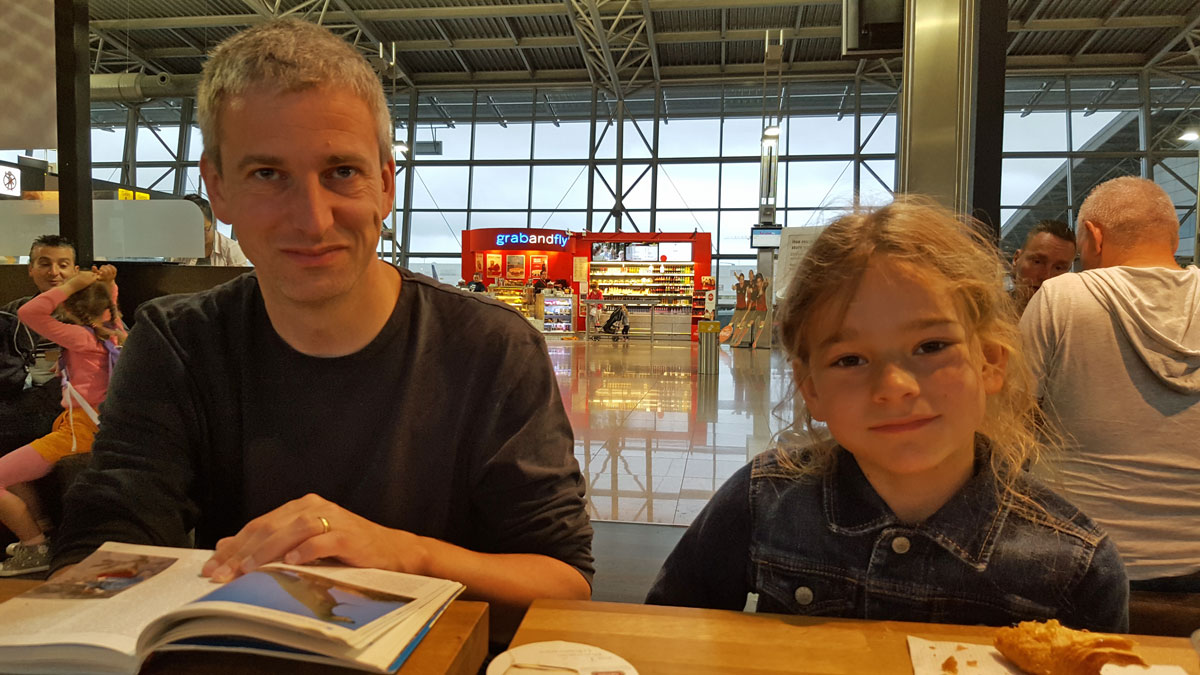 We vinden onze reizigers 's ochtends vroeg terug op de luchthaven... We gaan snel door security en genieten daarna een lekker ontbijtje.