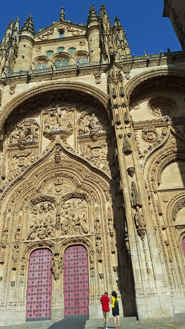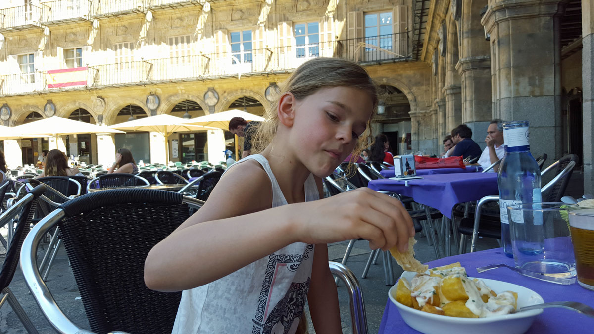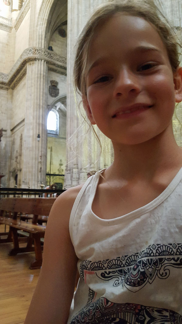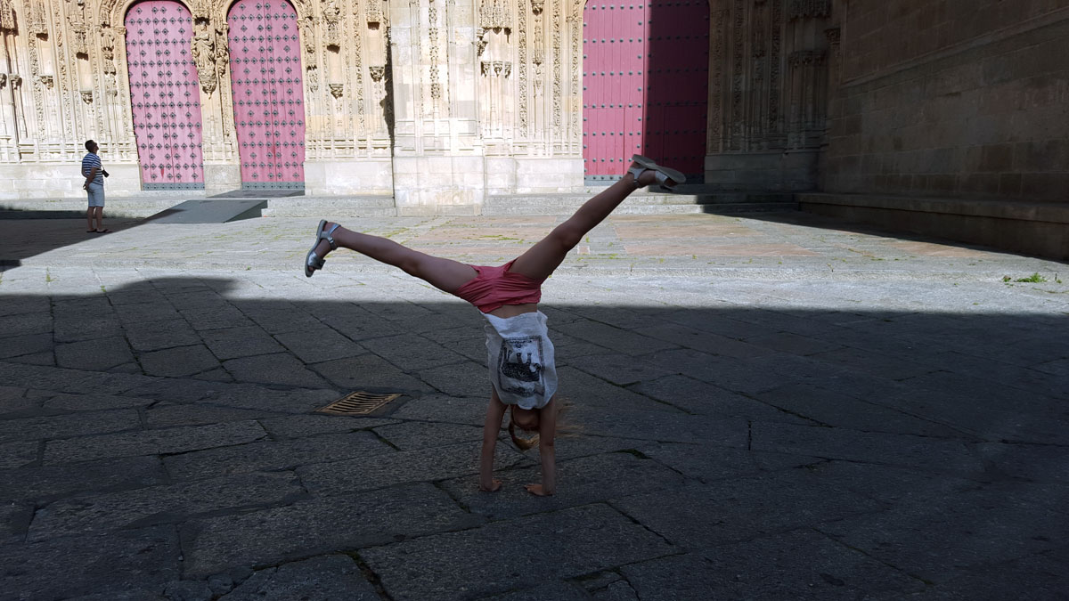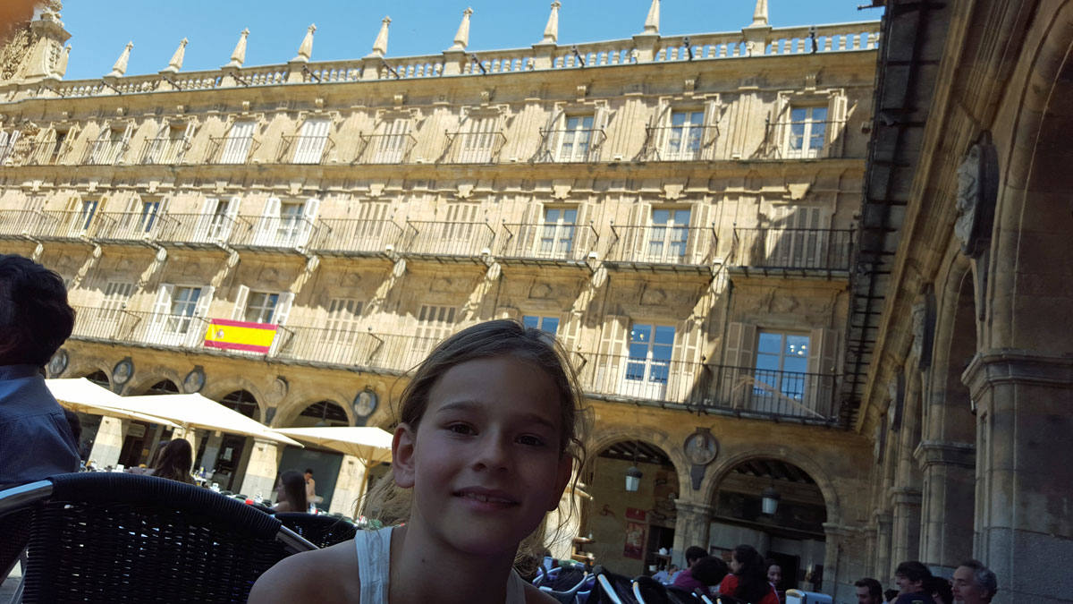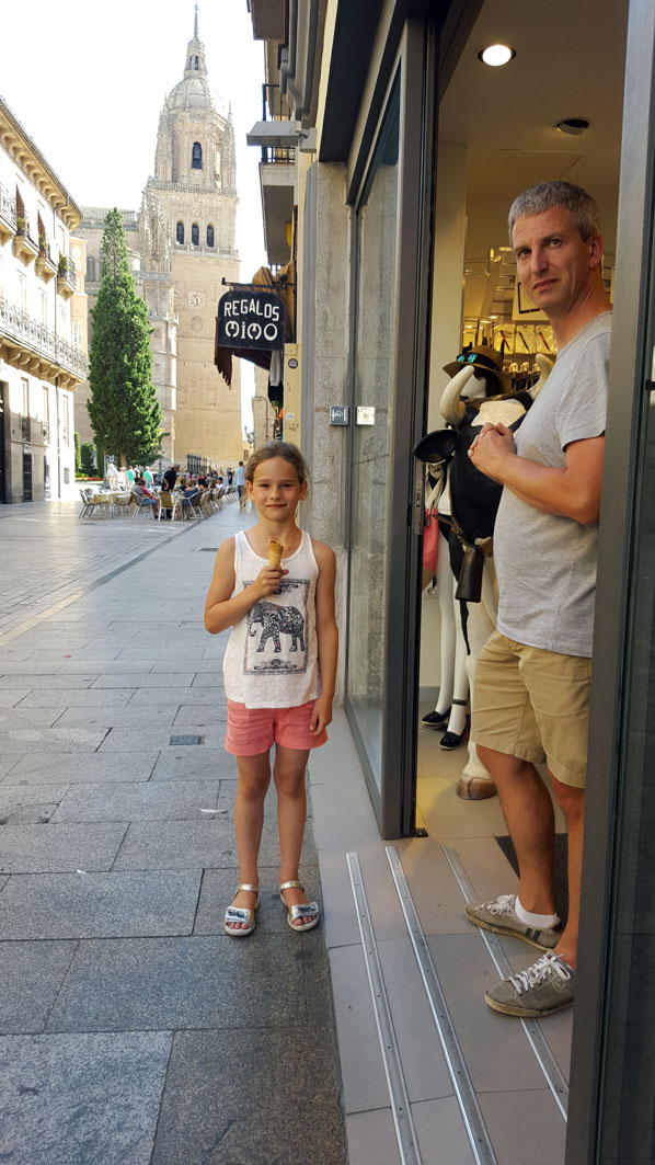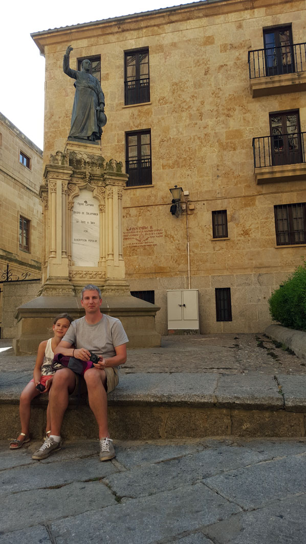 Tegen de avond komen we aan in Salamanca. Het hotel wordt al meteen positief beoordeeld door Julia. Na een uitgebreide fotosessie in de badkamer gaan we de wondermooie stad verkennen.